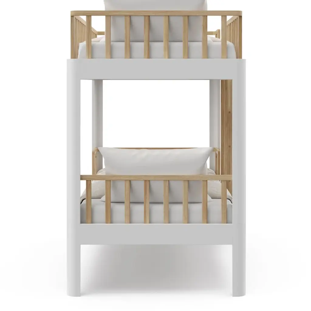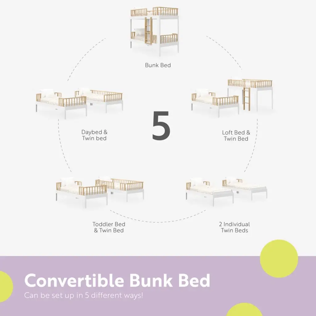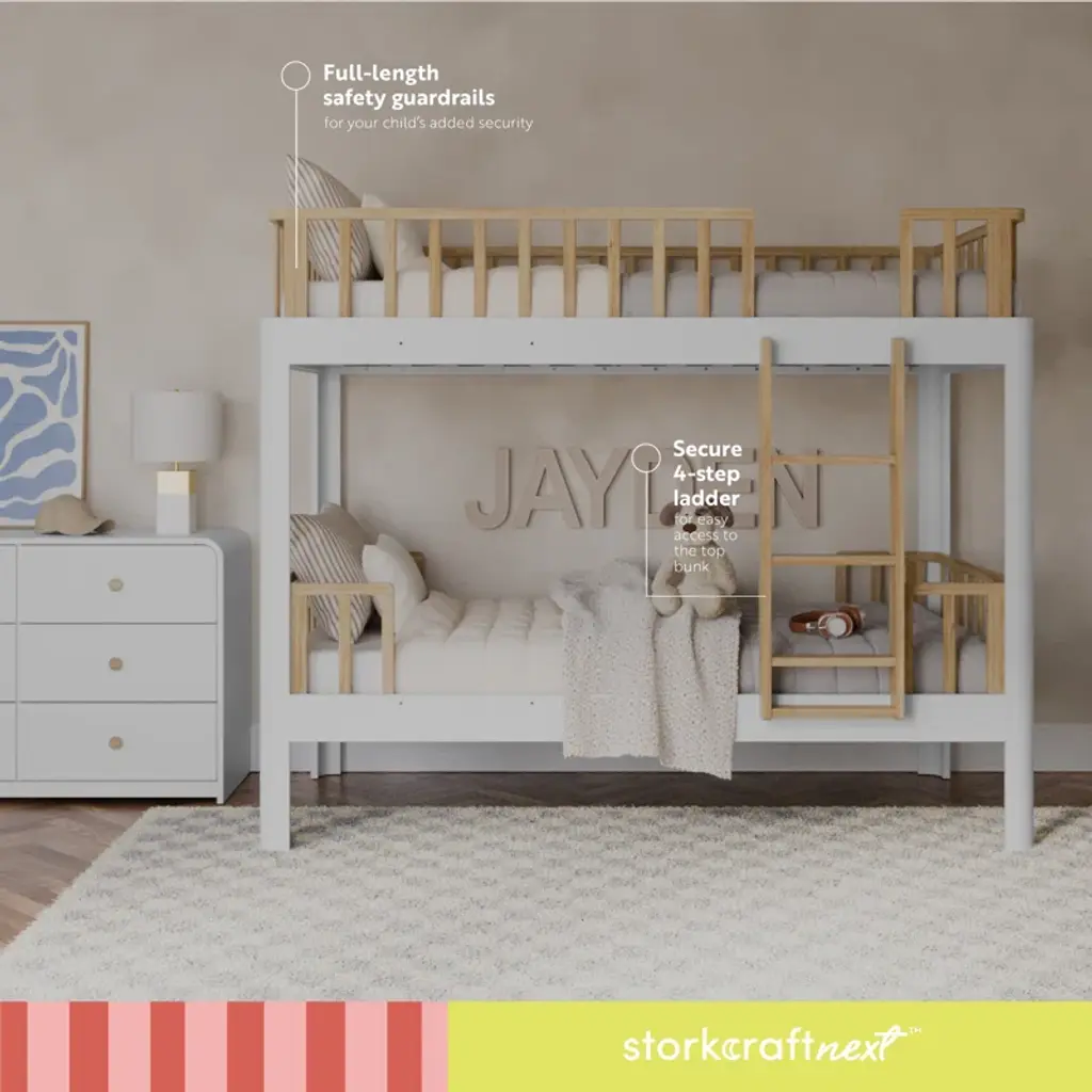 Our most premium bunk bed ever: introducing the incredibly capable (and stylish) Storkcraft Next Santos Twin-Over-Twin 5-in-1 Convertible Bunk Bed, by Storkcraft. From Storkcraft—makers of quality nursery furniture since 1945—the Santos is part of the Storkcraft Next line of kids bedroom furniture. The Santos can be set up in 5 different ways: (1) a twin-over-twin bunk bed; (2) two individual twin beds; (3) a twin loft bed and twin bed; (4) a toddler bed and twin bed; (5) a daybed and twin bed. For your complete bedroom set, complete the Storkcraft Next Santos Collection with the matching Storkcraft Santos 3-in-1 Convertible Crib, Storkcraft Next 6 Drawer Dresser, and Storkcraft Next Santos 2 Drawer Nightstand. The Storkcraft Next Santos Twin-over-Twin 5-in-1 Convertible Bunk Bed is GREENGUARD Gold Certified – certified products are screened for more than 10,000 chemicals and VOCs known to pollute indoor air. The Santos Bunk Bed is crafted with rubberwood solids and engineered wood, and its applied finish has been tested to meet or exceed the applicable ASTM and CPSIA safety standards. Exclusively from Storkcraft® — makers of quality nursery and kids bedroom furniture since 1945, and North America’s longest-standing name in baby cribs. Storkcraft® is the proud recipient of the Parent Tested Parent Approved (PTPA) Seal of Approval for nursery and children’s bedroom furniture. Assembly required. Mattresses not included.