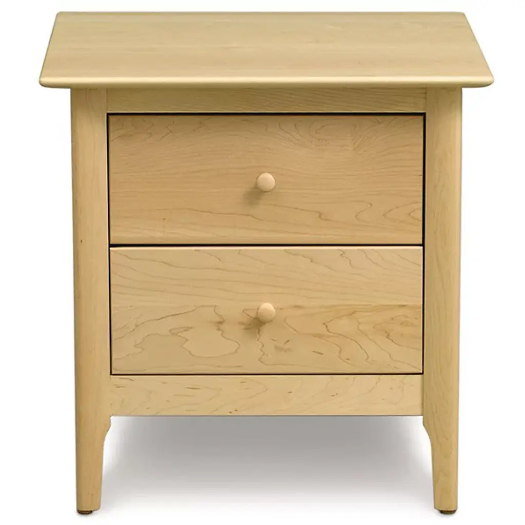 Exceptional function in a compact frame. The Copeland Furniture Sarah 2 Drawer Nightstand finds elegance in its simplicity, offering useful storage and understated style. The drawers make up the bulk of the body, resting on stout legs and giving the structure a box-like shape. Adjustable drawer glides enhance the piece’s utility, allowing for quick access to your frequently used items. While the nightstand has a reserved look, Solid Hardwood brings an unmistakable natural appeal to the exterior, with knots and burls accenting the body. A slight structure with incomparable convenience, the nightstand matches obvious function with subtle fashion and meets all the needs you could expect from a bedside table.