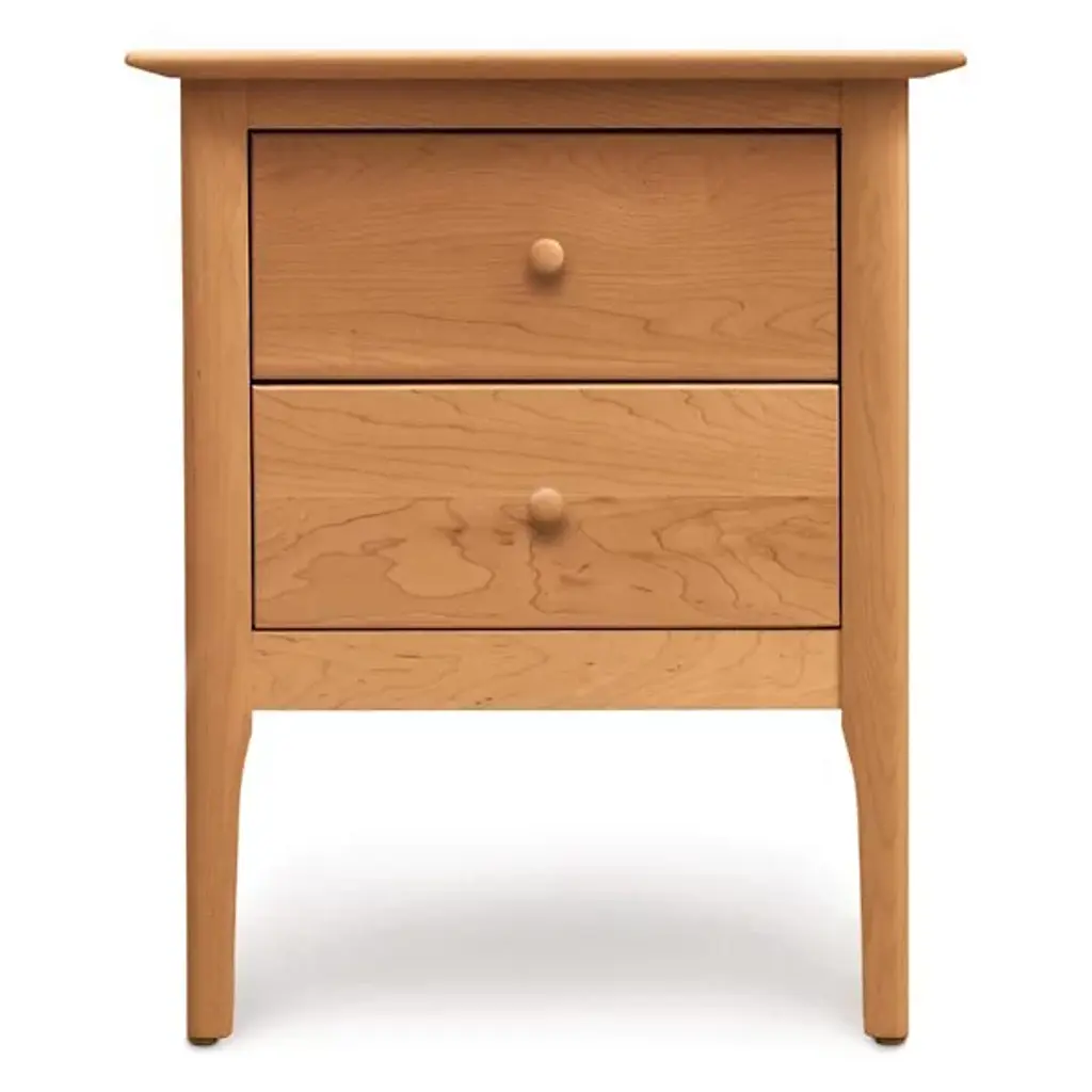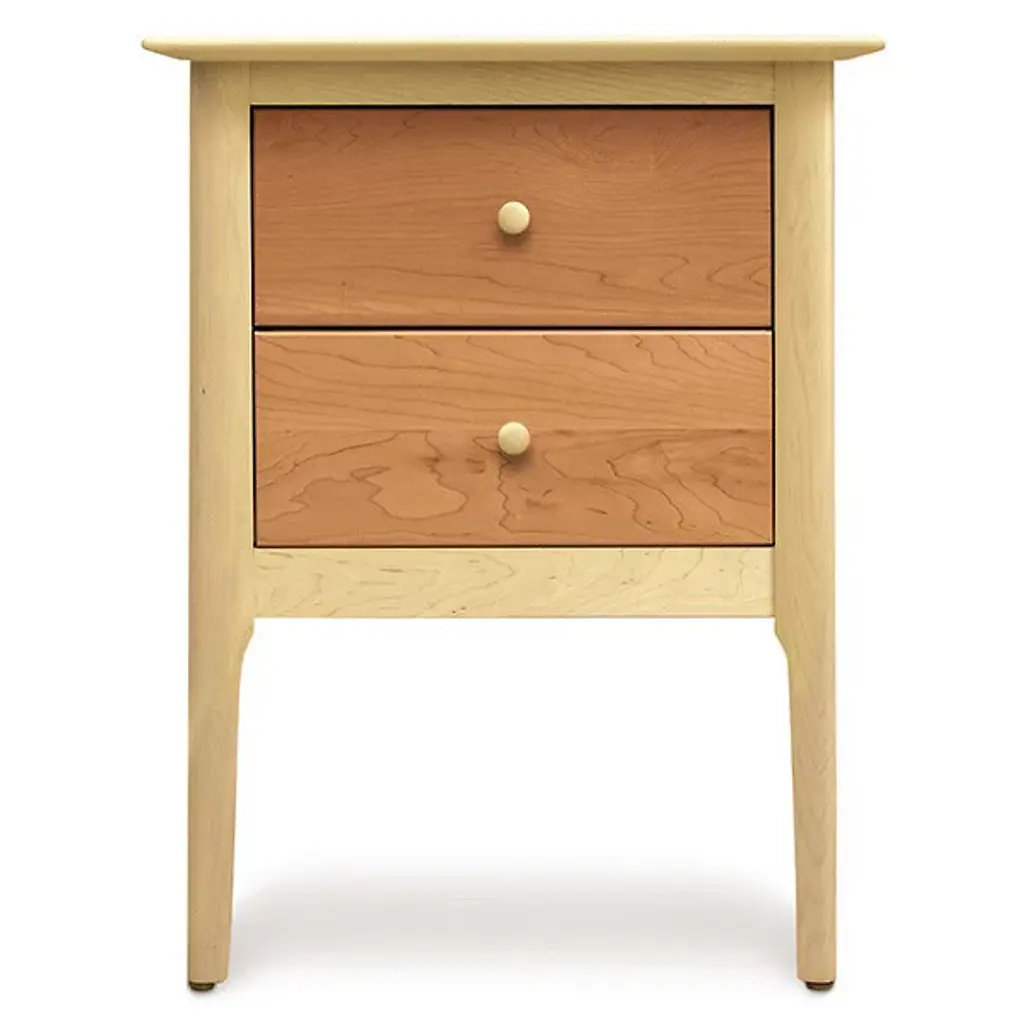 Exceptional function in a compact frame. The Copeland Furniture Sarah 2 Drawer Nightstand finds elegance in its simplicity, offering useful storage and understated style. The drawers make up the bulk of the body, resting on stout legs and giving the structure a box-like shape. Adjustable drawer glides enhance the piece’s utility, allowing for quick access to your frequently used items. While the nightstand has a reserved look, Solid Hardwood brings an unmistakable natural appeal to the exterior, with knots and burls accenting the body. A slight structure with incomparable convenience, the nightstand matches obvious function with subtle fashion and meets all the needs you could expect from a bedside table.