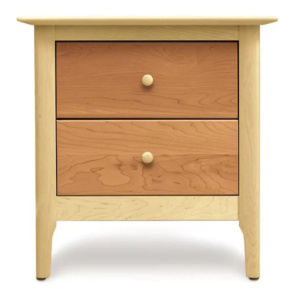 Exceptional function in a compact frame. The Copeland Furniture Sarah 2 Drawer Nightstand finds elegance in its simplicity, offering useful storage and understated style. The drawers make up the bulk of the body, resting on stout legs and giving the structure a box-like shape. Adjustable drawer glides enhance the piece’s utility, allowing for quick access to your frequently used items. While the nightstand has a reserved look, Solid Hardwood brings an unmistakable natural appeal to the exterior, with knots and burls accenting the body. A slight structure with incomparable convenience, the nightstand matches obvious function with subtle fashion and meets all the needs you could expect from a bedside table.