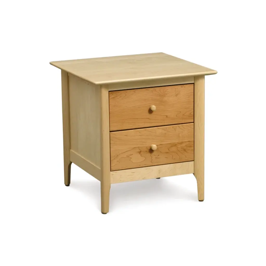 Exceptional function in a compact frame. The Copeland Furniture Sarah 2 Drawer Nightstand finds elegance in its simplicity, offering useful storage and understated style. The drawers make up the bulk of the body, resting on stout legs and giving the structure a box-like shape. Adjustable drawer glides enhance the piece’s utility, allowing for quick access to your frequently used items. While the nightstand has a reserved look, Solid Hardwood brings an unmistakable natural appeal to the exterior, with knots and burls accenting the body. A slight structure with incomparable convenience, the nightstand matches obvious function with subtle fashion and meets all the needs you could expect from a bedside table.