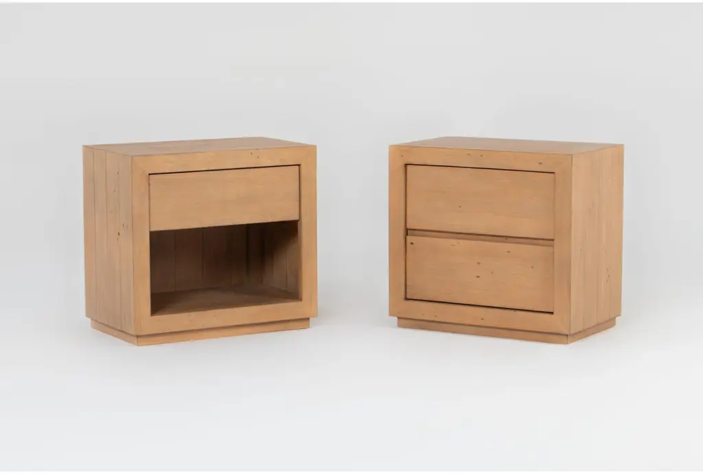 Introducing the Satori Natural Wood 1-Drawer Nightstands with USB Set of 2, a rustic addition to your bedroom. These nightstands, crafted from solid reclaimed pine, offer both style and functionality with their natural characteristics and built-in USB ports. Perfect for any bedside, these nightstands embody a minimalistic design while providing ample storage space.