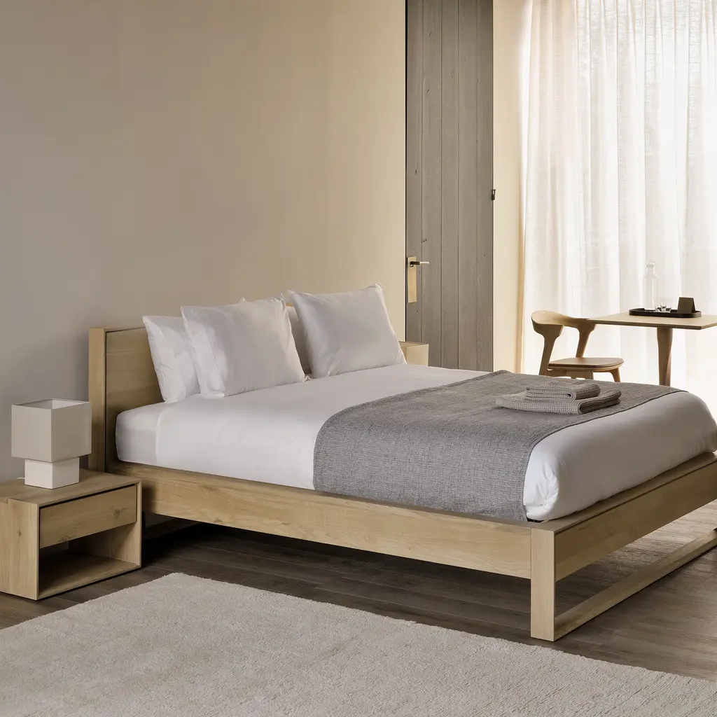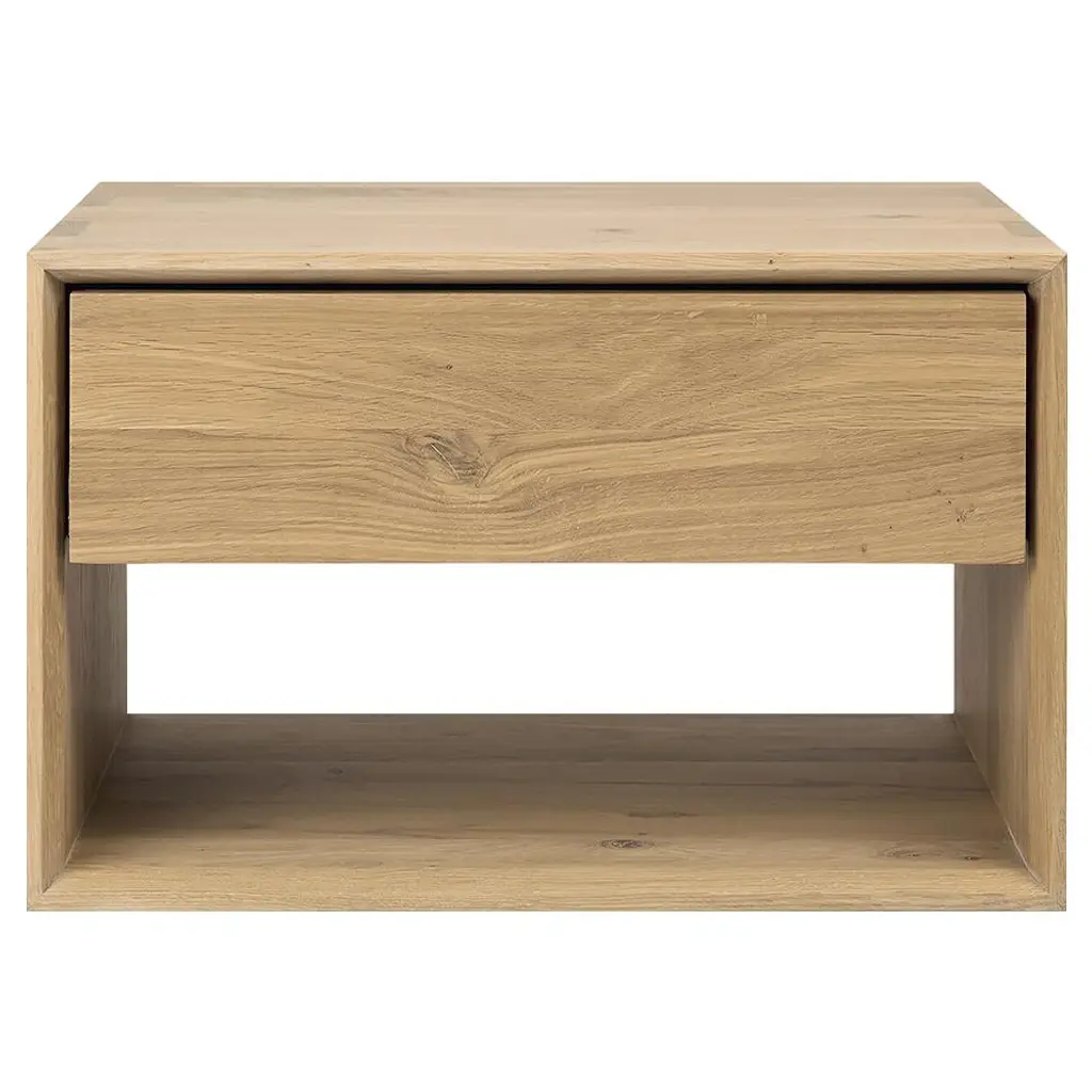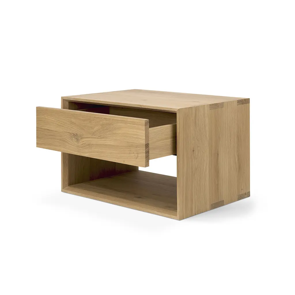 A perfect addition to any bedroom, this Scandinavian bedside table is elegant and simple. Part of the Ethnicraft furniture range, the Nordic Nightstand draws inspiration from the refined minimalism of Scandinavian design. It boasts a rectangular shape with right angles for a clean, polished look. One push-open drawer offers room for a variety of items. On top, you can place anything from an alarm clock, a water glass, a book, or a lamp. This Scandinavian bedside table comes in two versions: standing and wall-mounted. The latter comes with hanging hardware included. Both options are made from solid oak with a hardwax oil finish to bring more warmth to your bedroom decor.