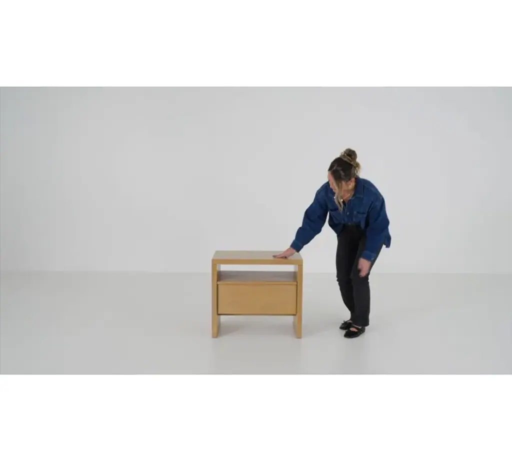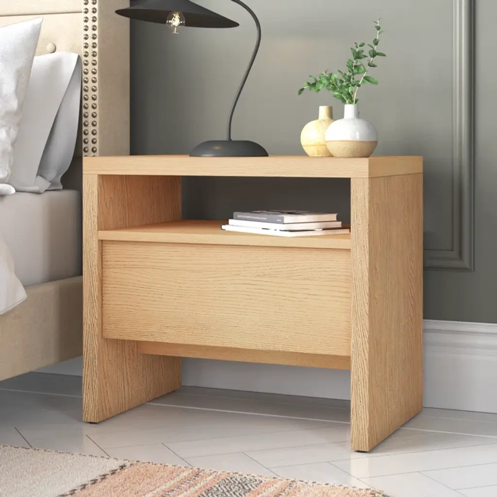 This nightstand combines minimalist design with functional storage. Crafted from wood. It features a sleek, angled silhouette. The spacious drawer blends seamlessly into the design, perfect for storing and tucking away essentials. An open shelf offers space for your books, while the top holds a lamp, picture frame, and decor. Bonus: The finished back allows you to place it wherever you like.