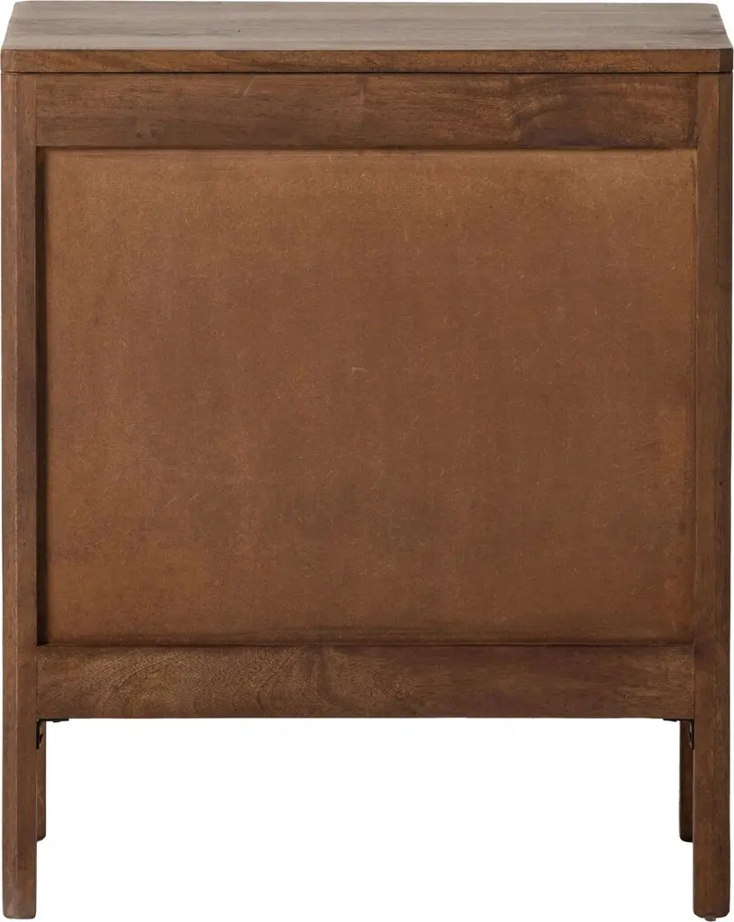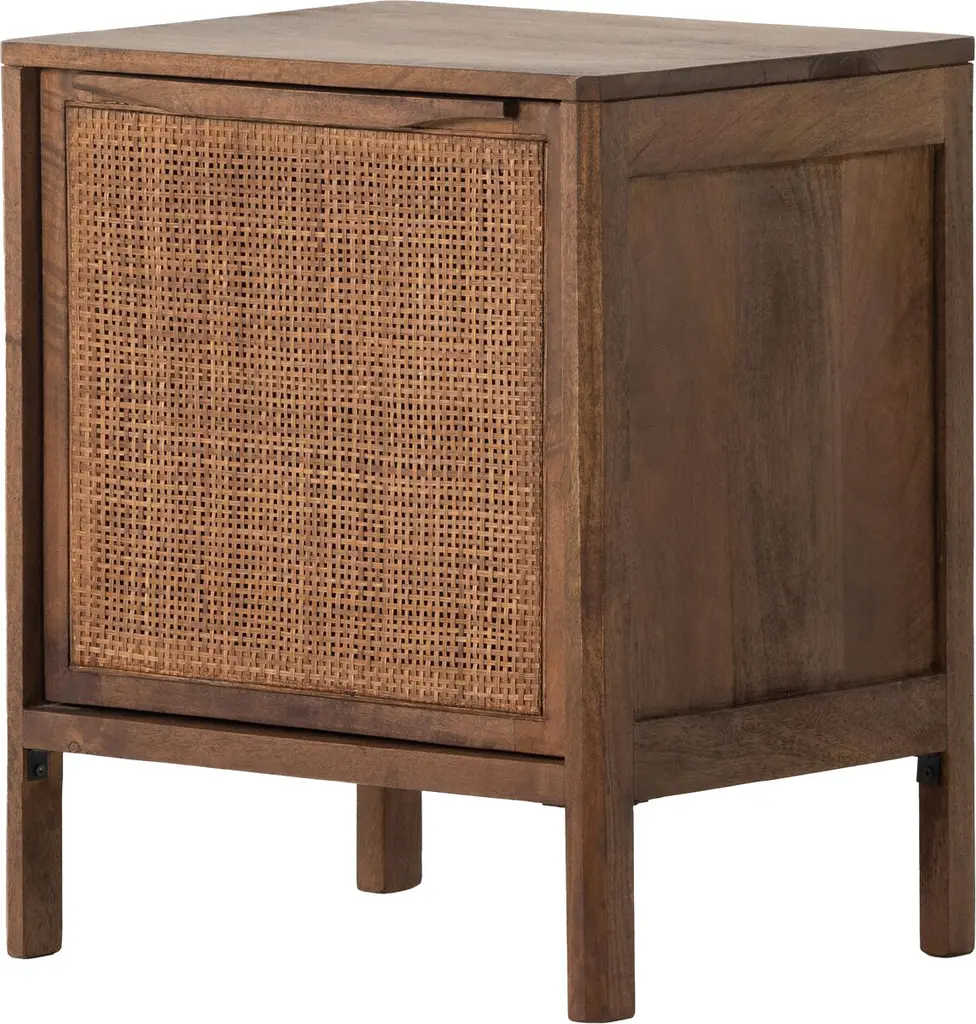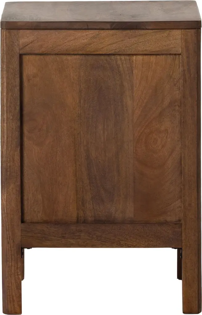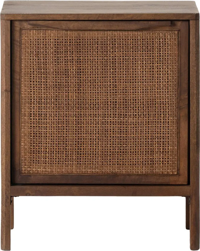 The woven-cane door provides a textural complement to this nightstand's durable mango-wood frame. The warm brown finish ensures timeless sophistication. Behind the door, which is hinged on the left, is a removable shelf.