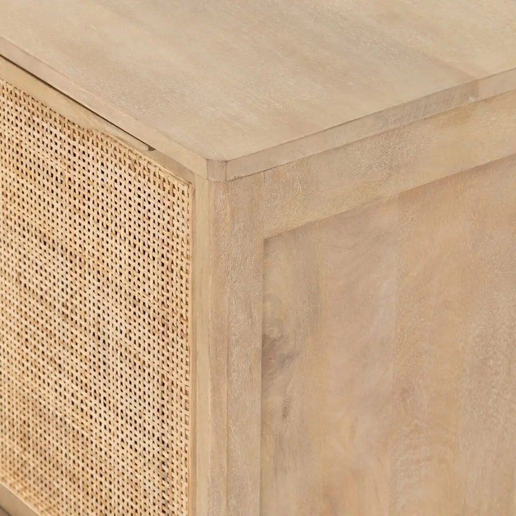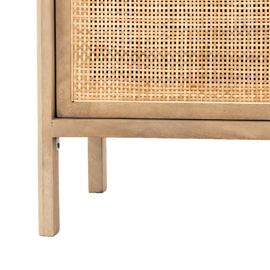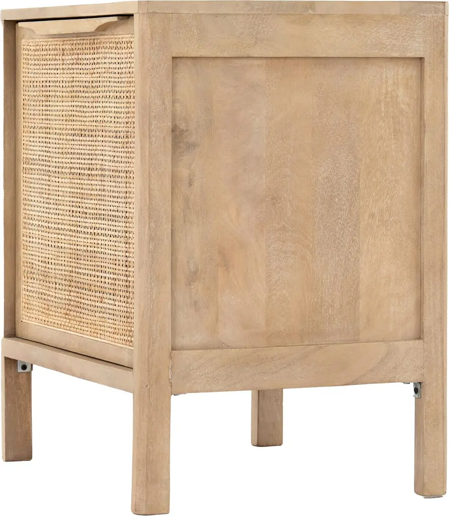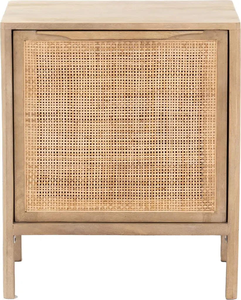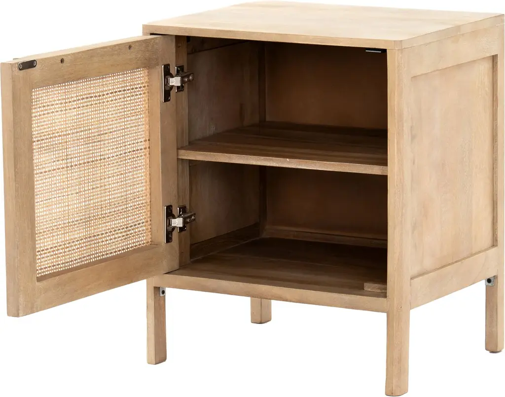 The woven-cane door provides a textural complement to this nightstand's durable mango-wood frame. The warm brown finish ensures timeless sophistication. Behind the door, which is hinged on the left, is a removable shelf.