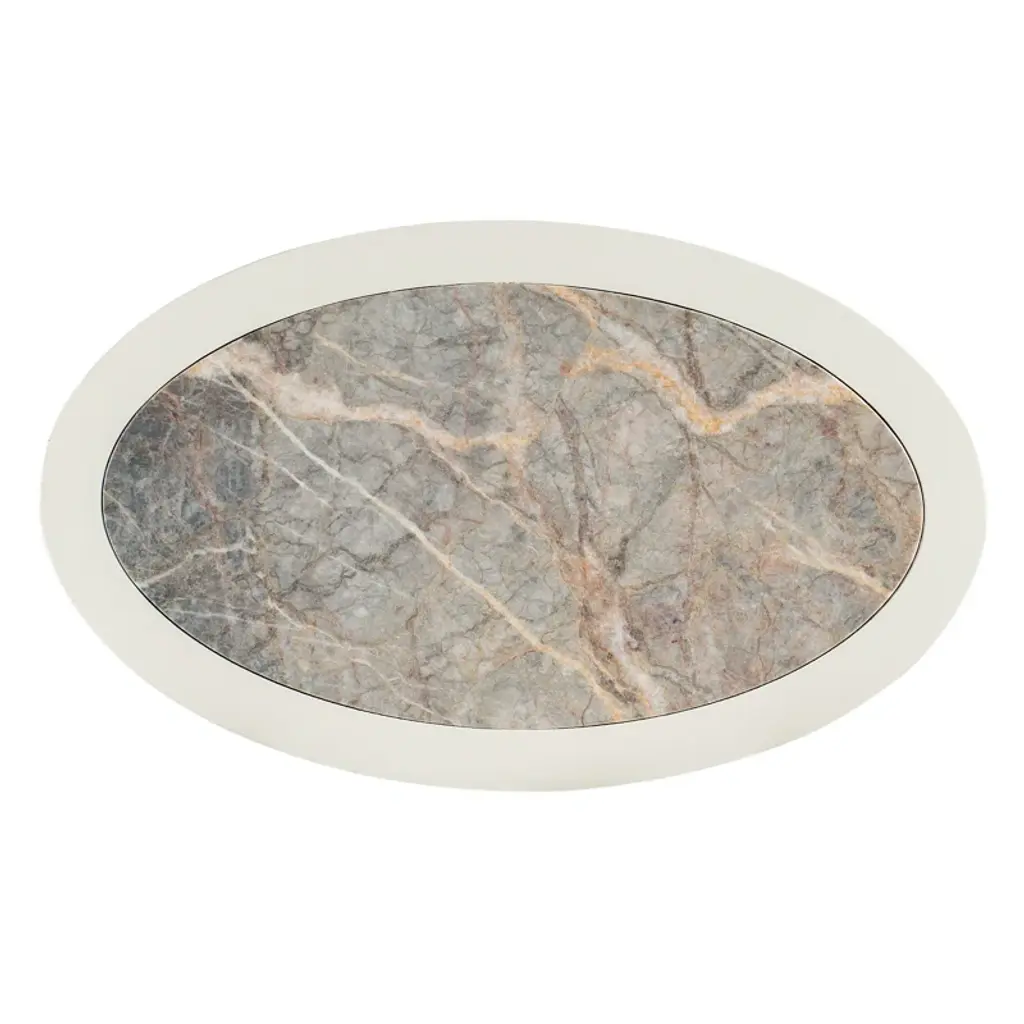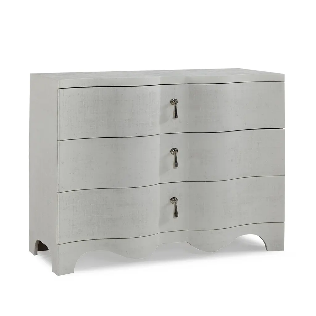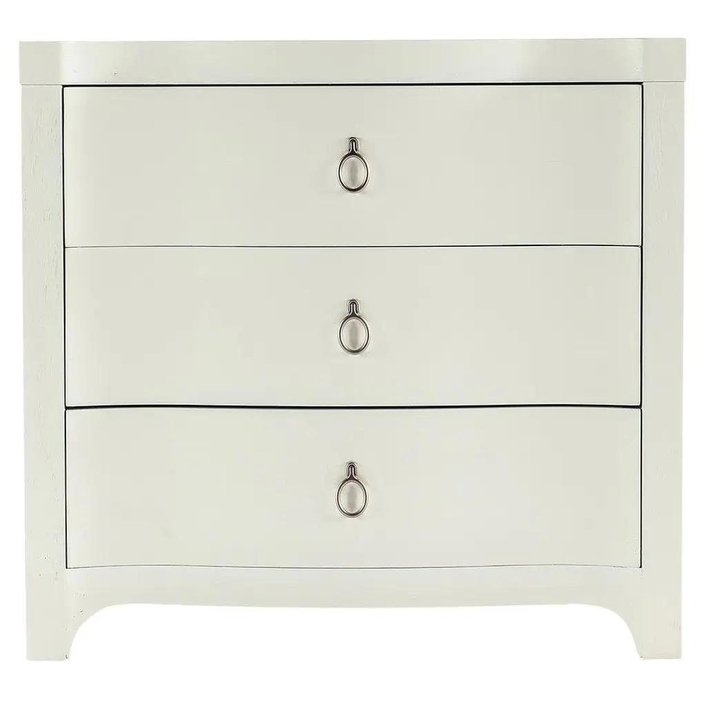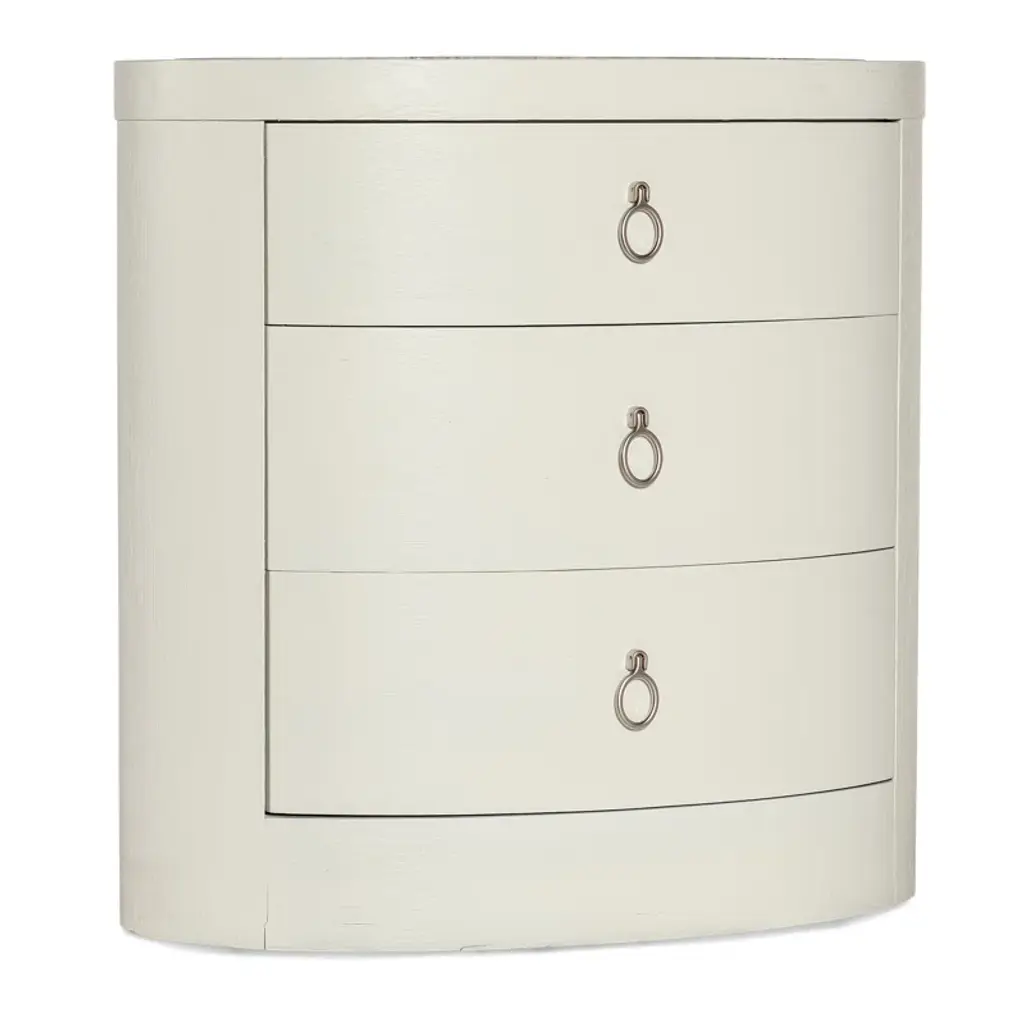 If you aspire to tranquil palettes and textures, the Serenity Wavecrest Oval Nightstand will bring the peacefulness of the outdoors inside with its light and airy soft textured shell white finish and honed marble top. Crafted of oak veneers, the exquisite nightstand has 3 drawers with soft-close drawer guides, a finished back, a USB charger with two ports, and light champagne decorative ring pulls. Designed to create a comfortable and inviting retreat within the home, the Serenity collection is defined by its casual finishes and variety of organic textures and materials that combine to deliver a relaxed aesthetic. Inspired by casual, waterfront living, the collection was designed to bring the relaxed aura of the outside in -- no matter where the consumer lives. White oak veneer delivers two key finishes – a whitewashed look and a weathered gray – and is accented with shades of soft coastal blue, sandblasted pine, and soft white bronze metal details. Organic materials including abaca rope, natural stone, painted grass cloth, louvered details, and faux coral motifs add to its casual style. The collection’s silhouettes were designed to reflect three distinct personalities – a traditional nature with serpentine-shaped case pieces and a softer aesthetic, a modern persona with linear shapes and coral accents, as well as a more casual contemporary character with soft-edged case pieces and organic surfaces.