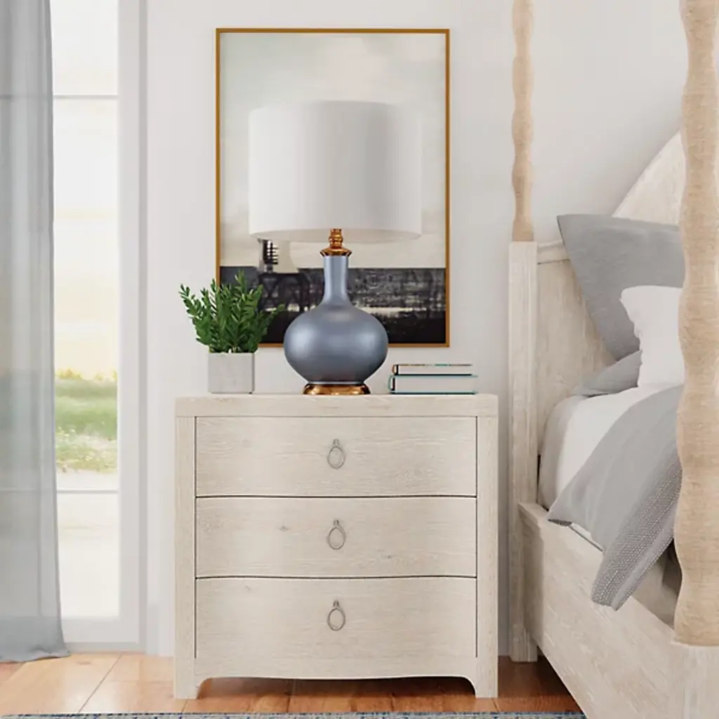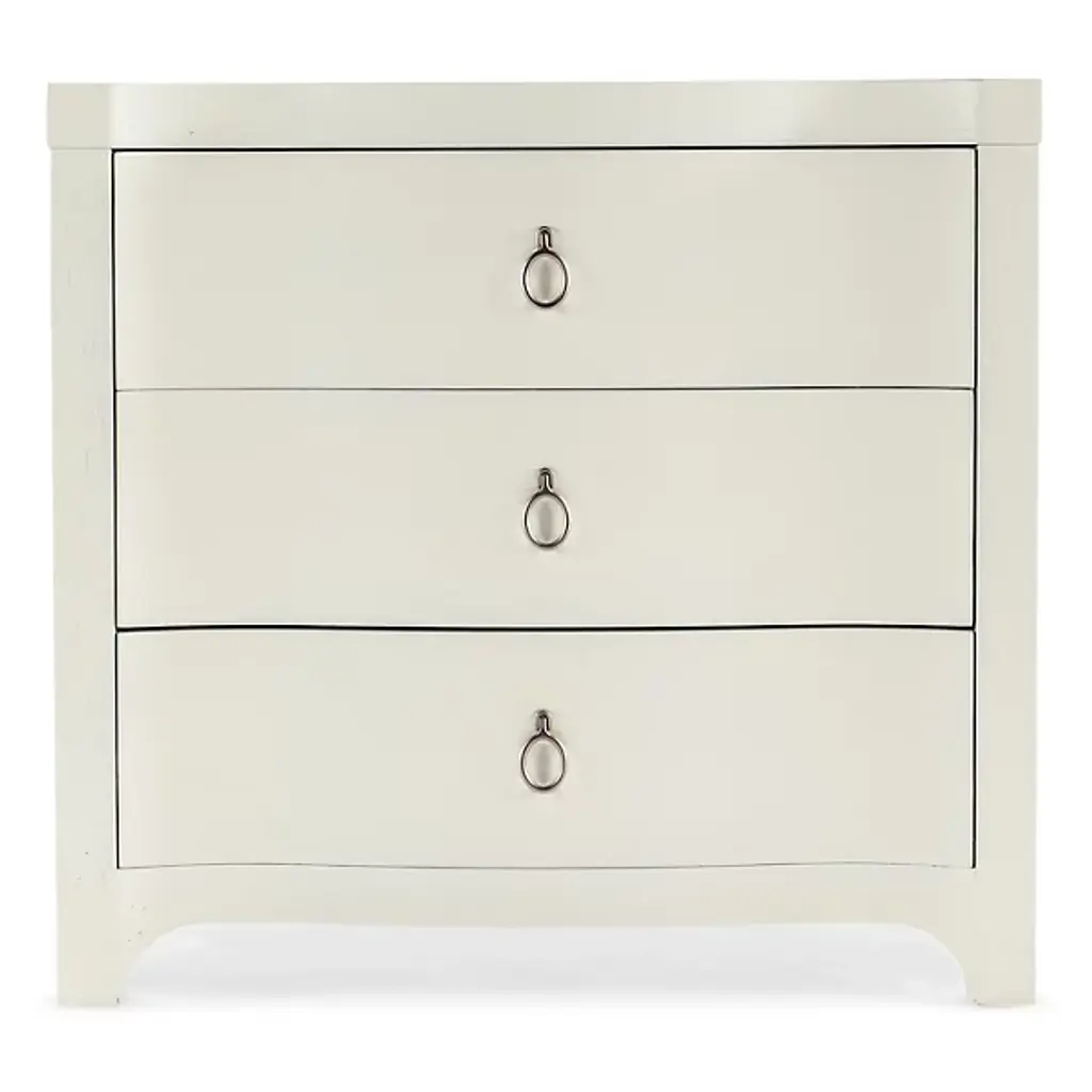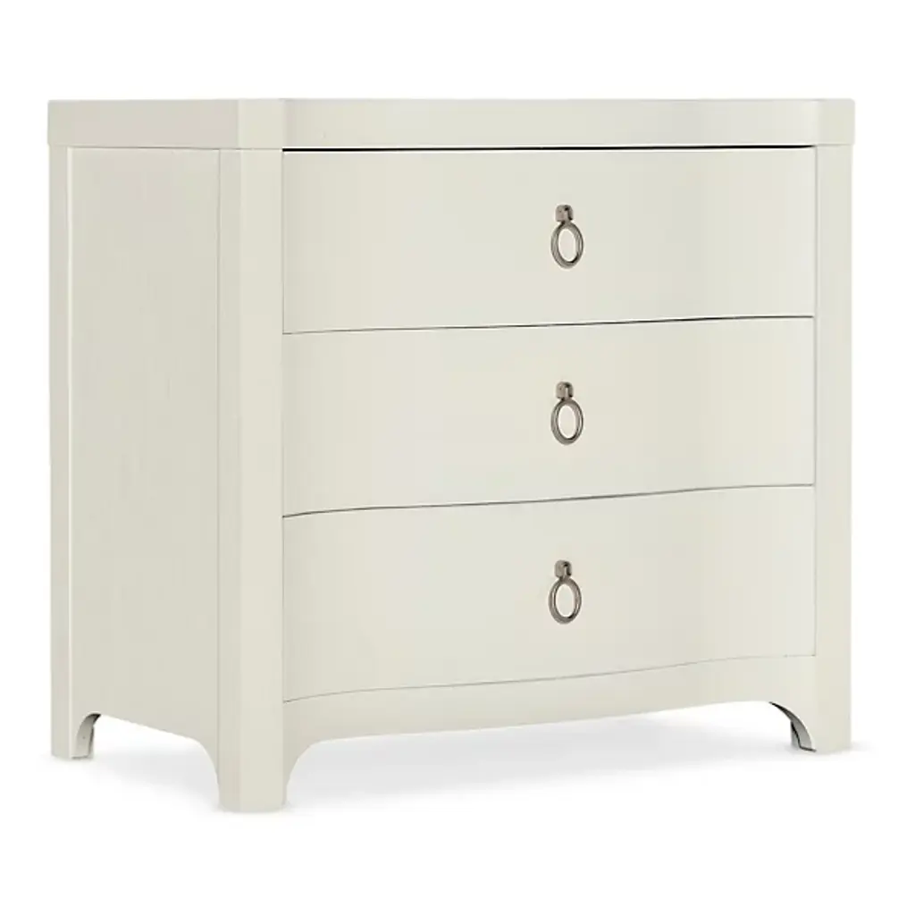 The Serenity Antigua Nightstand from Hooker Furniture brings peacefulness in a crisp, clear silhouette to the bedroom. Inspired by the tranquility of waterfront living, it complements its relaxed aesthetic with soft-close drawers to prevent loud banging, and light, champagne decorative ring pulls add functionality and a designer touch. A cord clip on the back and a USB charger with two ports accommodate modern needs and make it easy to keep electronics charged.