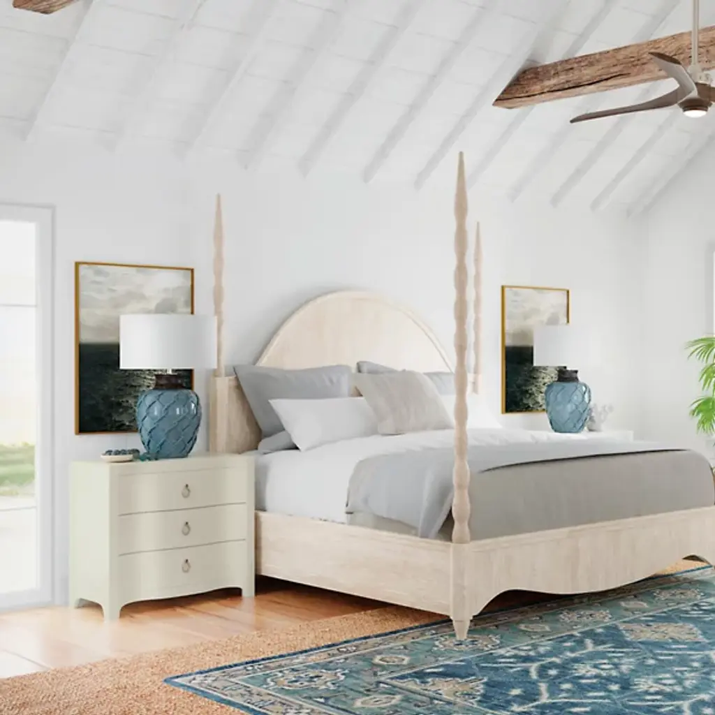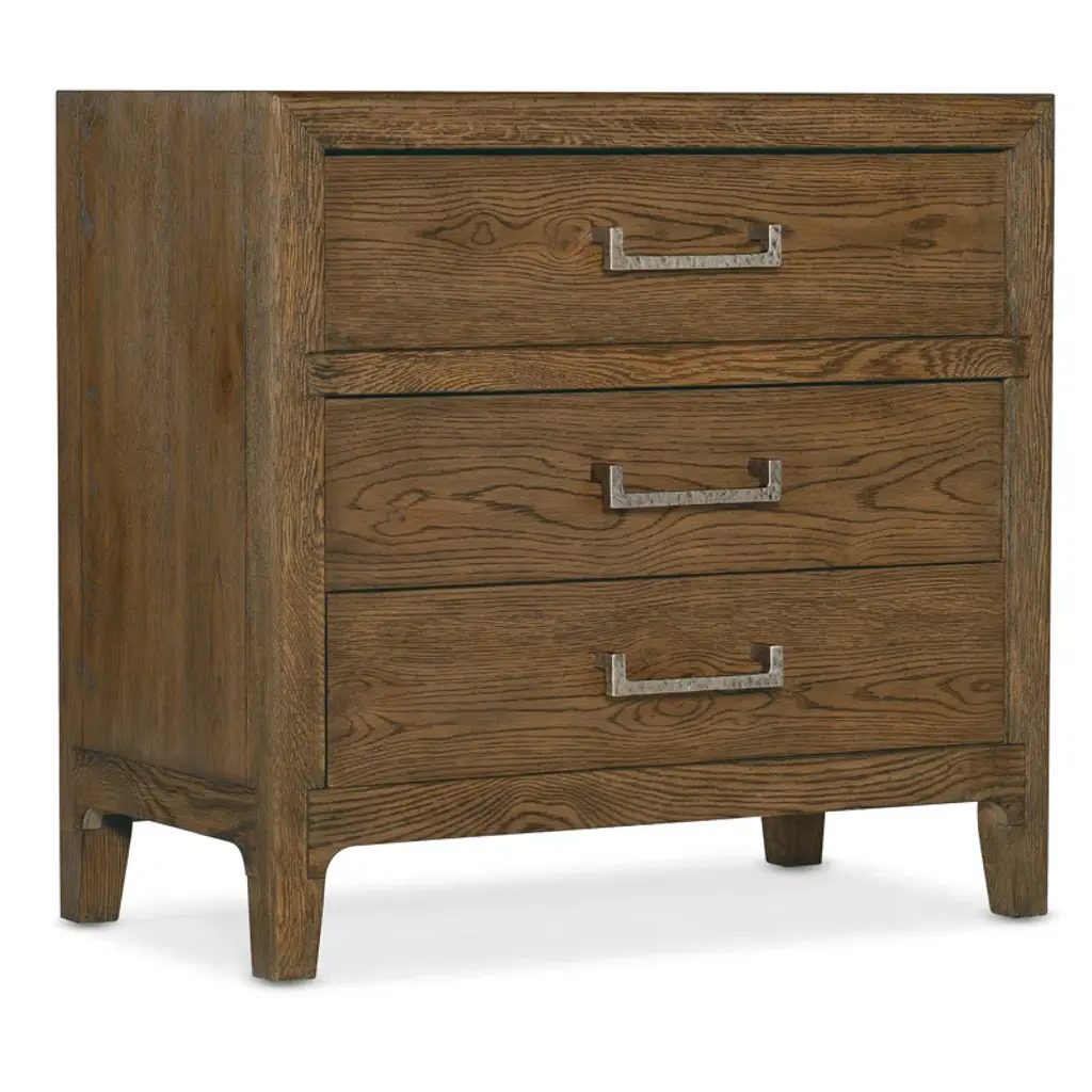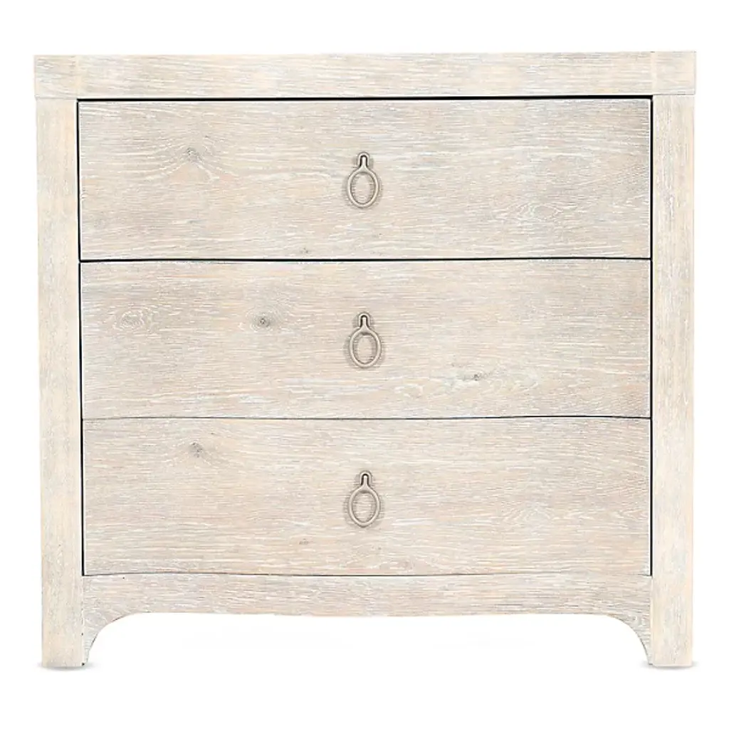 The Serenity Antigua Nightstand from Hooker Furniture brings peacefulness in a crisp, clear silhouette to the bedroom. Inspired by the tranquility of waterfront living, it complements its relaxed aesthetic with soft-close drawers to prevent loud banging, and light, champagne decorative ring pulls add functionality and a designer touch. A cord clip on the back and a USB charger with two ports accommodate modern needs and make it easy to keep electronics charged.
