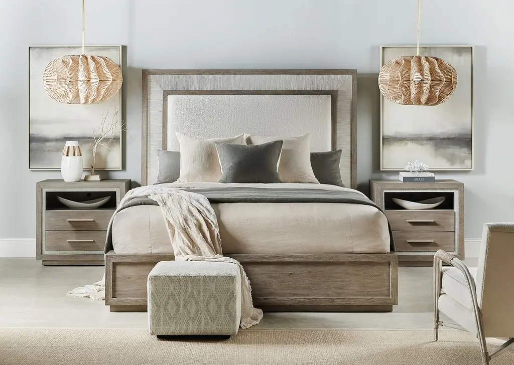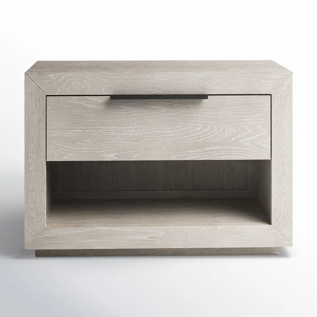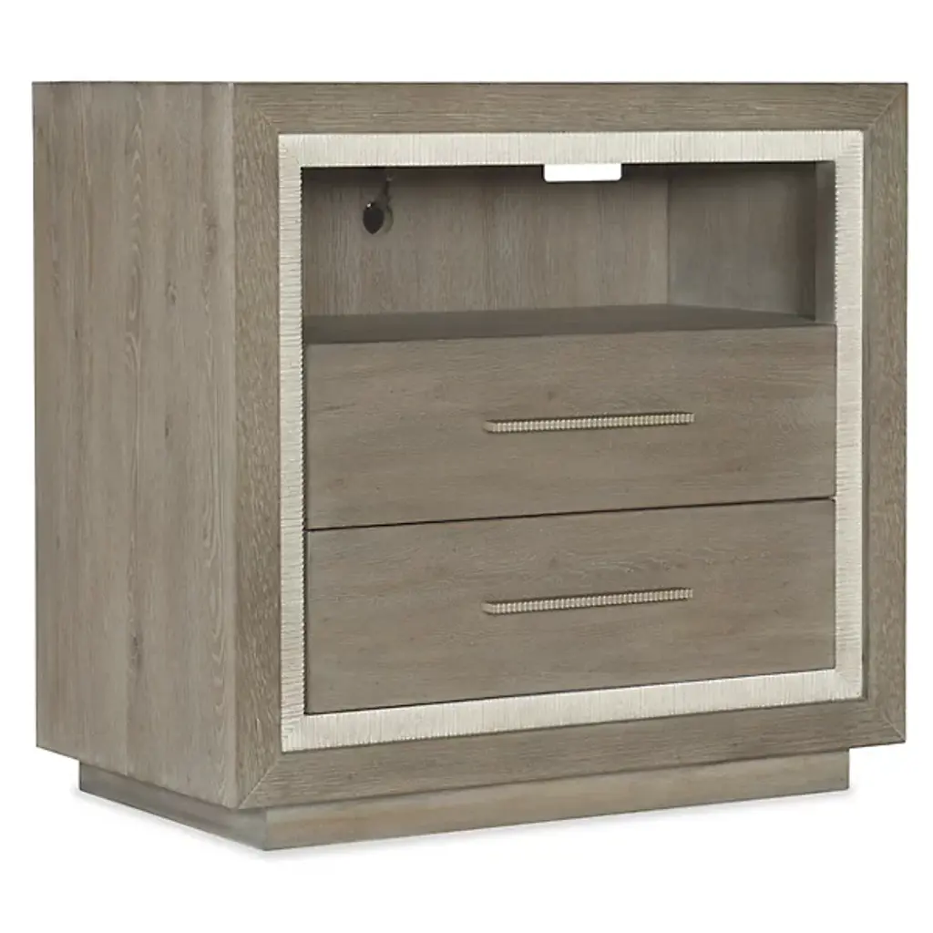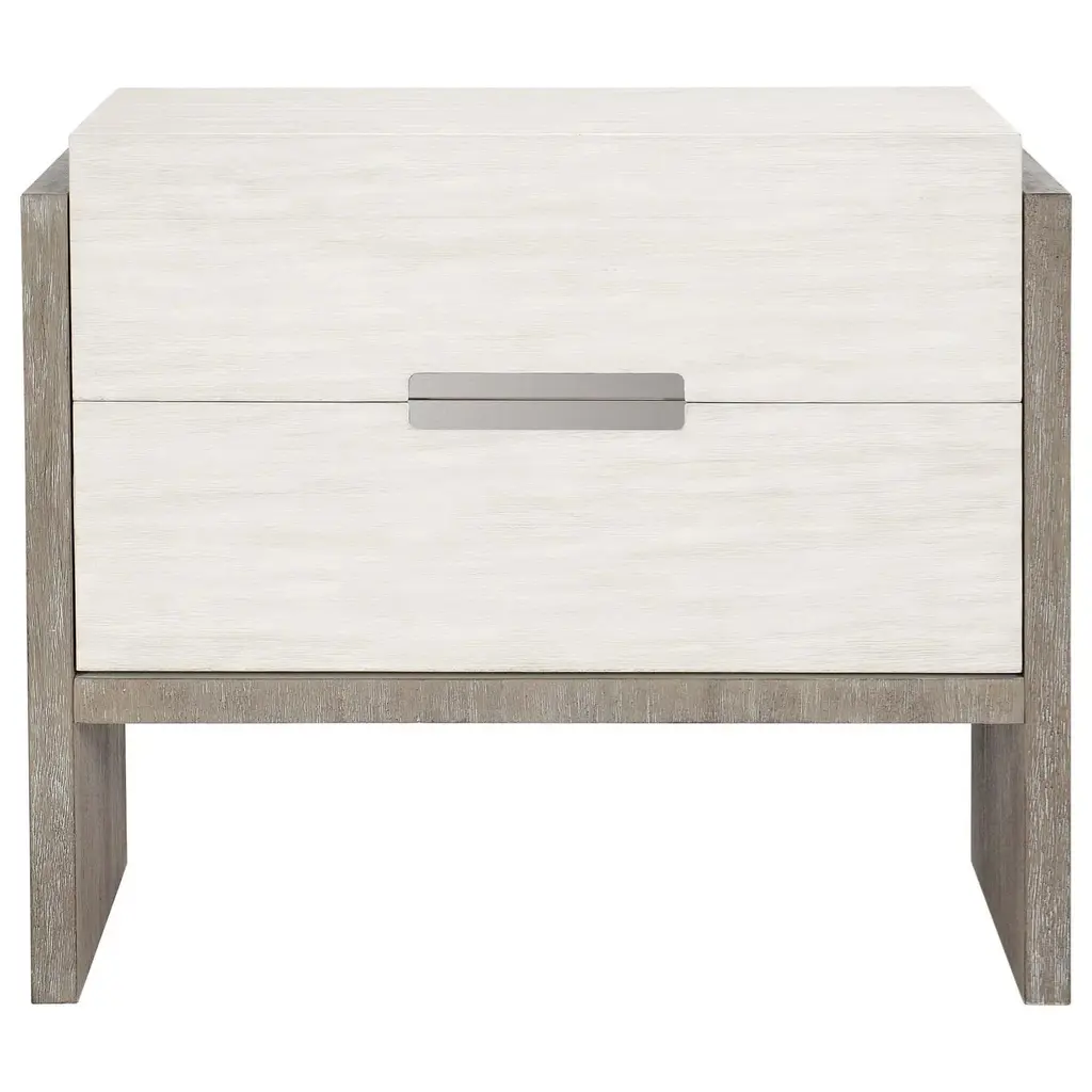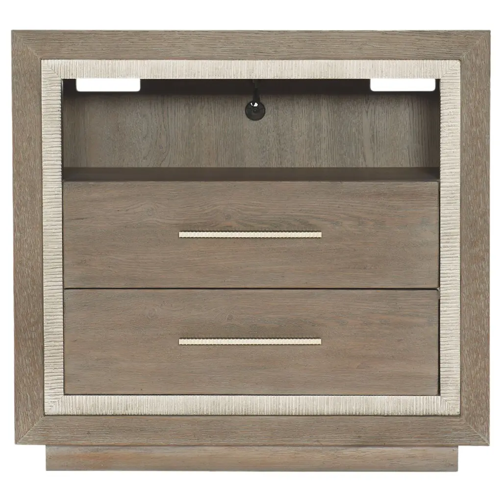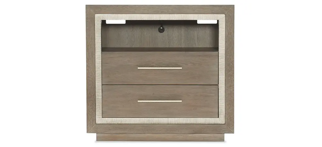 In a crisp two-tone finish, the Serenity Balboa Two-Drawer Nightstand brings the organic textures of cottage waterfront living to your space. Crafted of Oak Veneers and resin, the nightstand has two drawers with soft-close drawer guides and an open area above the drawers. There’s a USB charger with two ports on the back and a cord clip.