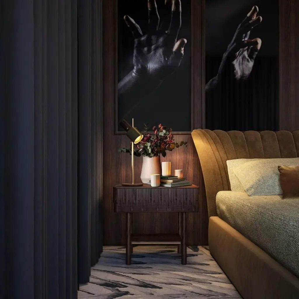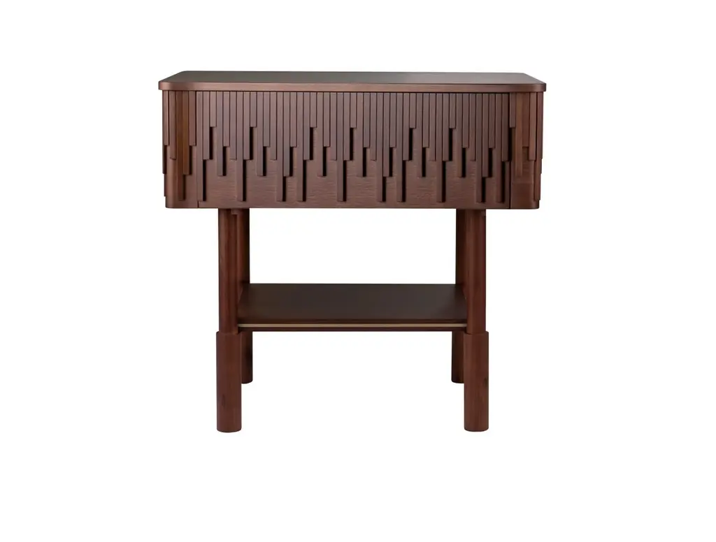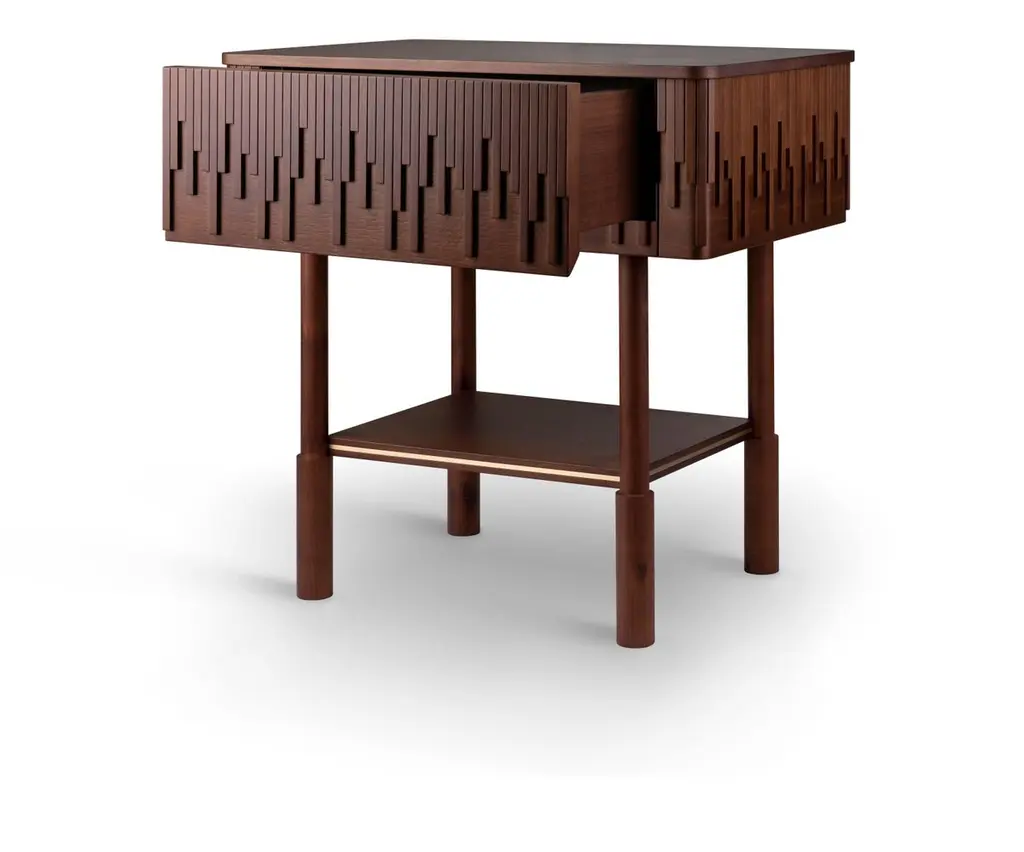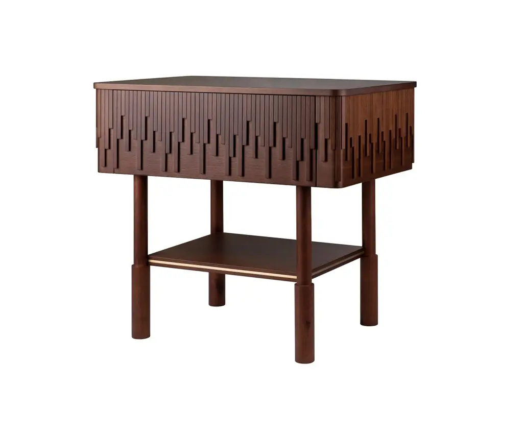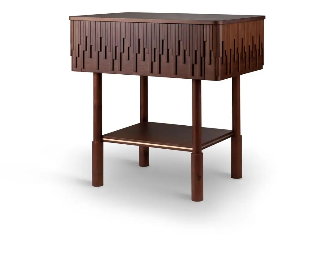Inspired by the gentlemen's lifestyle of the time and giving it a modern touch, wood tailors club designers conceived the Campbell nightstand. Handcrafted by some of the best artisans in Portugal, in walnut wood, the nightstand top is adorned with asymmetric wood details that confer to this bedside uniqueness. Its top is supported by four round legs and enriched with a small shelf that features perfect harmony between wood and brushed brass.The exquisite Campbell nightstand will provide a deluxe décor to any bedroom.