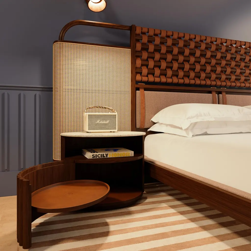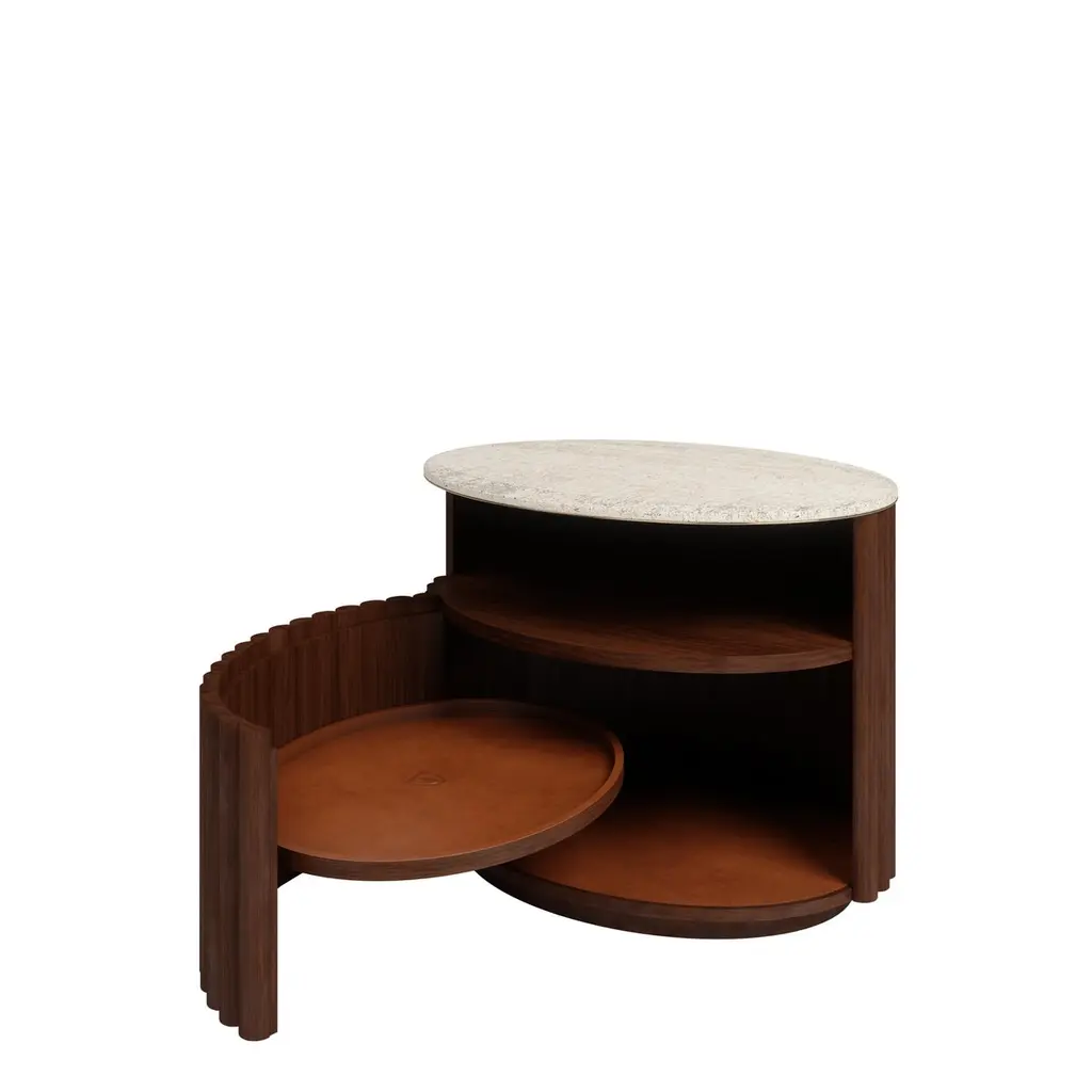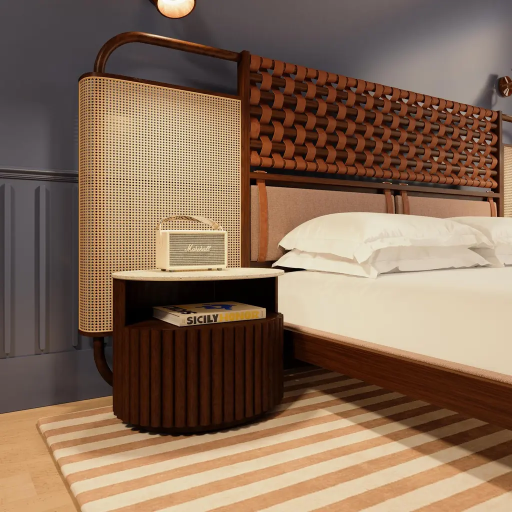 Herbert Gardner, 1st Baron Burghclere, was a notable British politician, art collector, and philanthropist. Born into a distinguished family, he made his mark through his public service, cultural contributions, and commitment to social causes. Herbert encapsulates the cherished principles and customs of the club with his unparalleled sense of refinement and dedication to achieving the highest standards of quality.The Herbert bedside table crafted from smoked walnut, featuring Marble Travertine, Natural Leather, and Brushed Brass epitomizes a fusion of opulence and artistry. Meticulously designed, this nightstand embodies a harmonious balance between natural elements and exquisite craftsmanship.