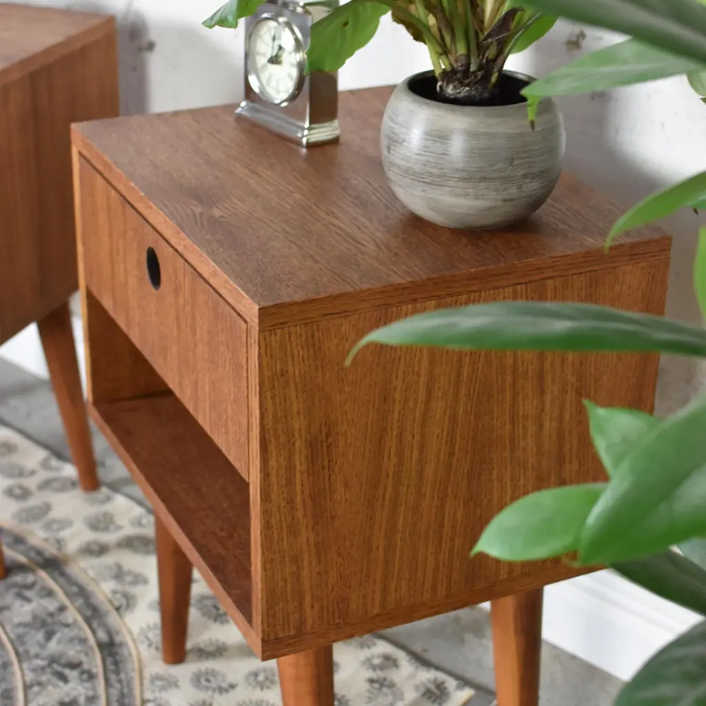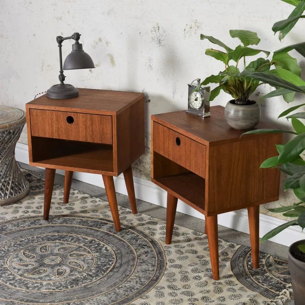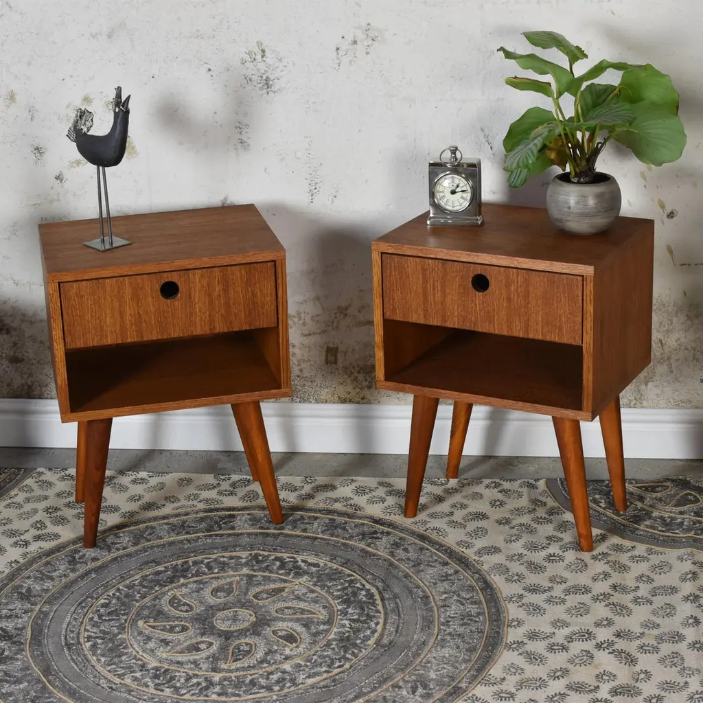 Set Of 2 Bedie + Large Bedstands by PastformDimensions: D 35 x W 45 x H 60 cm.Materials: Stained and varnished wood.Available in different wood color finishes: Whiskey, Rum, BPA, Nobel, Brandy, Schwarz, Cognac, Dunkelbraun, Honig, and Natura. Available in two different widths: 35/45 cm. Prices may vary. Please contact us.Bedie bedside cabinet provides an original look and functionality in one! Its simplicity combined with an elegant material creates a timeless composition. Wood is a material that will never go out of fashion. Proper treatment and maintenance give it an irreplaceable character! The simple design of the Bedie bedside cabinet refers to the style of the 1960s when minimalism reigned in every house. We are fully committed to recreating retro furniture and improving it with modern solutions.The classic Bedie bedside cabinet will perfectly fit into your or your child’s bedroom. There is one niche to store your trinkets and keep them always within reach. Four legs provide stability and also make the cabinet unique. The cabinet, as well as our other products, is distinguished by its fine workmanship. The appropriate wood protection time does not have any impact on its condition – the cabinet will look perfect even after many years!The furniture is entirely made of wood covered with oak veneer. Our furniture is made of only natural materials, so individual models may differ in the arrangement of grain and color. Bedie Bedside Cabinet is finished with stain and varnish.Rooted in a good traditionThe Pastform Furniture studio dates back to the 1990s. Having in mind the idea of a traditional family company, Dawid Gełeta established a carpenter’s shop in 1997. The company specializes in the manual production of utility furniture. Times have changed and with them, fashion has changed. In 2016 we decided to change the direction, following the growing demand for vintage furniture.My name is Mateusz Gełeta, I am the son of the carpenter who founded the company. From an early age, I have watched my dad’s work. He put his whole heart into creating furniture, polishing every detail with his strong hands and making sure that nothing escaped our attention before sending the product to the customer. He made sure that every piece of furniture was perfect and refined. We remain true to these principles.Following the blow, I decided to create a harmonious combination of modern quality with the classic style of the 1960s. This is why I designed and created a unique collection of wonderful furniture, which, in addition to its well-thought-out functionality, also creates a perfect design and composes original arrangements.The golden age of interior designIn the 1960s interiors used to take on a very characteristic touch. All over the world, this style was called a mid-century modern, locally it was simply – retro furniture. Simple, elegant minimalistic form, without unnecessary decorations and splendor. Decorating with the idea of an uncomplicated composition, it allows for an undisturbed selection of the arrangement accessories and emphasizes a high level of functional comfort. One might say – a perfect piece of furniture. Comfortable, hiding surprisingly many items despite quite neat dimensions, made of noble species of wood and created by hand, with a focus on carefully refined details. No wonder its popularity is growing so much.Unique, refined, with a soulEach piece of the Pastform collection represents a unique style. Thoughtful concept of usable comfort, refined details, carefully selected raw materials, and proven accessories. We use only high-quality boards which we veneer with oak, American walnut, and other durable wood species. They are carefully oiled with the best, hard, ecological oil waxes, giving the furniture its final shape. This technology brings out the natural beauty of wood, exposes the grain and unique design of each piece, highlights the beautiful color, and allows to achieve timeless durability.This is how unique, thoughtful, and refined furniture with a soul is created.Thinking about futureWe are trying to positively create the world of which we are a part, contributing to a better tomorrow. We cooperate with local suppliers, support small companies and production plants, care for ecology, and respect the needs of the land. We always strive to establish long-lasting, based-on-trust relationships with customers and contractors.Flexible, with openness and heart on handWe sincerely like what we do. Playing with the shape, structure, and texture of wood is fascinating. Creating new arrangements and coming up with innovations that will meet your expectations. We are proud of our products and we are happy to present you with our collection of refined furniture.All our vintage furniture can be made on request – fulfilling the boldest dreams and fantasies. See our offer and if you want to know more, feel free to contact us. We are waiting for you!