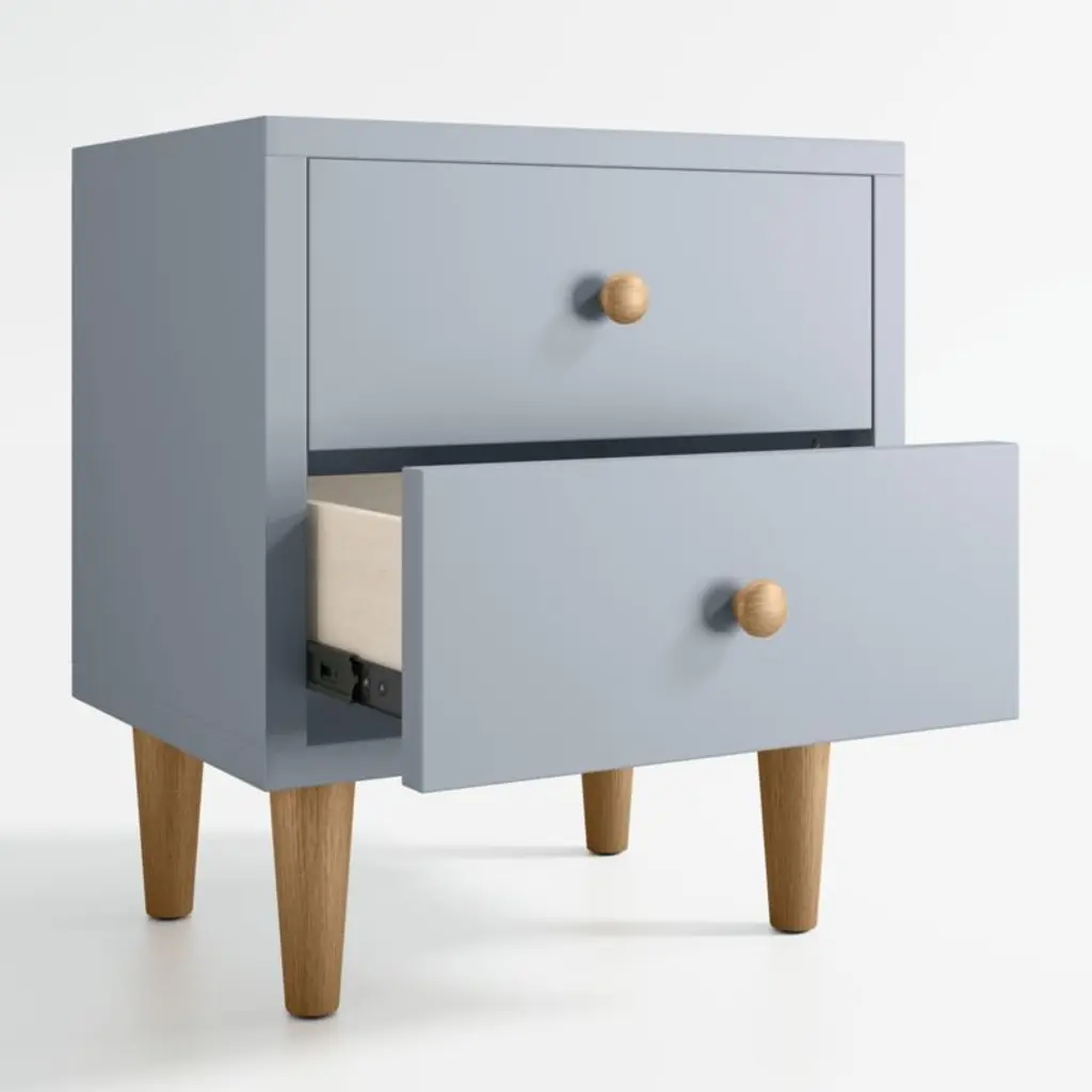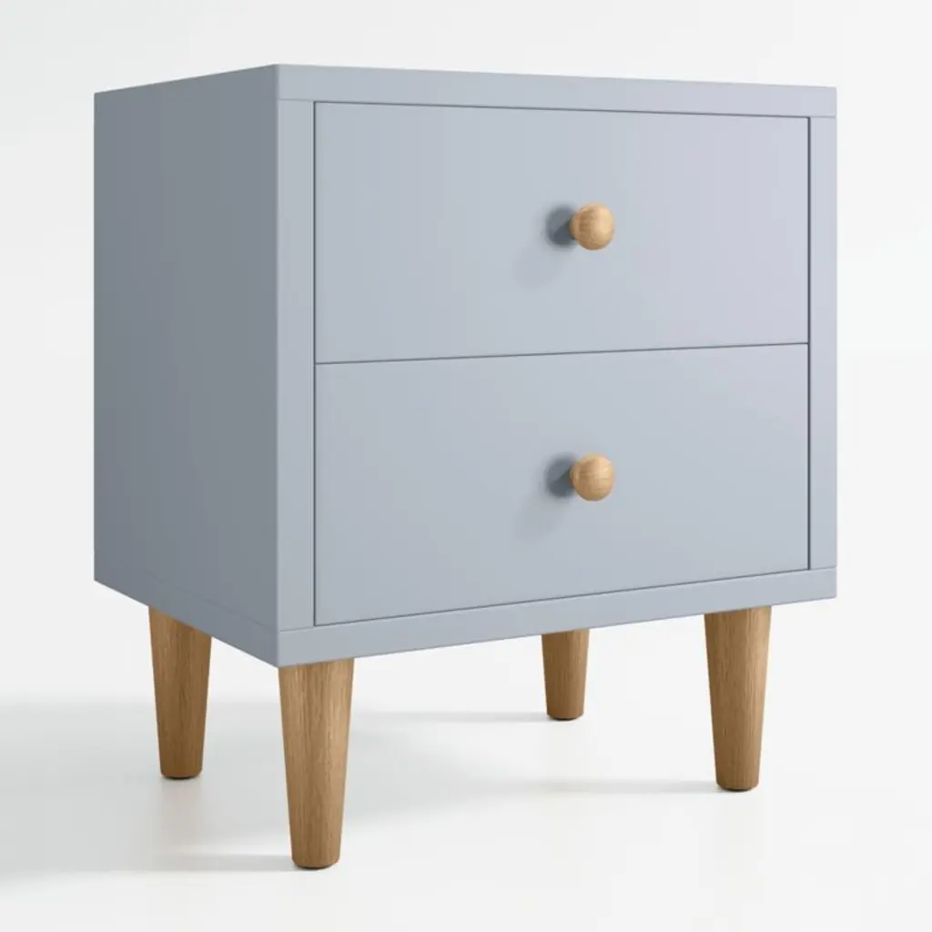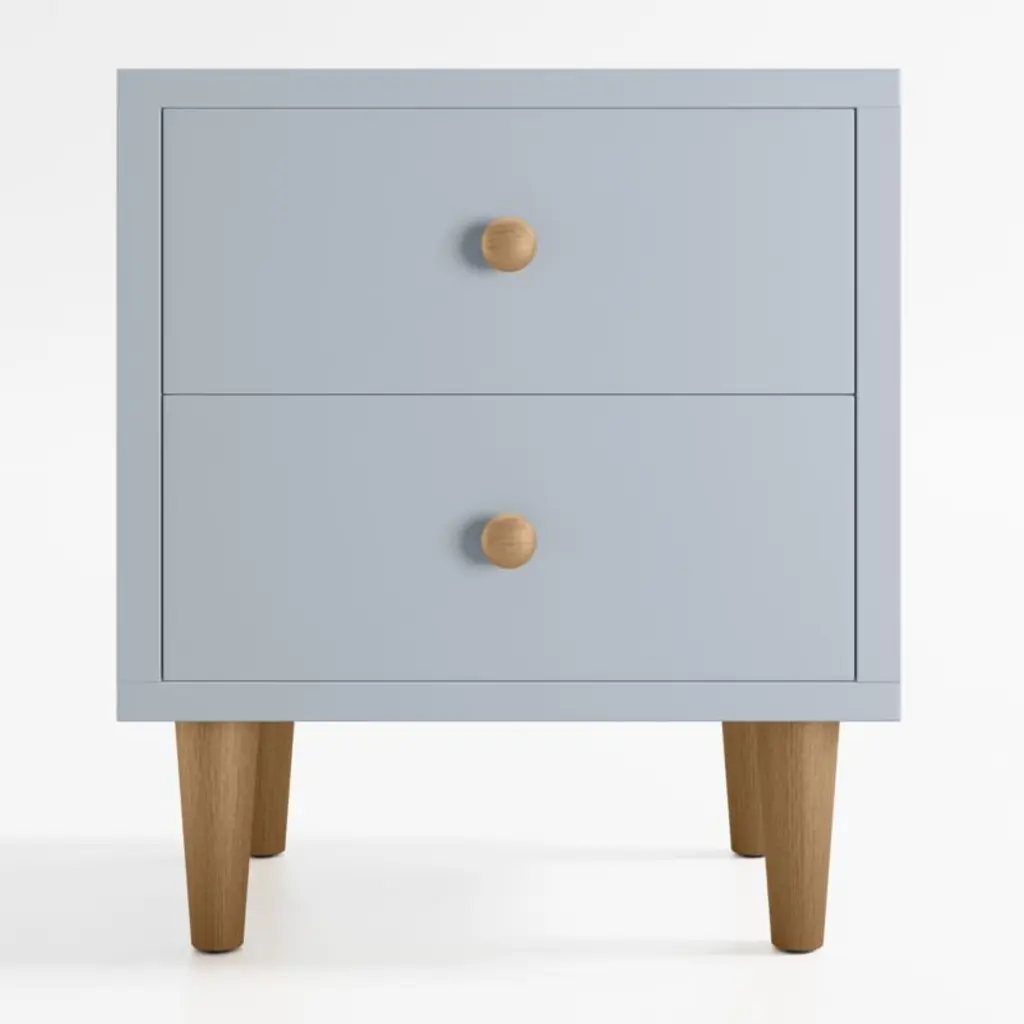 Largely inspired by Scandinavian farmhouse design, our Finn kid's furniture collection blends rustic charm and modern minimalism without skipping a beat. In a cool blue tone that contrasts with natural-finished legs and knobs, the nightstand creates a calming vibe that's right at home in a nursery or big-kid room alike. Two roomy drawers keep nighttime essentials at the ready or bulky items out of sight.