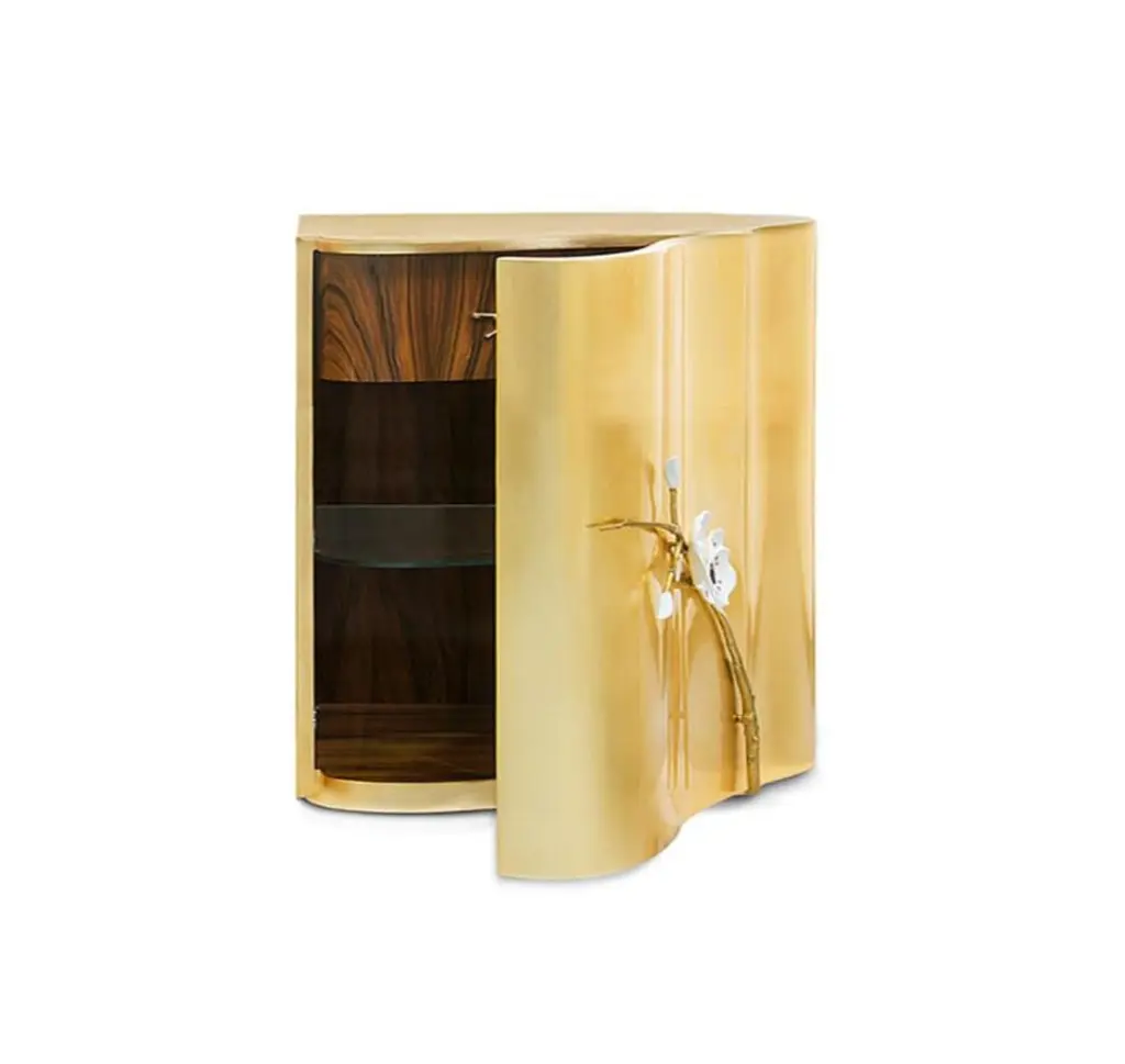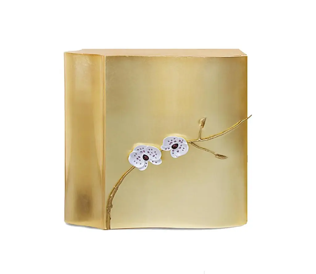 Set Of 2 Honor Bedside Table by Memoir EssenceDimensions: D 50 x W 60 x H 55 cm.Materials: Gold leaf, Swarovski crystals and iron wood veneer.Also available with a lacquered interior. Please contact us.Inspired in high jewelry Honor is characterized by a sinuous shape distributed along a curvilinear piece in gold leaf, adorned with metal orchid branches hand worked. This branches are ponctuated by Swarovski crystals who enhance the jewelry status of the bedside table.Memoir Essence Interiors has been writing its memoirs day by day, inspired in every detail lived through a feminine world, this world brings the most delicate imaginary. Jewelry, fashion, architecture, music, art and materials are Memoir’s inspirations to materialize a collection of design pieces of furniture, upholstery, lighting and accessories.The use of noble materials like marble, brass, veneers, gold and silver leaf, Swarovski crystals as other decorative and fine materials, combined with handwork techniques as casted brass, hand-whickered fabric ribbons, gold leaf appliance, marble cutted and puzzled pieces, provide the needed essence to tell memoirs through the designed pieces and the interiors they fulfill.This collection mostly handmade and focused on details and material nobility is made in Portugal, bringing handwork techniques that are part of Portuguese history, applied in a current and differentiated way, delivering timeless pieces to your special projects. Acquire Memoir is the opportunity to travel through the feminine essence over design and experience a unique “memoir” of timelessness and exclusivity.Writing is first chapter in 2016, after a journey of inspirational research, forecasting and design, Memoir made its first appearance at Maison et Objet, Paris.Since then Memoir is “writing” memories adding new materials, designs, techniques and appearances around the world, as in Paris, London or UAE.Memoir will continue this journey, always motivated by the inspiration possibilities in the many delicate details found in feminine world.Tell your memoires with this collection and be a memorialist yourself…