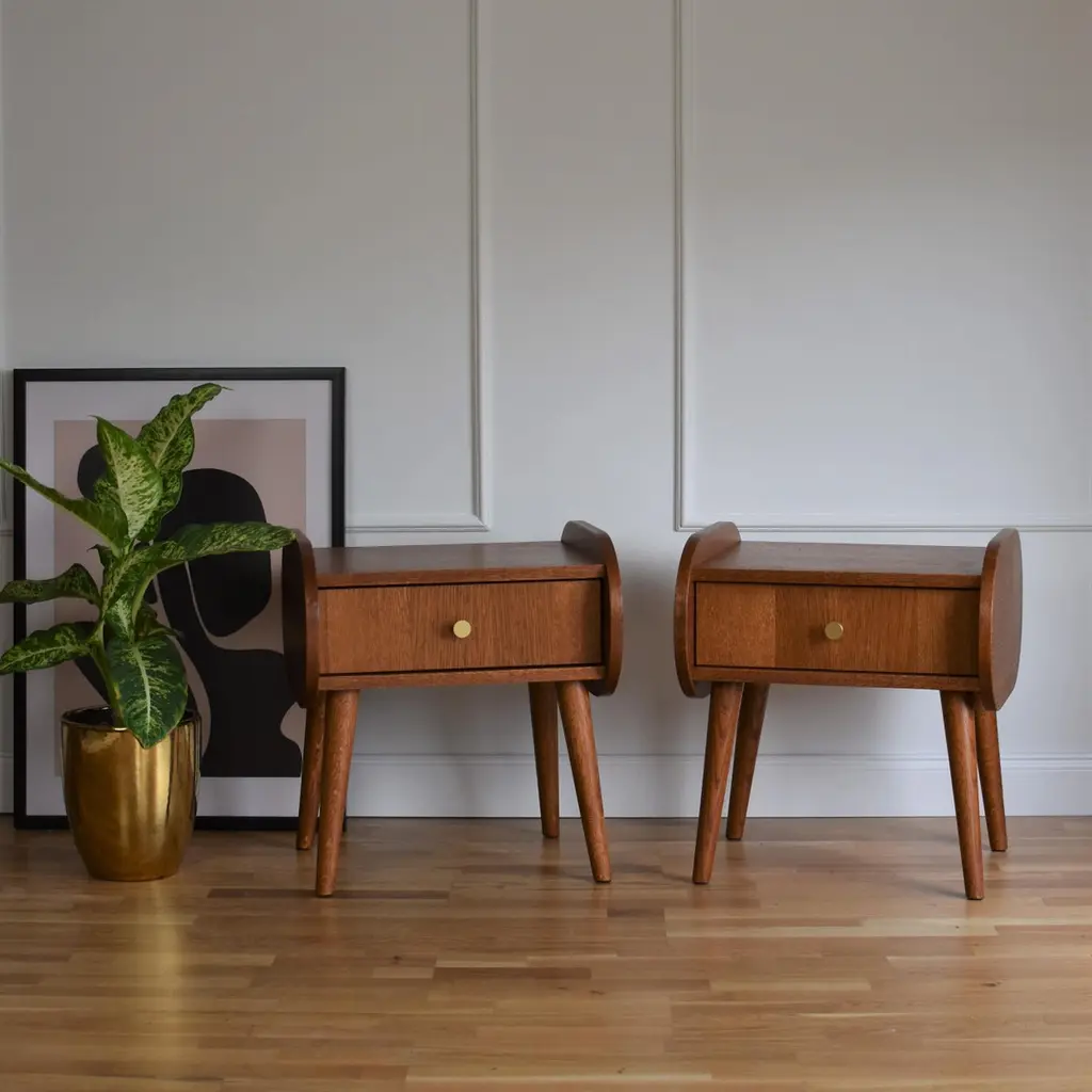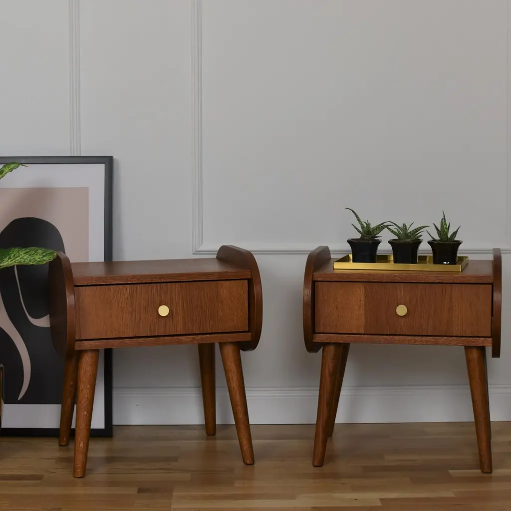 Set Of 2 Pona Bedstands by PastformDimensions: D 40 x W 45 x H 50 cm.Materials: Stained and varnished wood.Available in different wood color finishes: Whiskey, Rum, BPA, Nobel, Brandy, Schwarz, and Natura. Please contact us.The Pona nightstand is a tribute to the minimalism and design of the 1950s and 1960s. It is characterized by a simple, almost ascetic form and details and colors typical of the turn of the aforementioned decades. Although in a retro style, it fits perfectly with modern interiors. Its greatest advantages include excellent quality and versatility, as well as functionality.Pona bedside tables, although created with the bedroom in mind, will also work well in other interiors. We imagine that they will perfectly serve as a coffee table in a small living room, a cupboard in the hall, and even a piece of furniture for a child's room. We know from our customers that there are many possibilities for their use. We use only natural materials for the production of all our furniture. It is to these raw materials that Pastform products owe their unique, elegant appearance and exceptional durability.The furniture is entirely made of wood covered with oak veneer. We use only natural materials for production, therefore individual models may differ in the arrangement of rings and color. The Pona bedside table is finished with stain and varnish.Rooted in a good traditionThe Pastform Furniture studio dates back to the 1990s. Having in mind the idea of a traditional family company, Dawid Gełeta established a carpenter’s shop in 1997. The company specializes in the manual production of utility furniture. Times have changed and with them, fashion has changed. In 2016 we decided to change the direction, following the growing demand for vintage furniture.My name is Mateusz Gełeta, I am the son of the carpenter who founded the company. From an early age, I have watched my dad’s work. He put his whole heart into creating furniture, polishing every detail with his strong hands and making sure that nothing escaped our attention before sending the product to the customer. He made sure that every piece of furniture was perfect and refined. We remain true to these principles.Following the blow, I decided to create a harmonious combination of modern quality with the classic style of the 1960s. This is why I designed and created a unique collection of wonderful furniture, which, in addition to its well-thought-out functionality, also creates a perfect design and composes original arrangements.The golden age of interior designIn the 1960s interiors used to take on a very characteristic touch. All over the world, this style was called a mid-century modern, locally it was simply – retro furniture. Simple, elegant minimalistic form, without unnecessary decorations and splendor. Decorating with the idea of an uncomplicated composition, it allows for an undisturbed selection of the arrangement accessories and emphasizes a high level of functional comfort. One might say – a perfect piece of furniture. Comfortable, hiding surprisingly many items despite quite neat dimensions, made of noble species of wood and created by hand, with a focus on carefully refined details. No wonder its popularity is growing so much.Unique, refined, with a soulEach piece of the Pastform collection represents a unique style. Thoughtful concept of usable comfort, refined details, carefully selected raw materials, and proven accessories. We use only high-quality boards which we veneer with oak, American walnut, and other durable wood species. They are carefully oiled with the best, hard, ecological oil waxes, giving the furniture its final shape. This technology brings out the natural beauty of wood, exposes the grain and unique design of each piece, highlights the beautiful color, and allows to achieve timeless durability.This is how unique, thoughtful, and refined furniture with a soul is created.Thinking about futureWe are trying to positively create the world of which we are a part, contributing to a better tomorrow. We cooperate with local suppliers, support small companies and production plants, care for ecology, and respect the needs of the land. We always strive to establish long-lasting, based-on-trust relationships with customers and contractors.Flexible, with openness and heart on handWe sincerely like what we do. Playing with the shape, structure, and texture of wood is fascinating. Creating new arrangements and coming up with innovations that will meet your expectations. We are proud of our products and we are happy to present you with our collection of refined furniture.All our vintage furniture can be made on request – fulfilling the boldest dreams and fantasies. See our offer and if you want to know more, feel free to contact us. We are waiting for you!