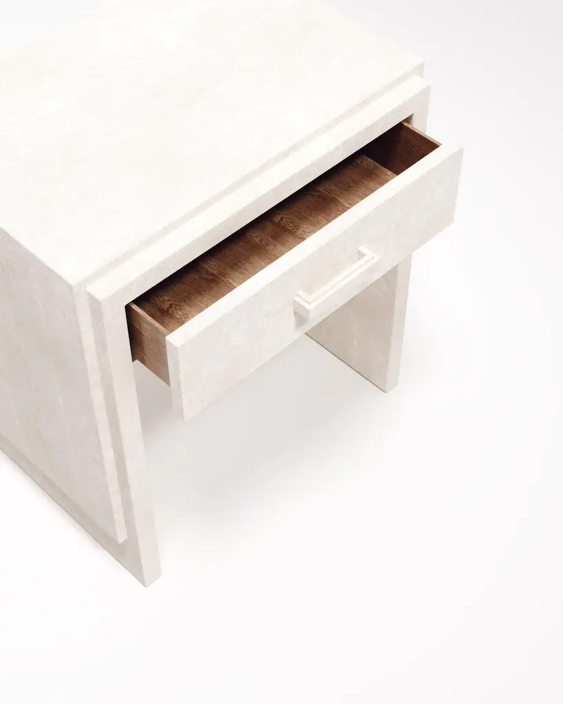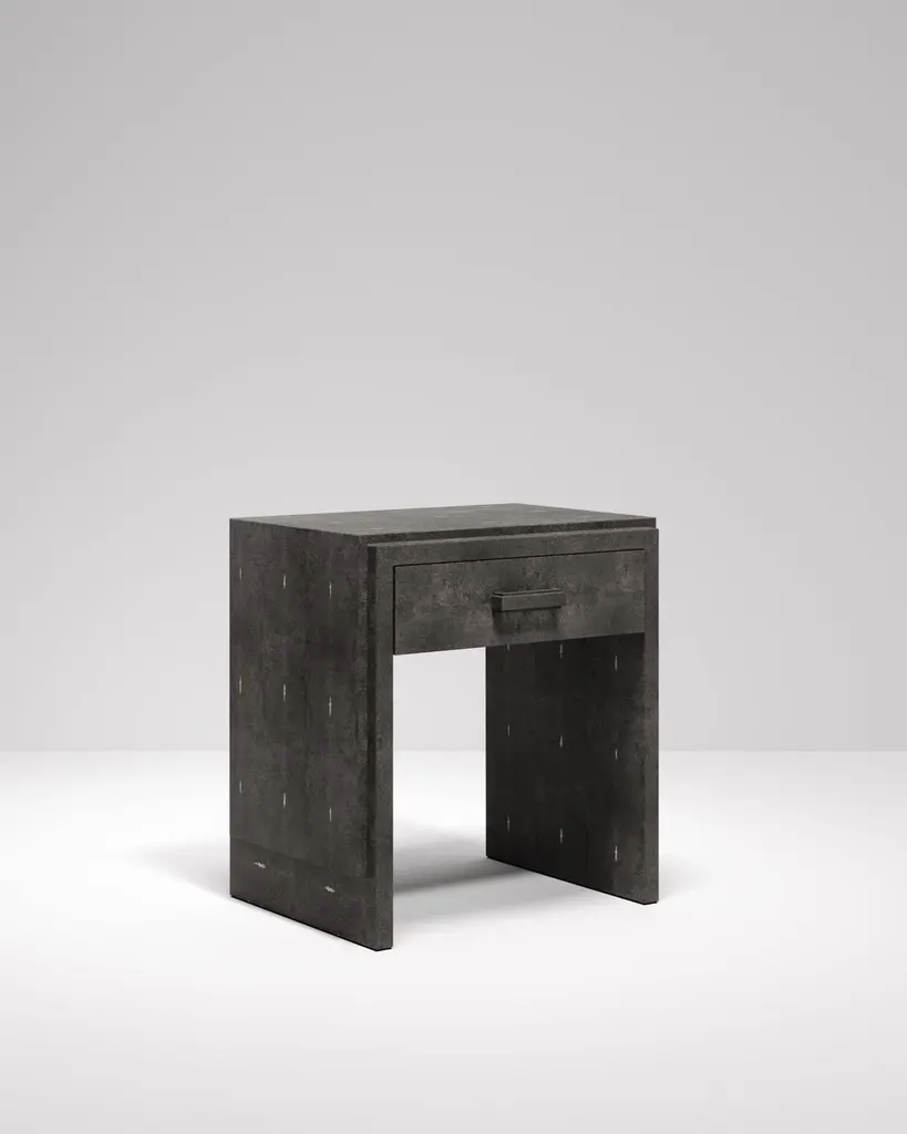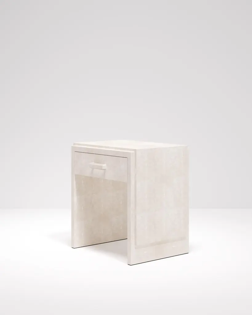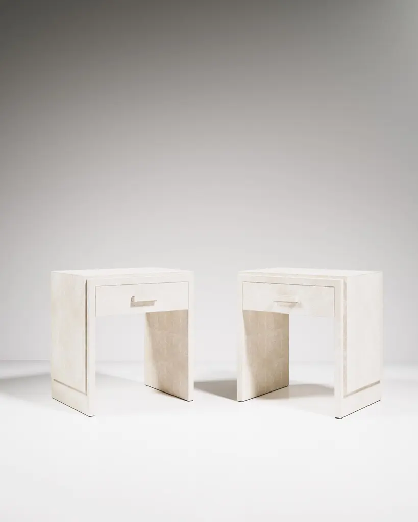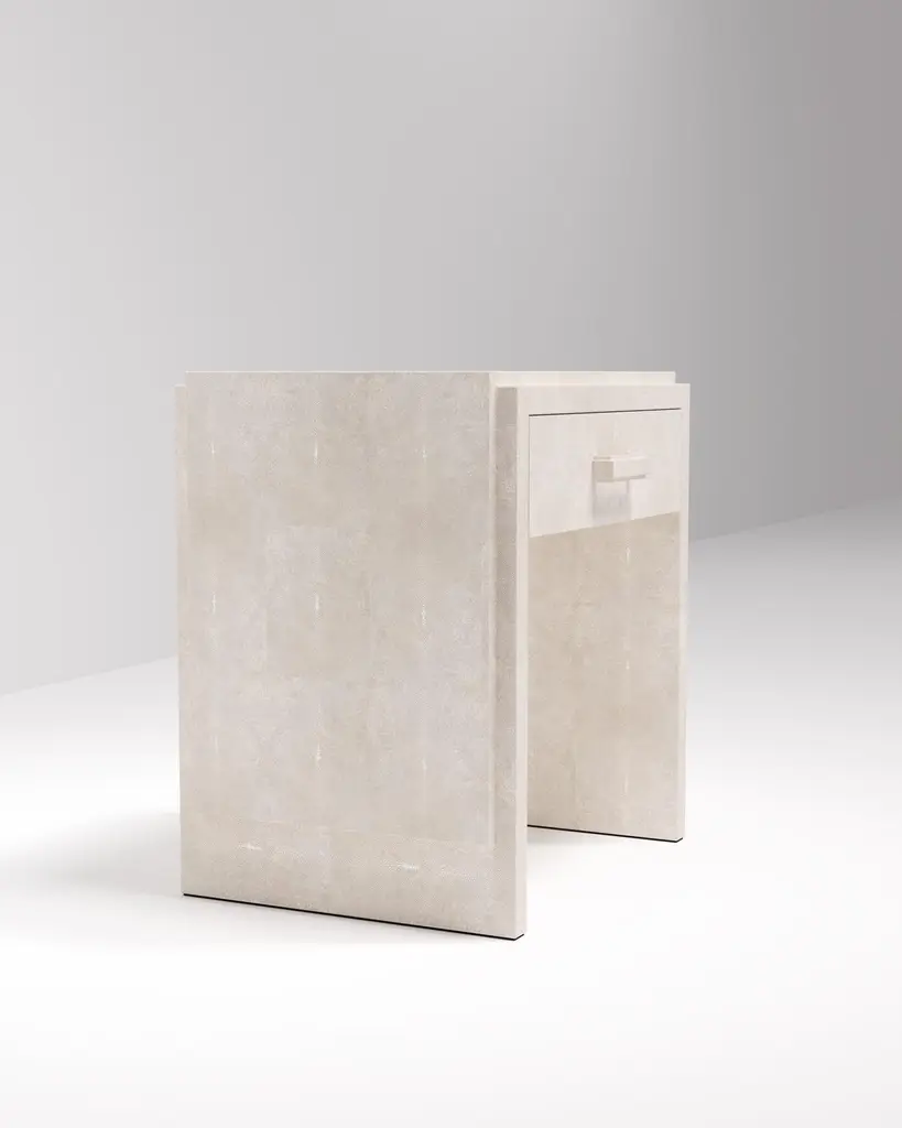 The Paris based label has distinguished themselves since their launch, with their iconic use of shagreen mixed with brass and other exotic materials. All furniture is handcrafted by skilled artisans, ultimately making each piece unique, designed in Paris and produced in the Philippines.The tomboy bedside by R&Y Augousti is an elegant piece with its subtle geometry. This bedside table is completely inlaid in cream shagreen. This bedside table includes one drawer. Available in other finishes and second version, see images at end of slide. Custom color/sizing available on request.The finish of the shagreen is authentic as it is hand-dyed by our artisans and the designer calls this finish "antique natural shagreen"The dimensions of this piece are 19.75" x 15.75" x 23.5"All R&Y Augousti pieces are handmade by artisans, ultimately making each piece unique. Wipe clean with soft dry cloth.Acclaimed design duo Ria & Yiouri Augousti have established themselves since the 1990s as pioneers of modern-vintage style through their luxurious Art Deco inspired collections.The Paris based label has distinguished themselves since their launch, with their iconic use of shagreen mixed with brass and other exotic materials. All furniture is handcrafted by skilled artisans, ultimately making each piece unique.All shagreen-covered items should be kept out of direct sunlight, color variants may occur on the stingray and other exotic finishes, but this showcases the Parisian label's commitment to creating authentic luxurious products using natural components.