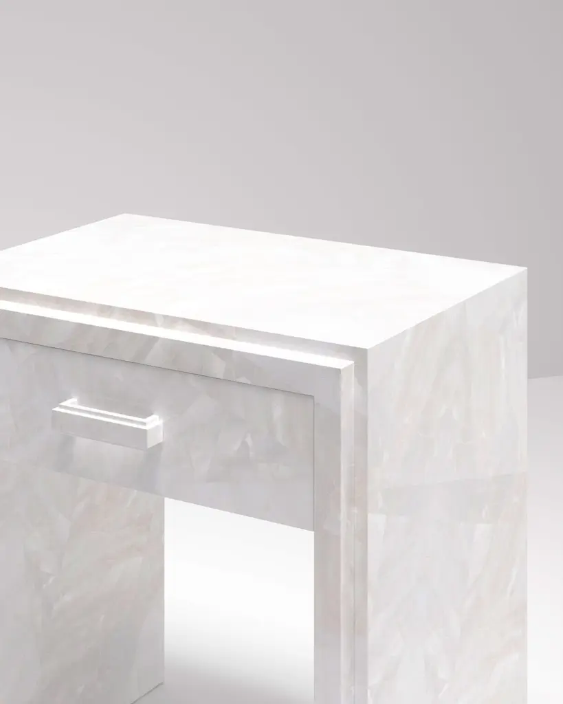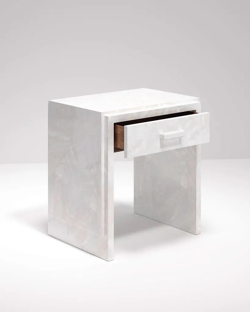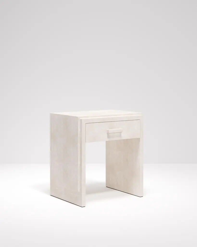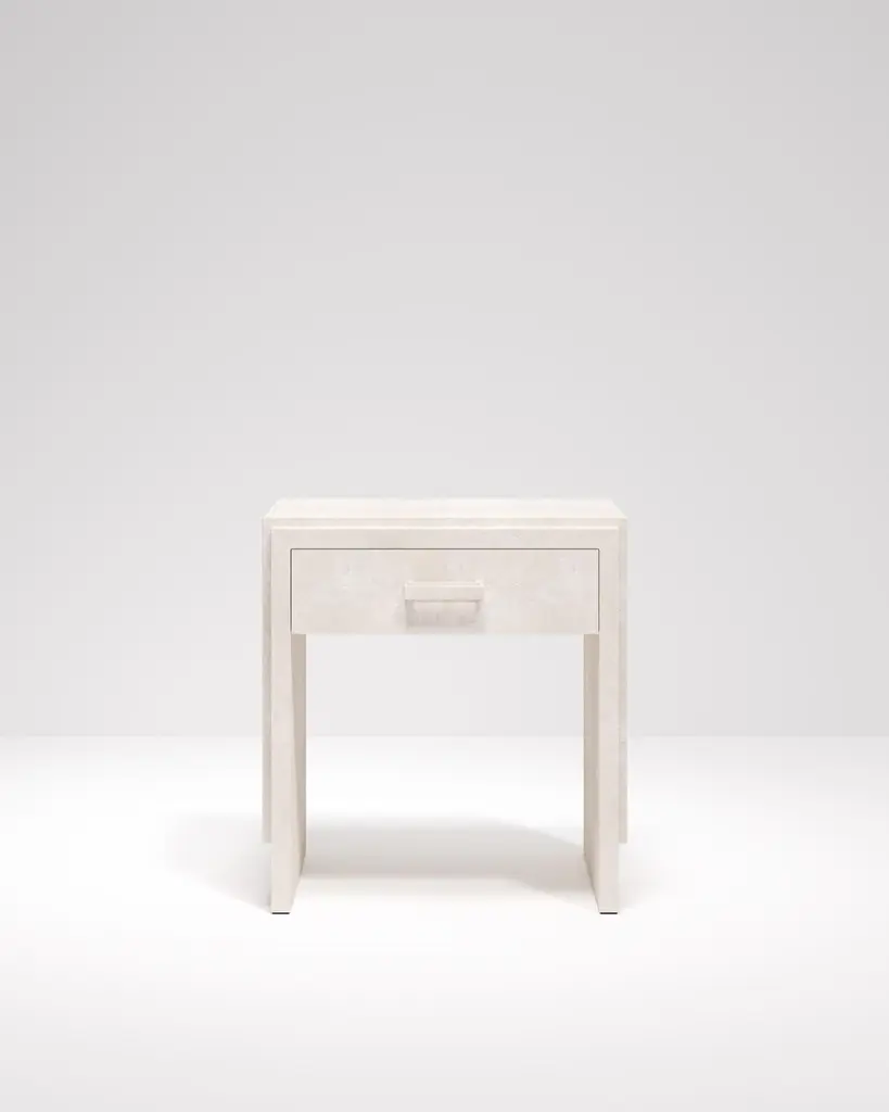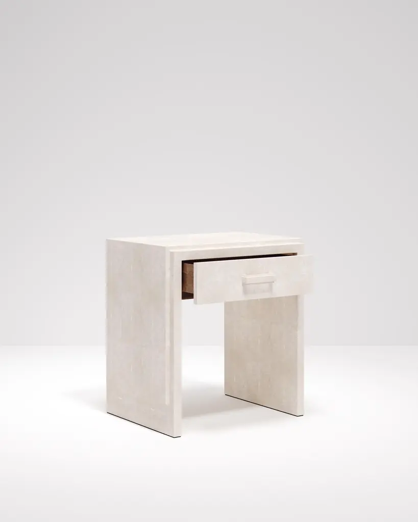 The Paris based label has distinguished themselves since their launch, with their iconic use of shagreen mixed with brass and other exotic materials. All furniture is handcrafted by skilled artisans, ultimately making each piece unique, designed in Paris and produced in the Philippines.The tomboy bedside by R&Y Augousti is an elegant piece with its subtle geometry. This bedside table is completely inlaid in cream shagreen. This bedside table includes one drawer. Available in other finishes and second version, see images at end of slide. Custom color/sizing available on request.The finish of the shagreen is authentic as it is hand-dyed by our artisans and the designer calls this finish "antique natural shagreen"The dimensions of this piece are 19.75" x 15.75" x 23.5"All R&Y Augousti pieces are handmade by artisans, ultimately making each piece unique. Wipe clean with soft dry cloth.Acclaimed design duo Ria & Yiouri Augousti have established themselves since the 1990s as pioneers of modern-vintage style through their luxurious Art Deco inspired collections.The Paris based label has distinguished themselves since their launch, with their iconic use of shagreen mixed with brass and other exotic materials. All furniture is handcrafted by skilled artisans, ultimately making each piece unique.All shagreen-covered items should be kept out of direct sunlight, color variants may occur on the stingray and other exotic finishes, but this showcases the Parisian label's commitment to creating authentic luxurious products using natural components.