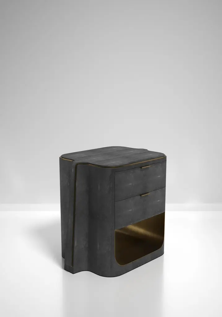 The Paris based label has distinguished themselves since their launch, with their iconic use of shagreen mixed with brass and other exotic materials. All furniture is handcrafted by skilled artisans, ultimately making each piece unique, designed in Paris and produced in the Philippines.The Axis Bedside Table is an effortless piece that embodies sophistication along with subtle graphic detailing. Inlaid in black shagreen, the tapered frame creates a geometric aesthetic within the timeless design of the piece. This piece has two drawers with thin bronze-patina brass handles and the open bottom shelf is inlaid in bronze-patina brass. Available as a stool, side table, bench and console. Custom sizing and finishing available on request. The dimensions of this piece are 68.5 x 40 x 60 cmAll R & Y Augousti pieces are handmade by artisans, ultimately making each piece unique.Wipe clean with soft dry cloth.Acclaimed design duo Ria & Yiouri Augousti have established themselves since the 1990s as pioneers of modern-vintage style through their luxurious Art Deco inspired collections.The Paris based label has distinguished themselves since their launch, with their iconic use of shagreen mixed with brass and other exotic materials. All furniture is handcrafted by skilled artisans, ultimately making each piece unique. All shagreen-covered items should be kept out of direct sunlight, color variants may occur on the stingray and other exotic finishes, but this showcases the Parisian label's commitment to creating authentic luxurious products using natural components.