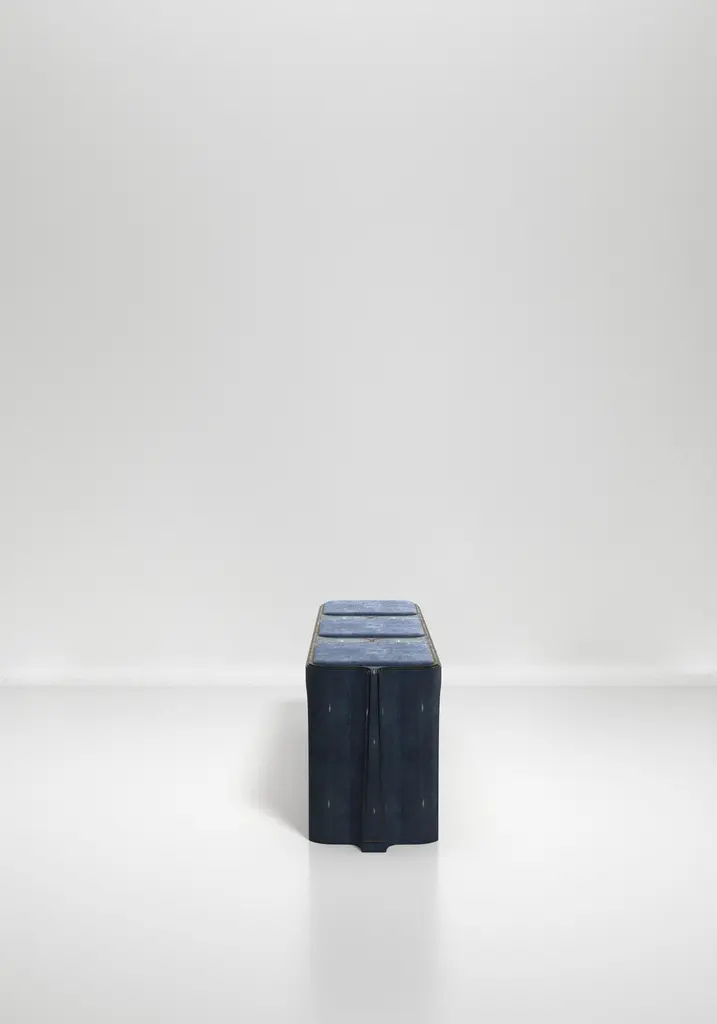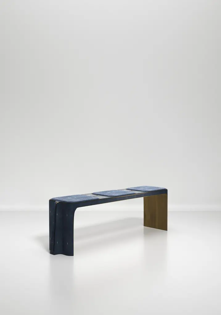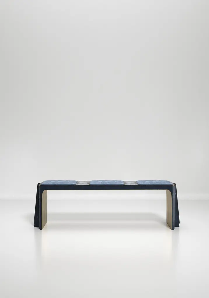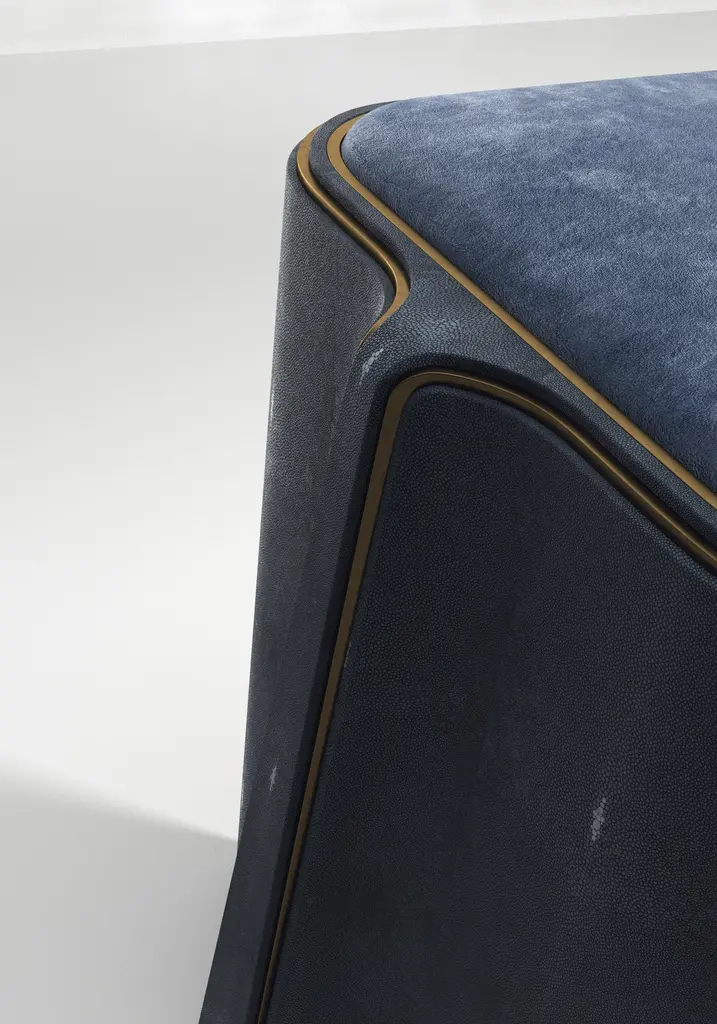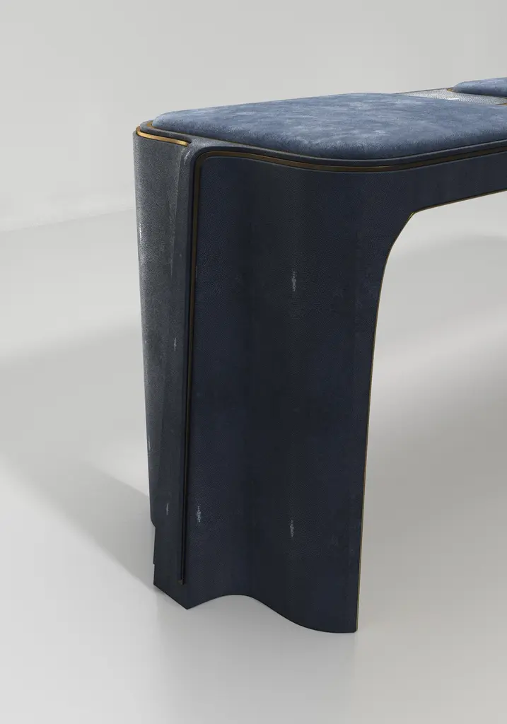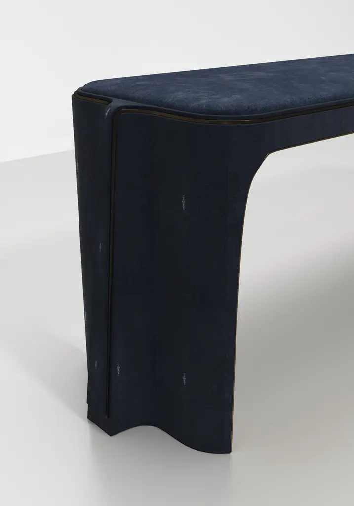 The Paris based label has distinguished themselves since their launch, with their iconic use of shagreen mixed with brass and other exotic materials. All furniture is handcrafted by skilled artisans, ultimately making each piece unique, designed in Paris and produced in the Philippines.The Axis Bench is an effortless piece that embodies sophistication along with subtle graphic detailing. Inlaid in blue shagreen, the tapered frame creates a geometric aesthetic within the timeless design of the piece. The top of the bench is upholstered in 3 thin dark blue velvet cushioning that sit within a striking pattern created by thin bronze-patina brass insets. The inner lining of the bench is done in bronze-patina brass creating a beautiful pop against the neutral colour of the bench. Available as a stool, side table, bedside table and console. Custom sizing and finishing available on request. The dimensions of this piece are 150 x 45 x 45 cmAll R & Y Augousti pieces are handmade by artisans, ultimately making each piece unique.Wipe clean with soft dry cloth.Acclaimed design duo Ria & Yiouri Augousti have established themselves since the 1990s as pioneers of modern-vintage style through their luxurious Art Deco inspired collections.The Paris based label has distinguished themselves since their launch, with their iconic use of shagreen mixed with brass and other exotic materials. All furniture is handcrafted by skilled artisans, ultimately making each piece unique. All shagreen-covered items should be kept out of direct sunlight, color variants may occur on the stingray and other exotic finishes, but this showcases the Parisian label's commitment to creating authentic luxurious products using natural components.