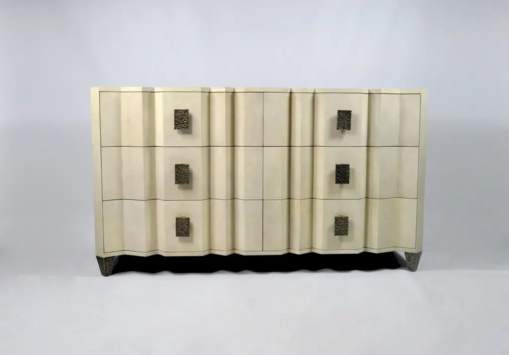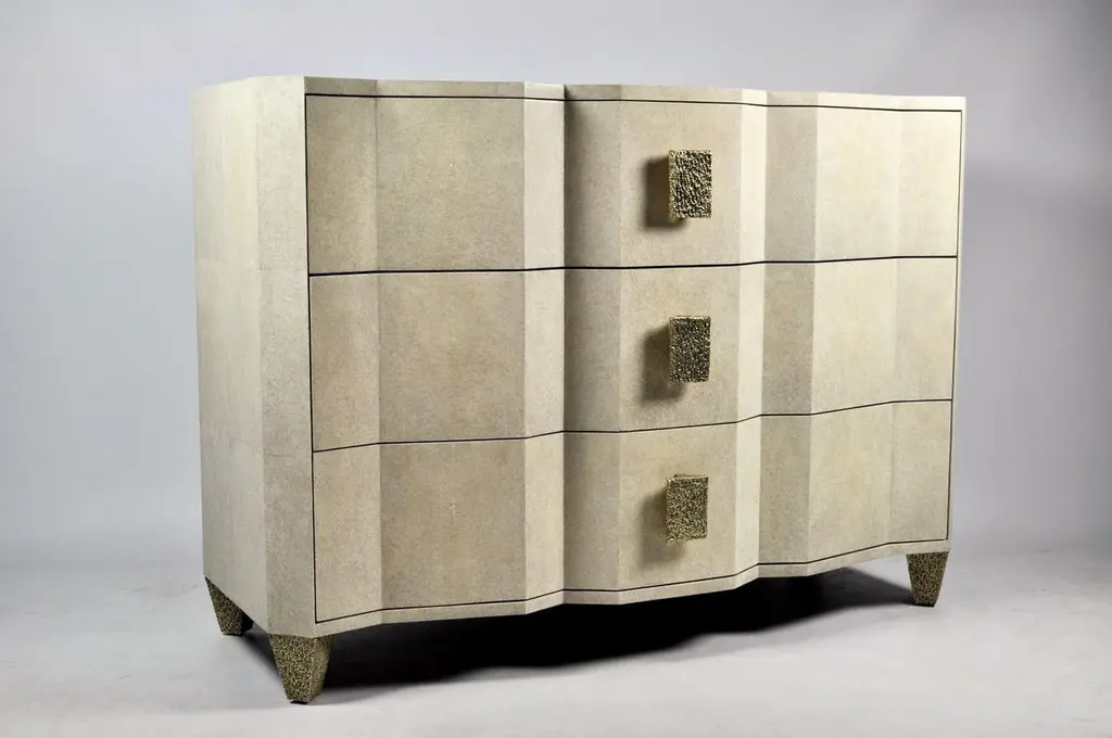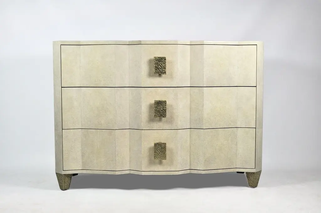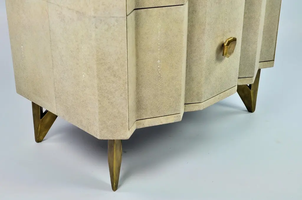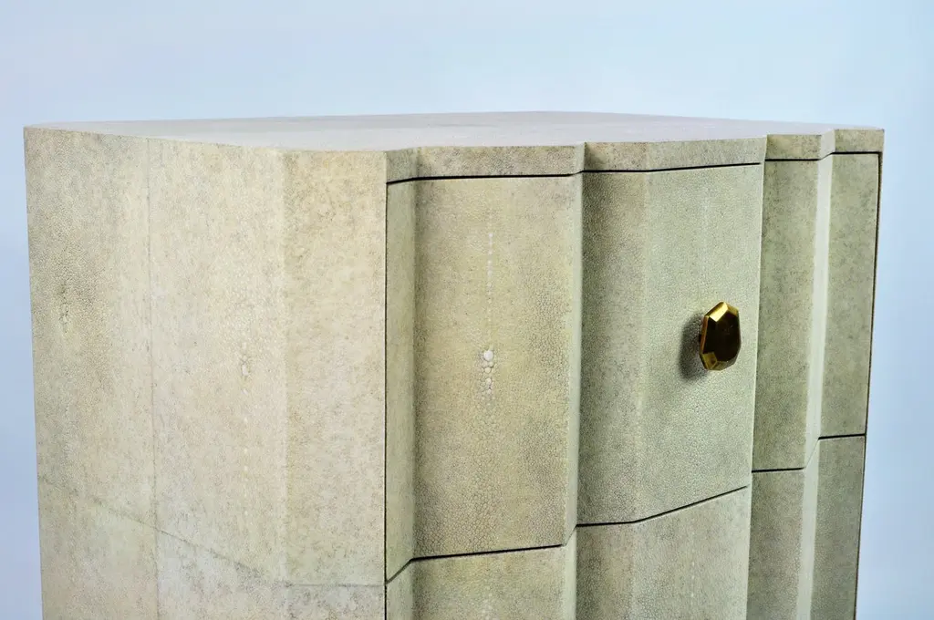 The Accordeon night stand table is a stunning futurist piece made of shagreen. It has two drawers.The knobs and the feet have an old brass patina. The interior of the drawers are in black veneer.The dimensions of this piece are 23.62" x 15.74 " x H 25.59" The bedside in the photo is realized in natural shagreen (Our ref ANTIC)We can customize the dimensions and finishes. Care instructions:Keep the materials dry and protected from direct sunlight and heat surfacesTo clean, simply wipe with a dry clean clothDo not use any cleaning agent on the surfaceThis piece is handmade by our talented team of master craftsmen.