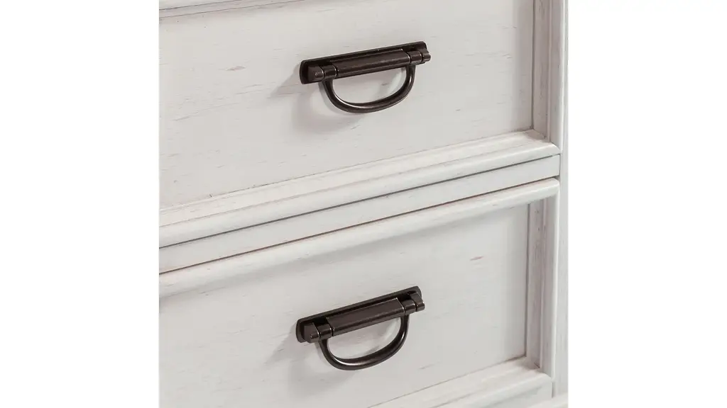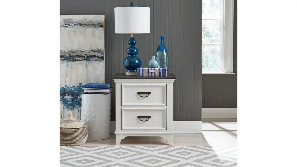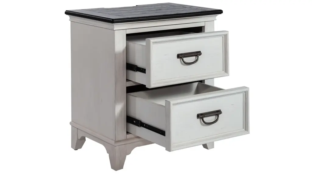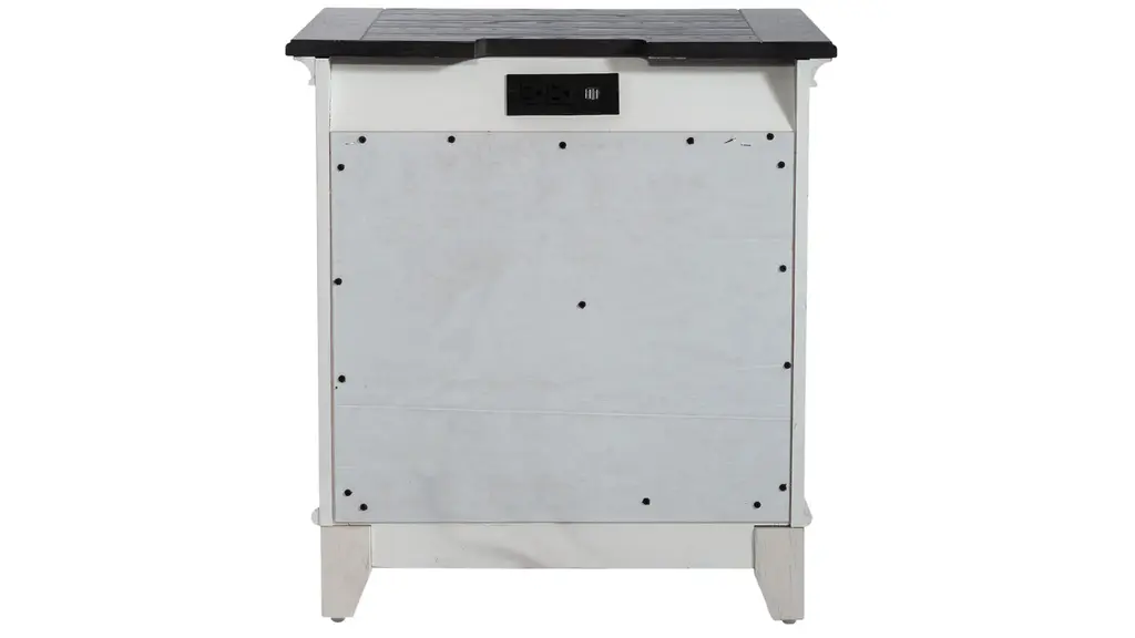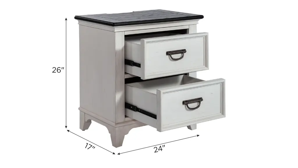 Create a classic look with a casual feel using the Shelby Small 2 Drawer Nightstand. The two-toned wire brushed finish with charcoal tops creates a cottage style that works anywhere from the beach to the mountains. Crafted of poplar and rubberwood solids with cathedral white oak tops, this piece features fully stained interior drawers, full extension drawer glides for easy access to storage, and bottom case dust proofing to preserve contents. Planked tops add a vintage vibe while the stylish tapered feet tie into the cottage design. With today's technology in mind, users can enjoy the benefit of the incorporated charging station, featuring two USB ports and two outlets, making multi-device charging a breeze.