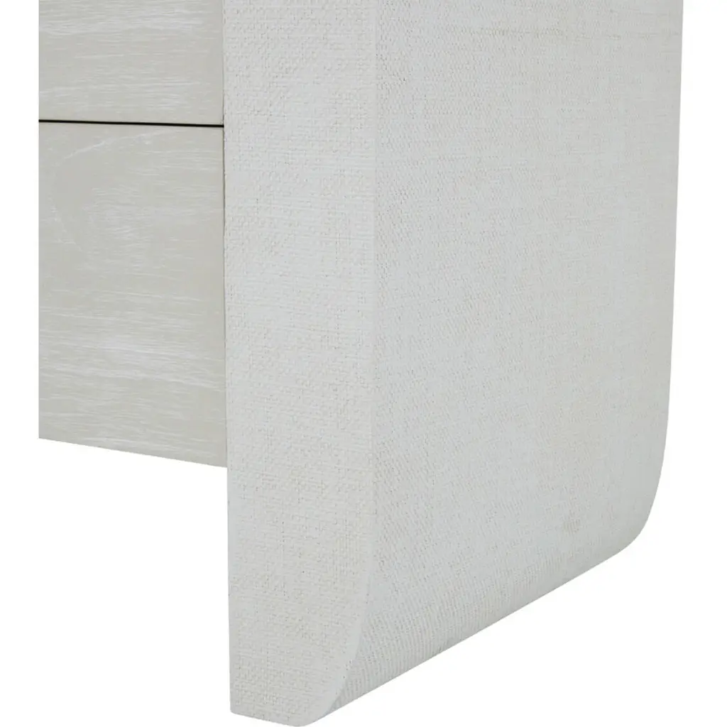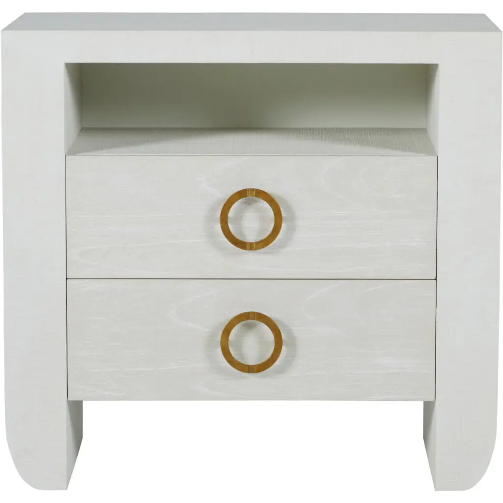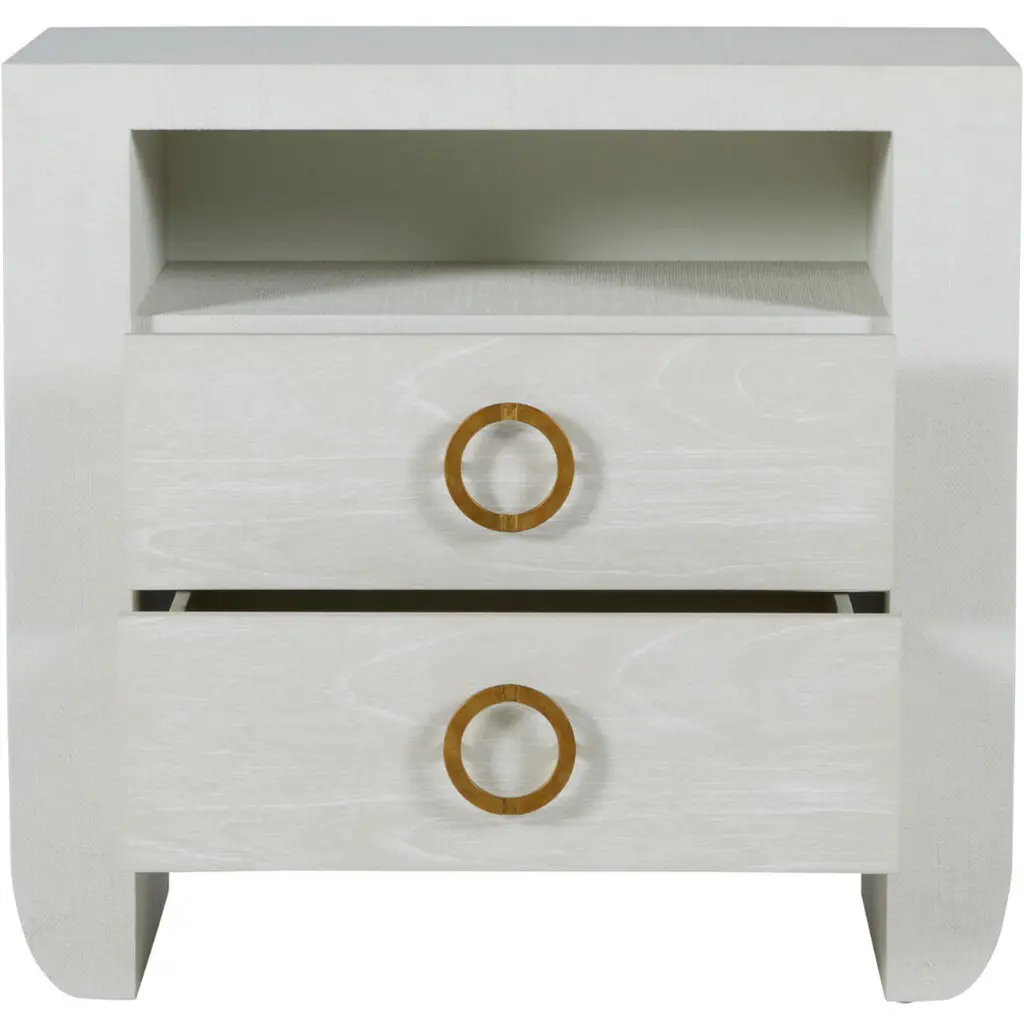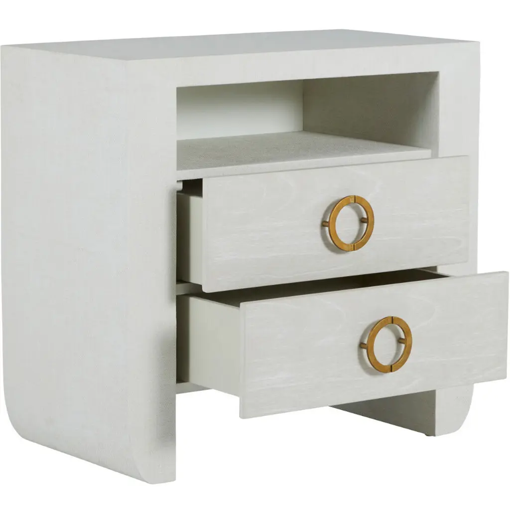 The Sherie Nightstand offers both open and closed storage in a minimal silhouette, making it an ideal bedside accent that blends easily in any setting. Wrapped in a luxurious raffia texture, this nightstand features two spacious drawers adorned with striking stained gold ring pulls, adding a touch of glamour. The open shelf provides additional storage space, perfect for keeping your bedside essentials organized. The soft, cerused white finish enhances its contemporary appeal, making the Sherie Nightstand a versatile piece that complements any bedroom decor with its stylish functionality.