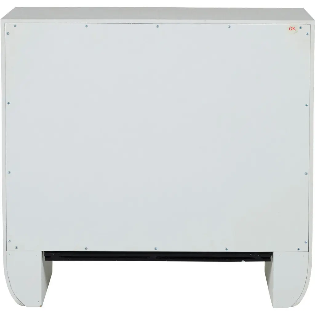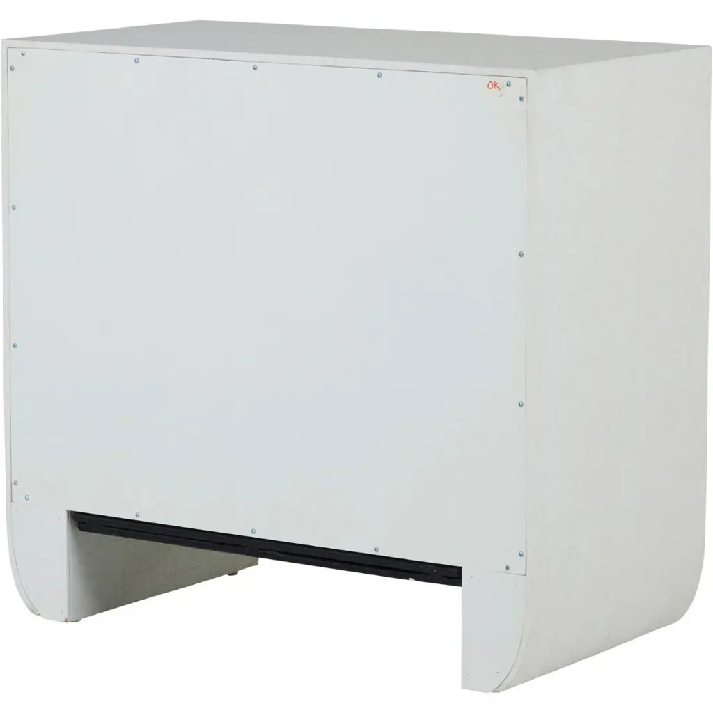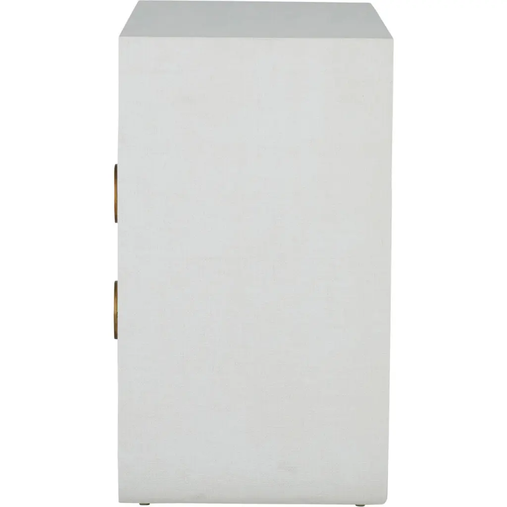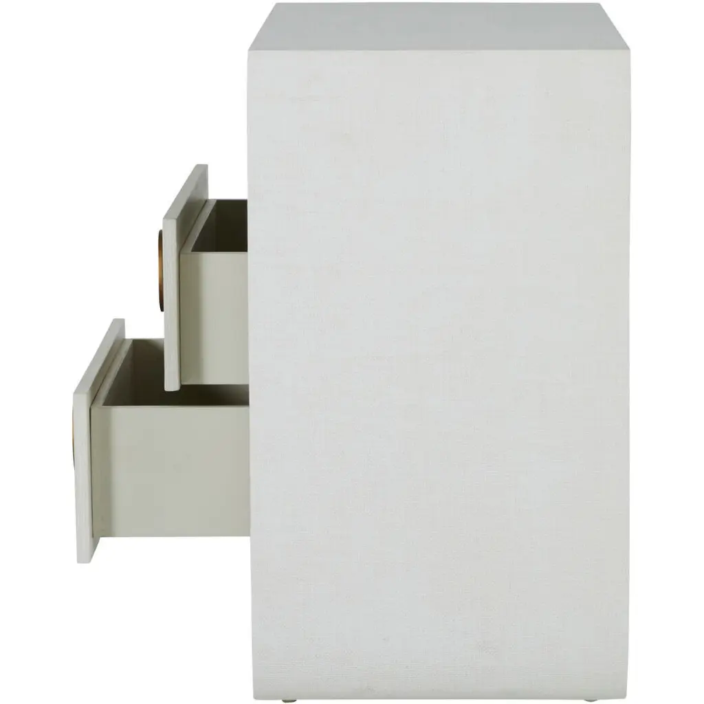 The Sherie Nightstand offers both open and closed storage in a minimal silhouette, making it an ideal bedside accent that blends easily in any setting. Wrapped in a luxurious raffia texture, this nightstand features two spacious drawers adorned with striking stained gold ring pulls, adding a touch of glamour. The open shelf provides additional storage space, perfect for keeping your bedside essentials organized. The soft, cerused white finish enhances its contemporary appeal, making the Sherie Nightstand a versatile piece that complements any bedroom decor with its stylish functionality.