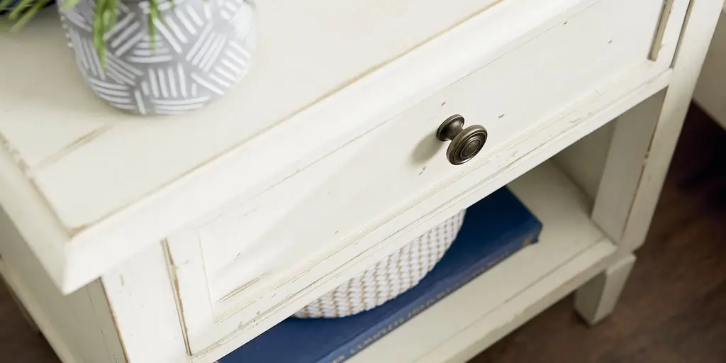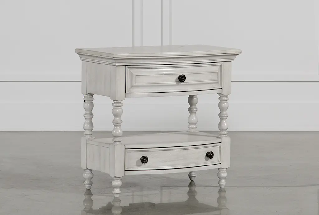 Vintage rustic meets coastal chic in the Shoreline Collection! Storage and display space combined in this charming bedside table with 1 ribbed top drawer, oil-rubbed bronze pull knob, self-closing drawer guides, and bottom storage shelf with a convenient cut-out for electrical cords. Shop online or in-store! A Sea Salt distressed white finish and transitional elements give these pieces a comfy, casual feel; perfect for a beach house or if you want to bring some relaxed coastal style home to you. Ribbed top drawers on case pieces bring an element of texture. Drawer fronts are adorned with custom oval ring pulls in an oil-rubbed bronze finish. Case pieces feature soft self-closing drawer guides. A simple, straightforward bed complements the cases and completes the bedroom. Shoreline is a bedroom that will feel at home whether you live at the shore, or simply cherish the relaxed simplicity that a coastal life can bring. Everyday Values are straightforward designs with a casual, easy style and are built to last. Keeping it simple, well offer our best price all the time so when youre ready, you dont have to wait for a sale. Promotional offers do not apply to this piece.