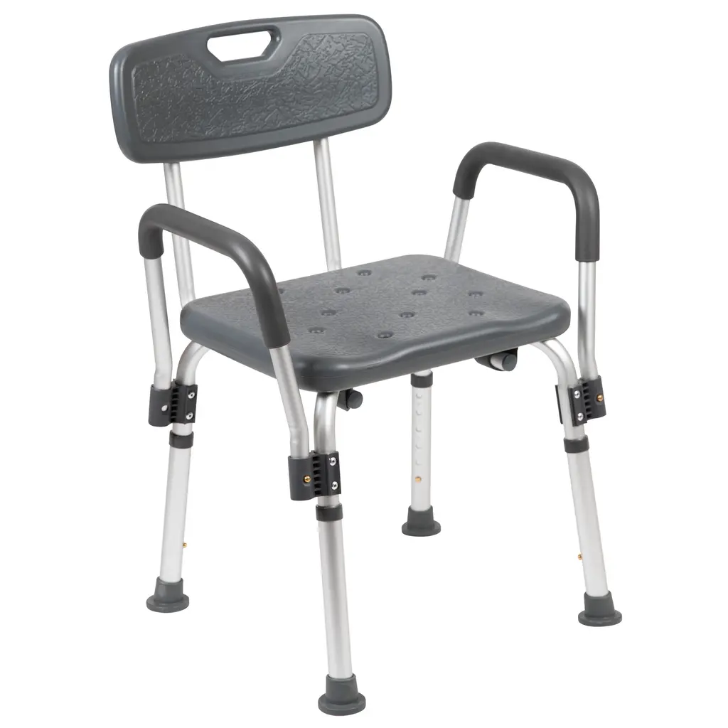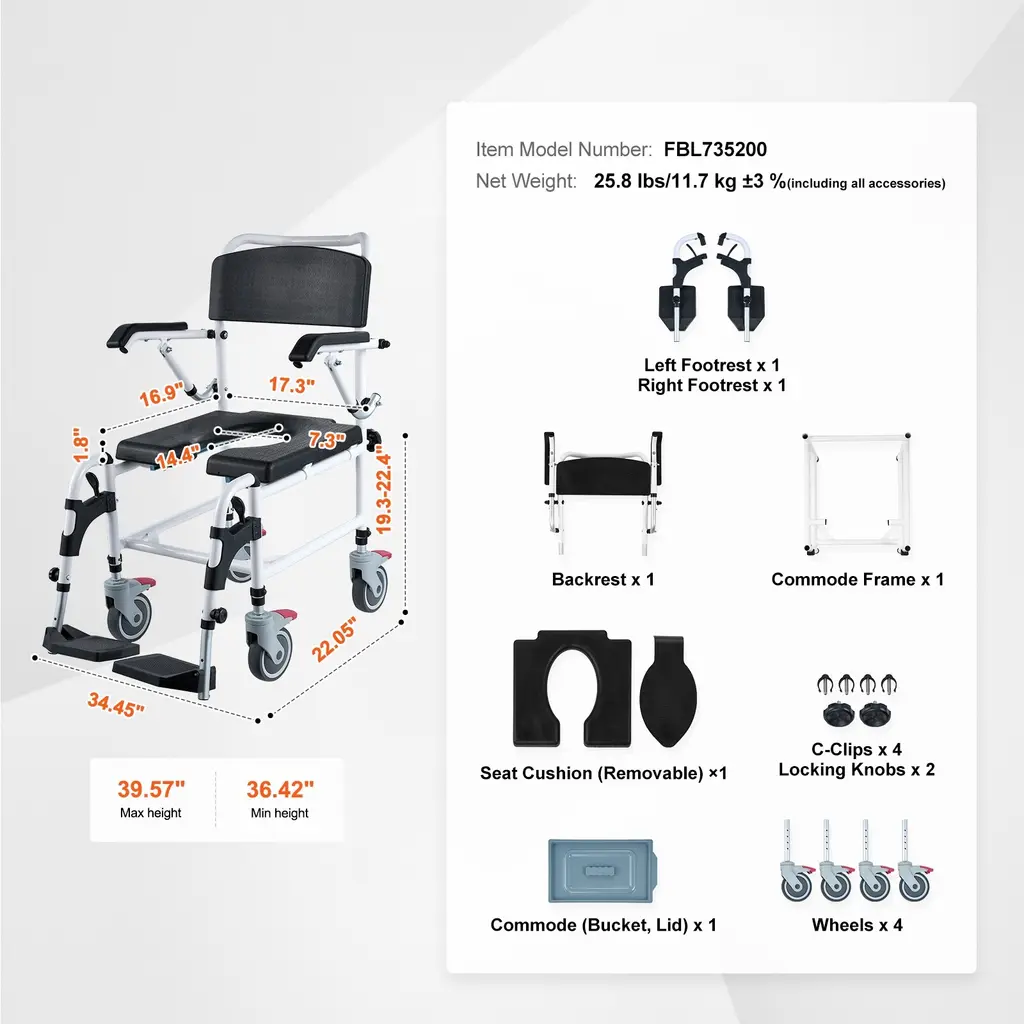 4-in-1 Commode Toilet: The seat of the commode wheelchair can be detached. It easily transforms into a shower chair, toilet chair, indoor potty chair, and wheelchair, accommodating diverse needs. The flip-up armrests and footrests make the shower chair convenient for users to transfer and sit comfortably on. These features also provide adaptability to diverse needs. 350 LBS Capacity & Robust Aluminum Construction: Our bedside commode shower wheelchair is crafted from rust-proof aluminum with a 1.3mm wall thickness, ensuring durability and reliability. Tool-free assembly, reinforced by C-clamps for added stability, ensuring resistance to deformation and bending over time. 5" Medical Universal Wheels: These 5-inch medical PU silent wheels with 360° rotation and foot brakes ensure effortless maneuverability and secure positioning on various surfaces. They also provide a bump-free ride and easy relocation. 3-Level Adjustable Height: The commode chair provides three height settings (19.3-22.4 inch/ 490-570 mm) without requiring tools. It is ideal for the elderly, pregnant women, individuals with disabilities, and post-surgery recovery, providing personalized comfort. User-friendly Design: This bathroom wheelchair comes with a 5-liter commode bucket with a lid to control odor and maintain hygiene during overnight use. The PE material used in its construction makes cleaning easy. The wheelchair also features a spacious PU backrest that provides comfortable support, and it can be easily disassembled for better convenience and to create more space. Package Content 1 x Commode Chair 1 x Manual