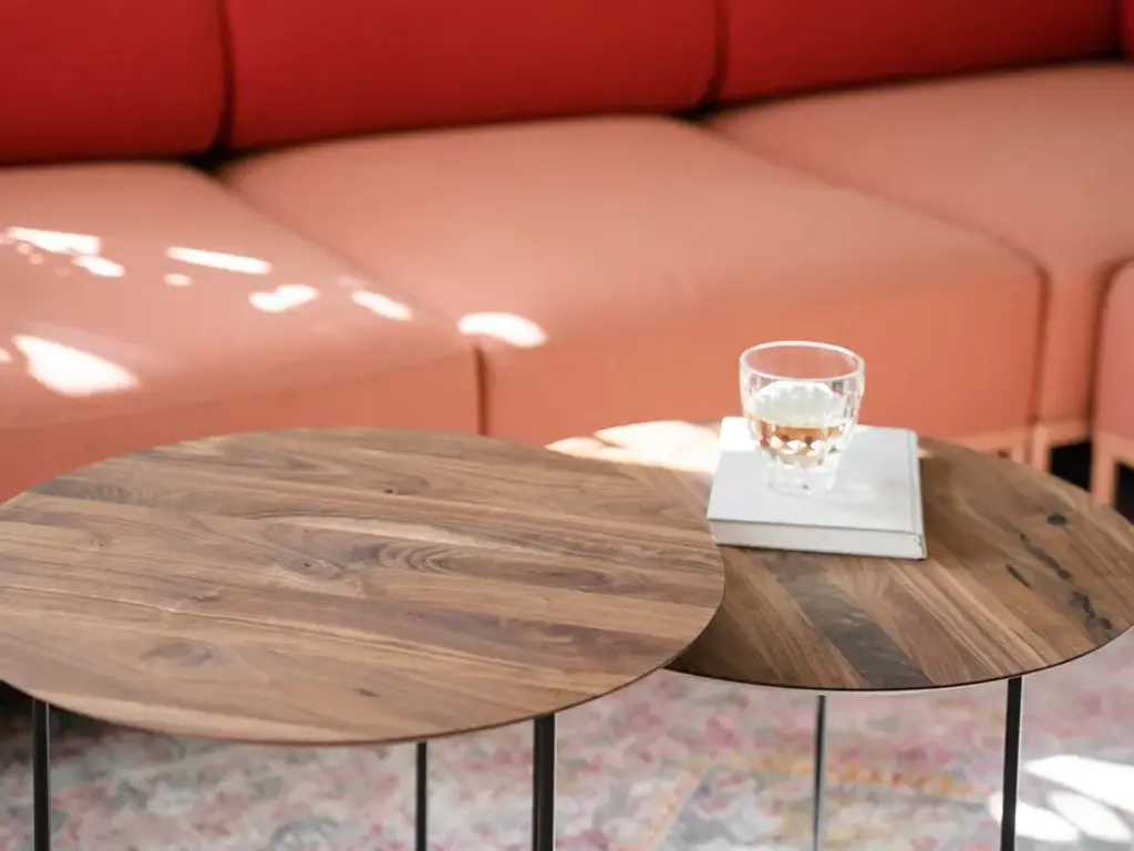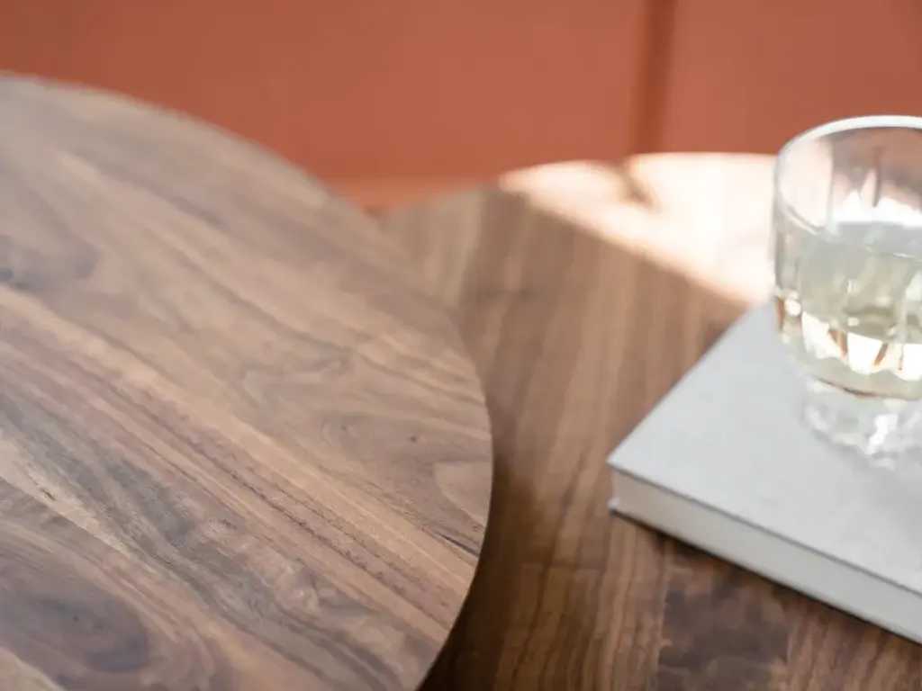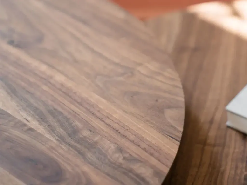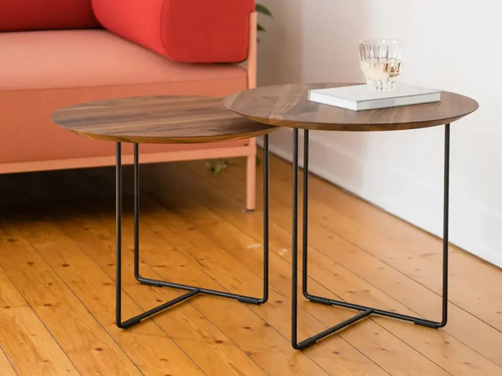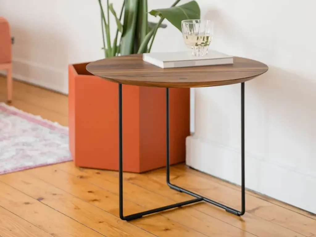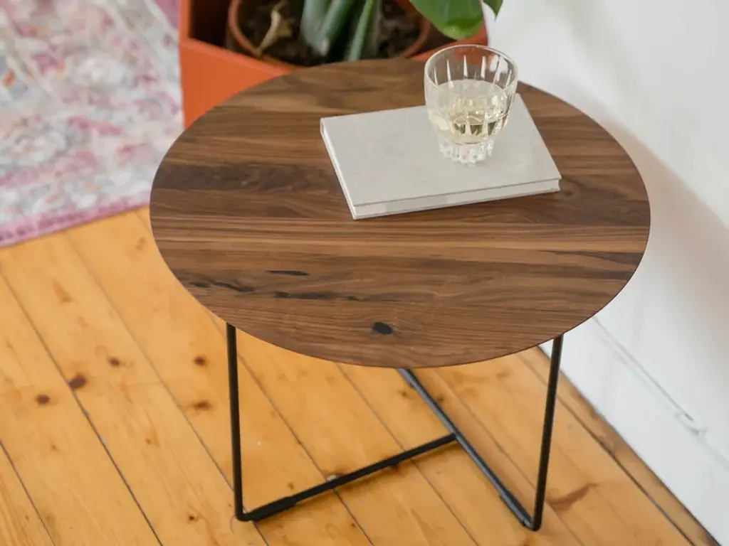 The silky matte tabletop is what makes the handy SIDETABLE OAK #01 BLACK side table from weld & co so distinctive. Made from solid oiled walnut wood, the round top of the coffee table is joined to u-shaped legs of powder-coated tubular steel. The edge of the tabletop is crafted in such a way as to give the entire top a remarkably graceful appearance, in perfect harmony with its slender base. And despite its small size and delicate looks, the SIDETABLE OAK #01 BLACK side table is versatile enough to add a stylish touch no matter where you put it.The SIDETABLE OAK #01 BLACK side table from weld & co is heavy enough for stability, even when standing on thick rugs and high-pile carpets, while still light enough for flexible placement. This means you can use in a cozy corner of the living room next to the couch and armchairs, as a practical place to set things in the hall, or as a nightstand in the bedroom – not to mention in places like lobbies, reception areas, waiting rooms, offices, or meeting rooms. The winning design of the table emphasizes both form and function, whether it is used alone or nested with another table.The SIDETABLE OAK #01 BLACK side table has a diameter of 50 cm and is available in two different heights: Size M is 45 cm high, while size S is slightly lower at 40 cm. This means the two sizes are ideal as nesting tables. An eye-catching arrangement can also be created by pairing the SIDETABLE OAK #01 BLACK side table with the metal side tables from the weld & co Solid & Grid collection.Material: Oiled wallnut, round iron bars with powder coatingWalnut will win you over with its nuanced shades of brown, which can range from light to dark, and the silky shimmer of its surface. The Walnut collection from weld & co showcases the special qualities of this premium wood. The warm tones of the wood used in our furniture and home accessories can complement the decor of a room or provide an attractive highlight. Black metal elements provide a distinctive contrast between wood and steel.