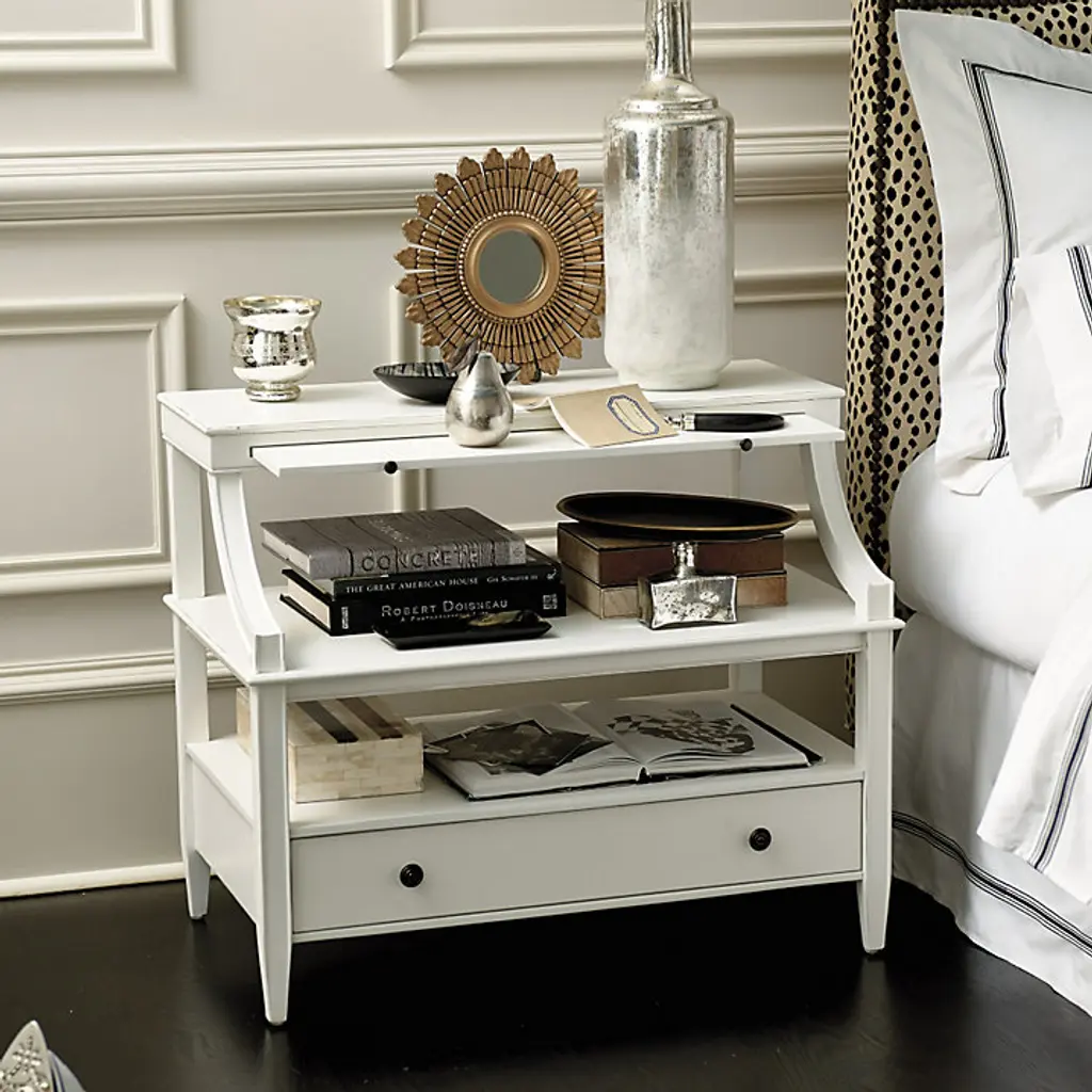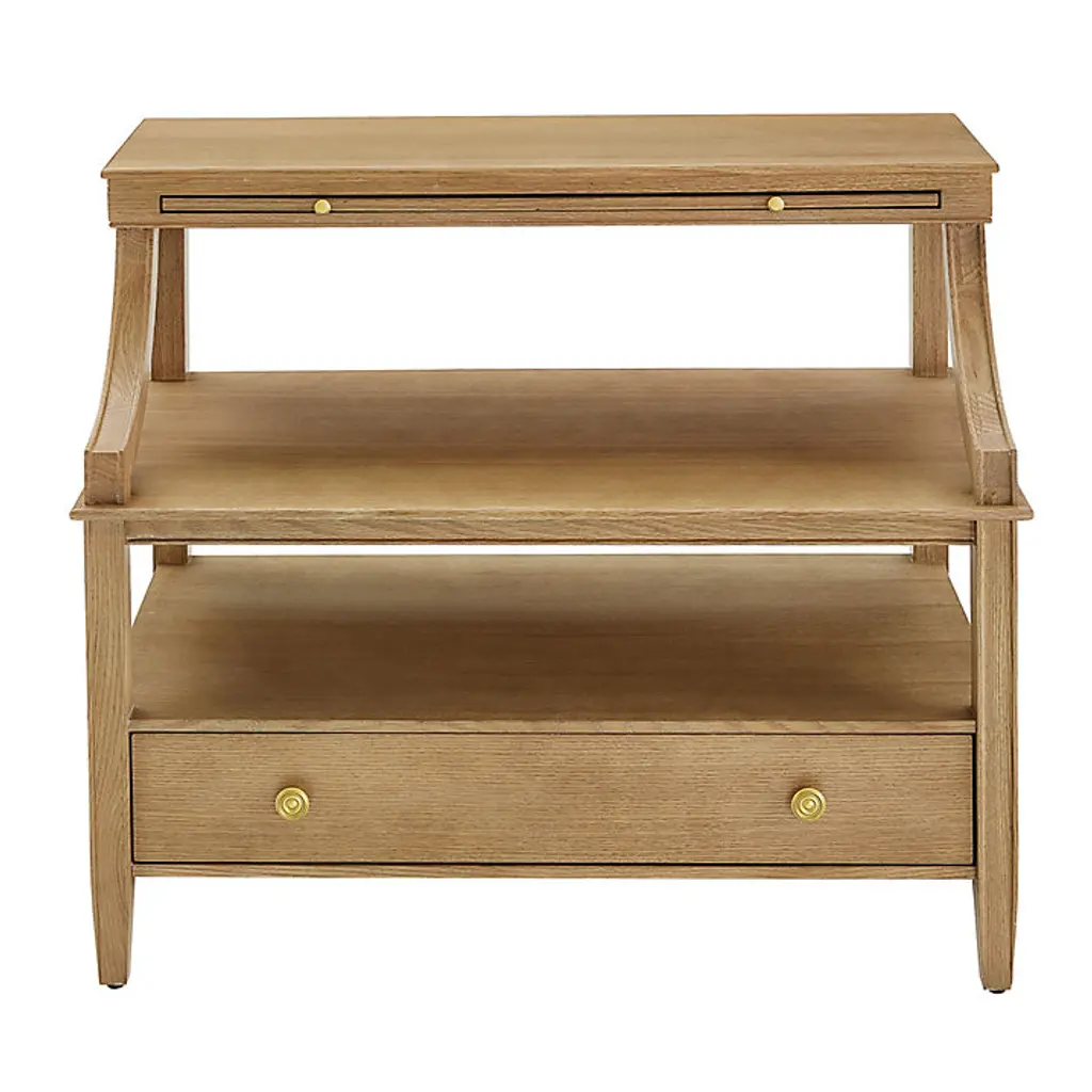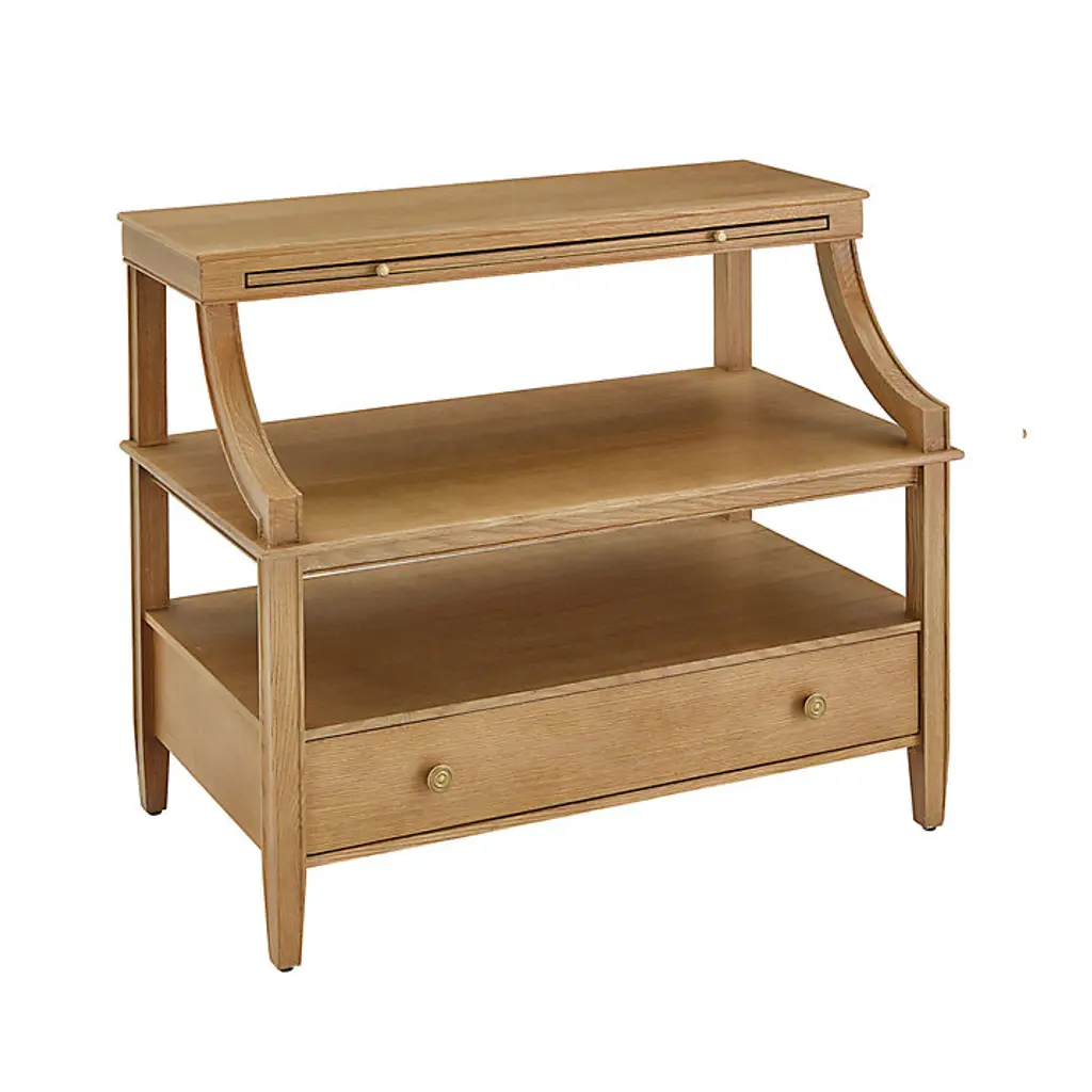 With its stepped-back shelves and drawer beneath, our Sidney Open 1-Drawer Nightstand gives you the best of both worlds display and storage in one graceful silhouette. A shelf hidden beneath the top pulls out to hold a drink or book. Drawer below is stained inside to bring out the wood's rich natural grain. Sidney Open 1-Drawer Nightstand features: