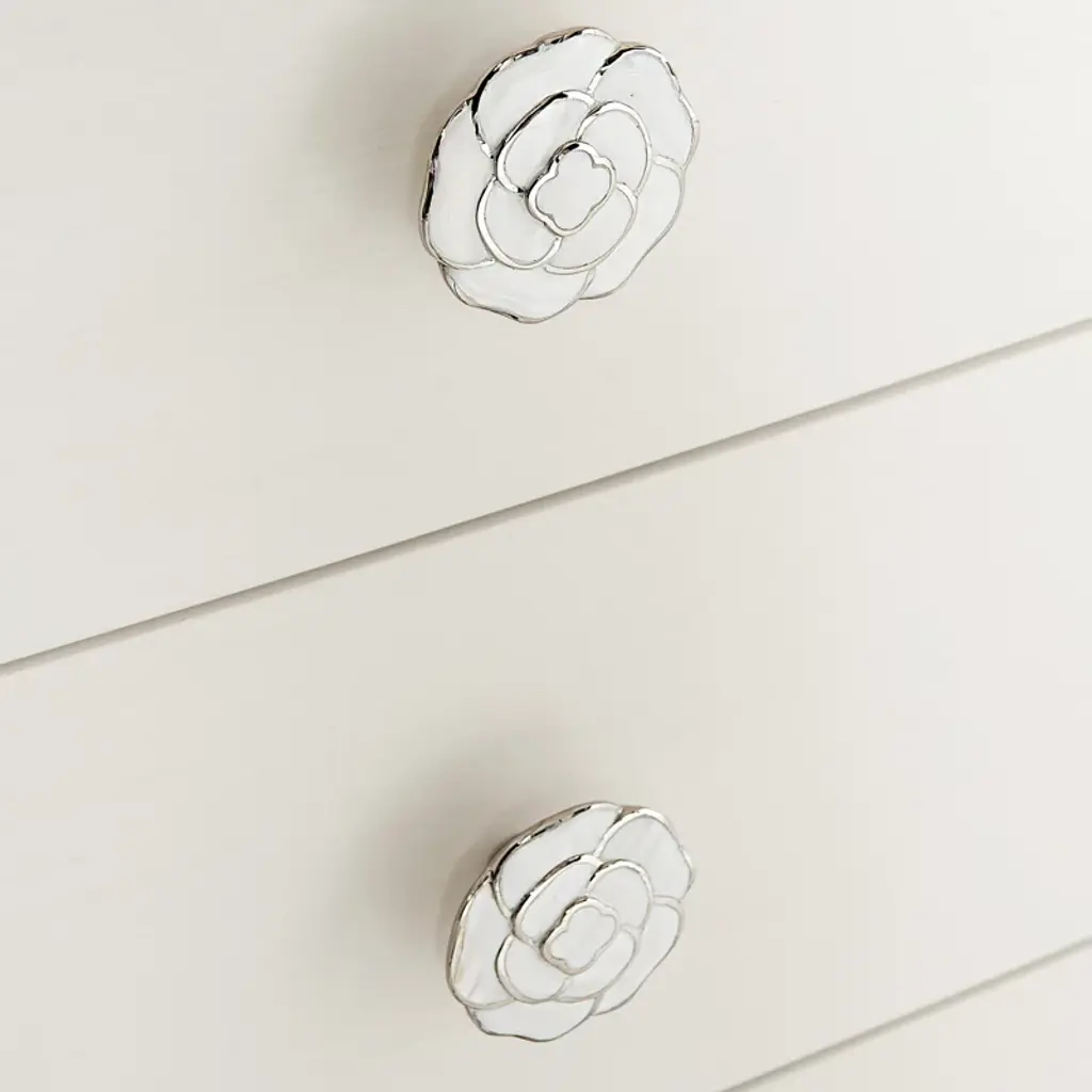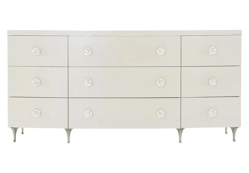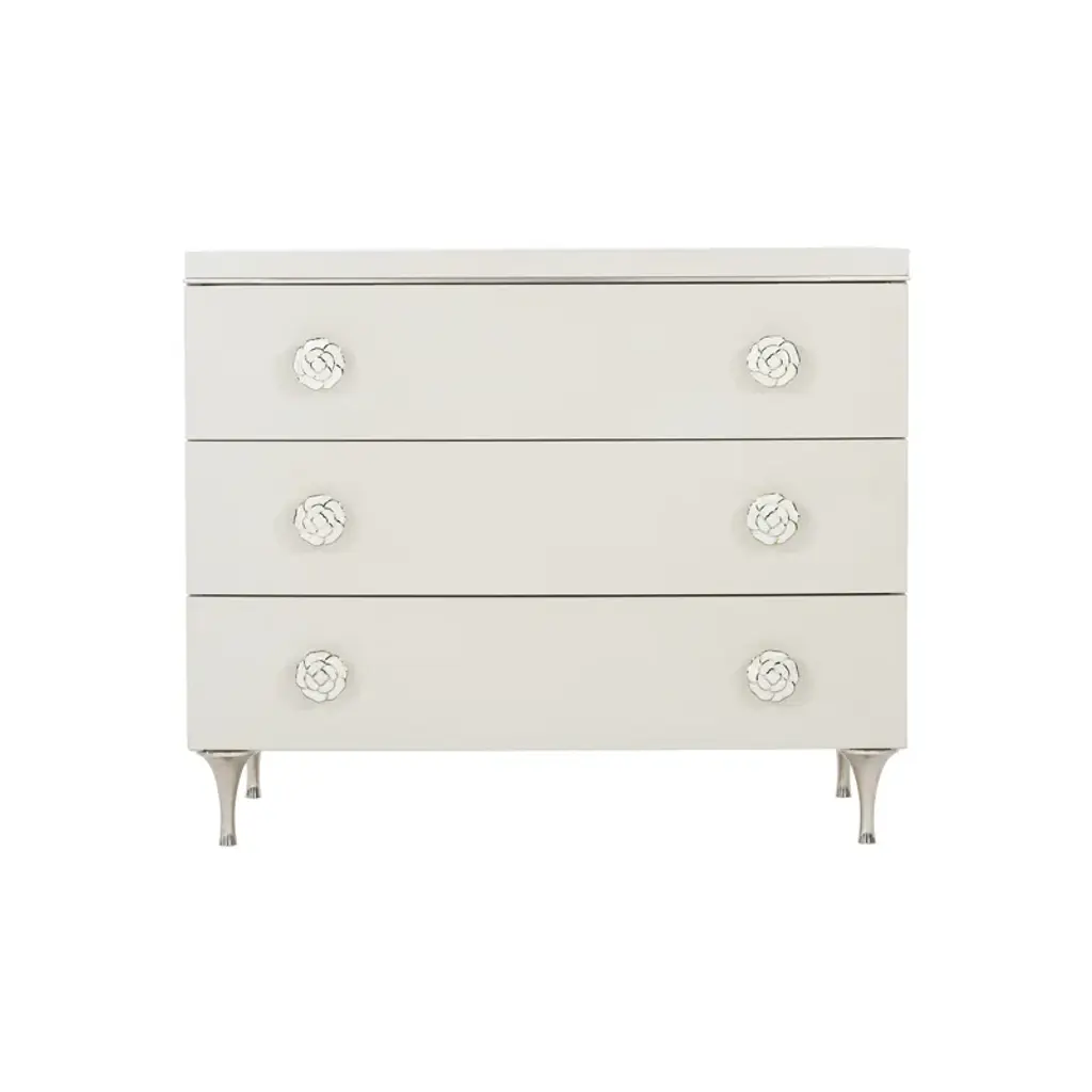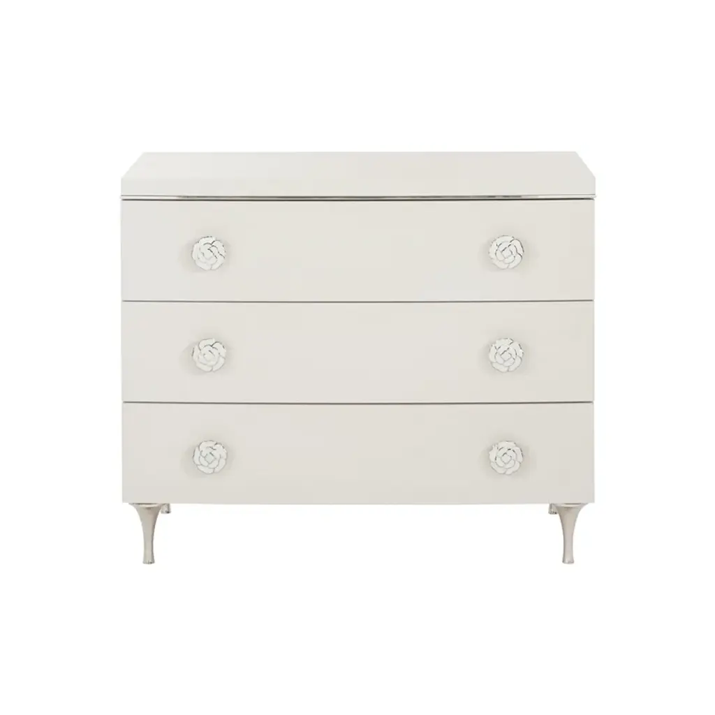 Oversized floral pulls featuring inlaid Kabebe shells add feminine allure to the minimalist design of this glamorous nightstand.