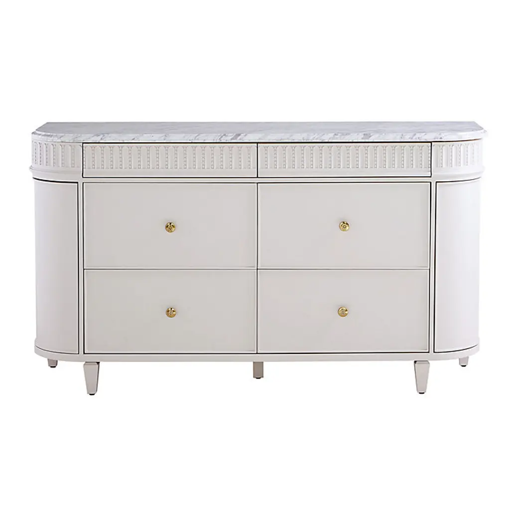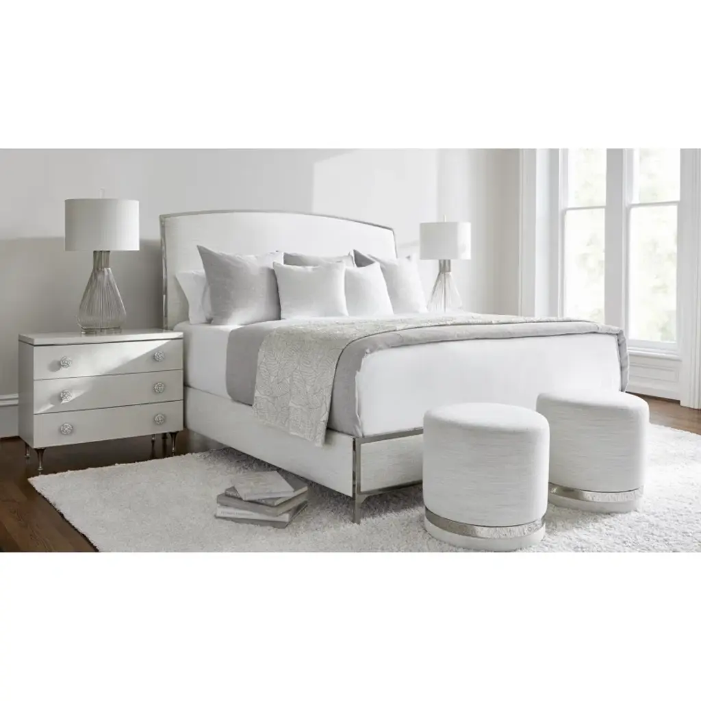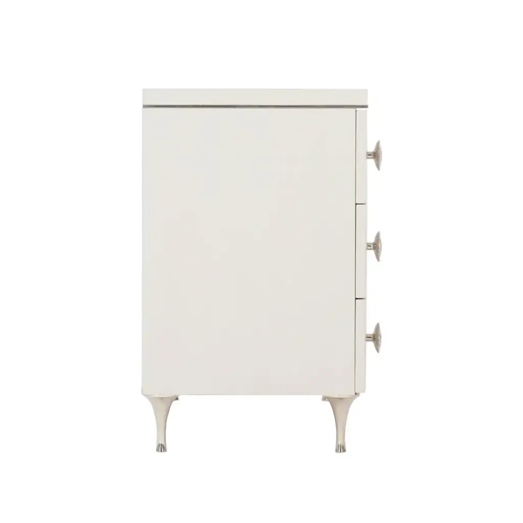Oversized floral pulls featuring inlaid Kabebe shells add feminine allure to the minimalist design of this glamorous nightstand.