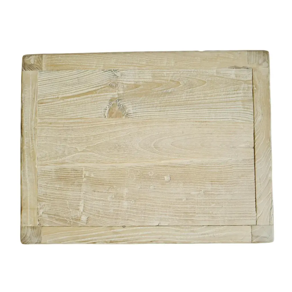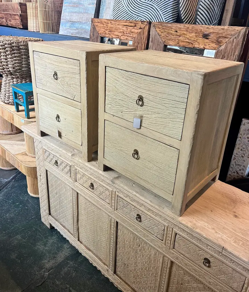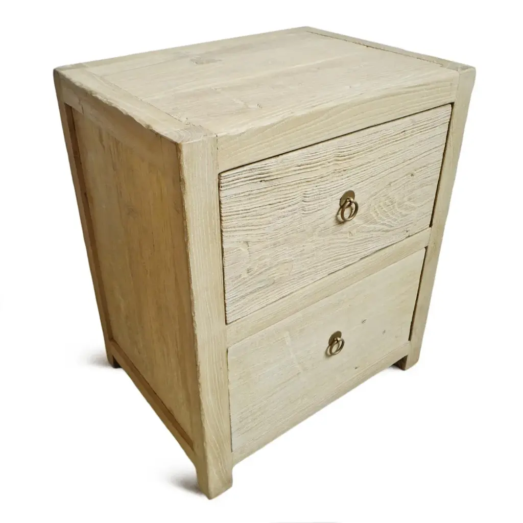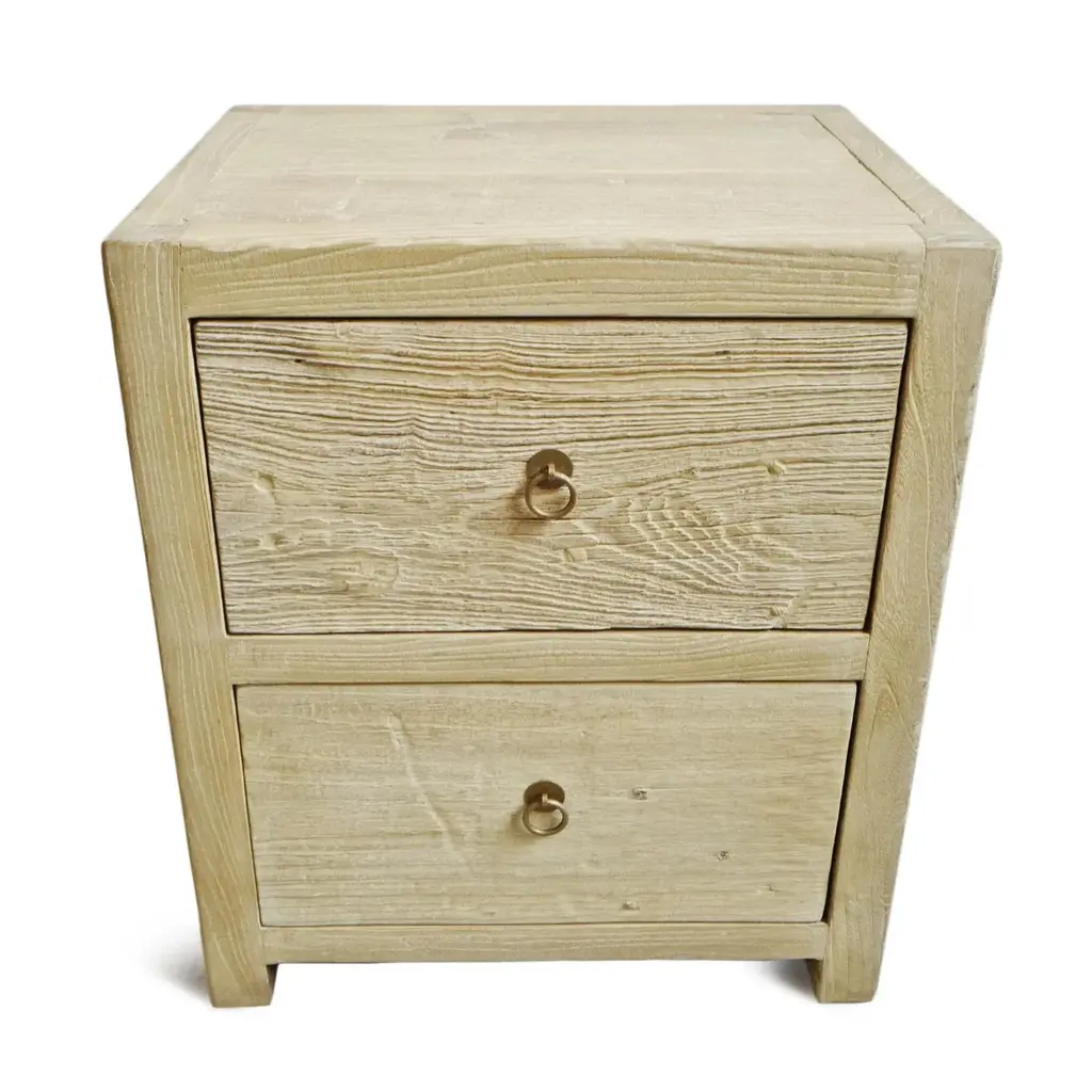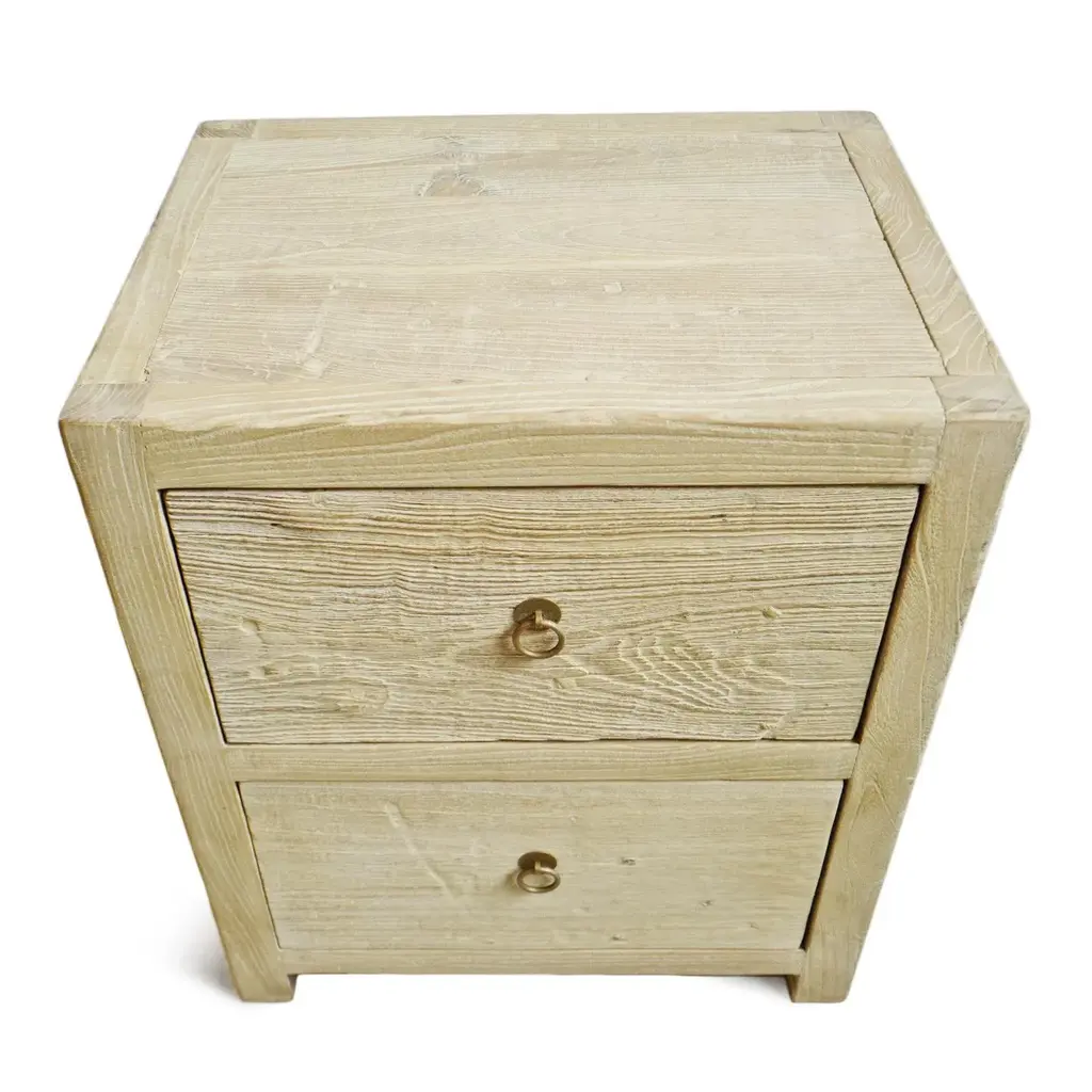 Simple modern rustic farmhouse style elm bedside cabinet with two drawers. Natural wood with beautiful deep grain. Brass finish ring pulls on drawers. Each cabinet will have variations in natural wood tones, grain, and inherent imperfections.