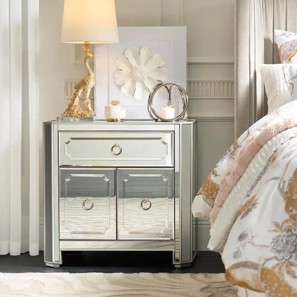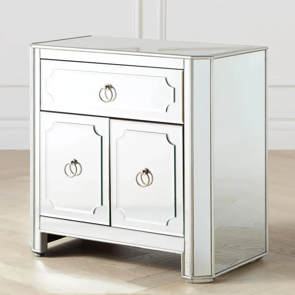 Designed with clean lines and beveled mirror paneling, our Simplicity Collection delivers shimmering style to the bedroom. Hand-applied silver-leaf trim and polished nickel hardware finish off the glamorous look.Exclusive to Z Gallerie.