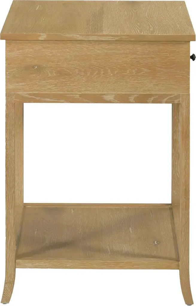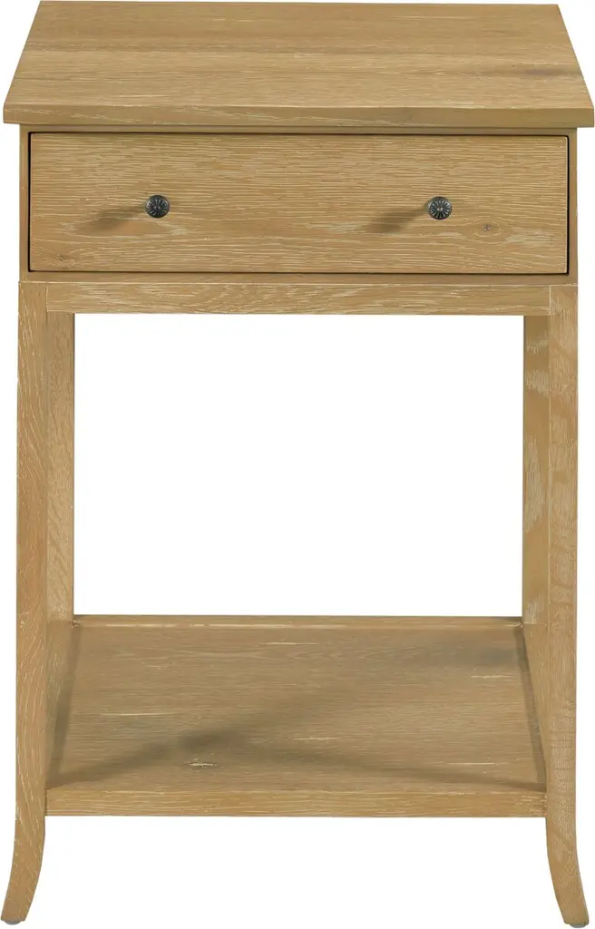 Inspired by 19th-century European designs, this side table is crafted of oak, a hardwood prized for both its durability and its distinctive grain, which the limewash finish shows off beautifully. Along with a drawer, the table has a shelf for additional storage or display space. The gracefully flared legs speak to the attention to detail lavished on this nightstand, which can also serve as an occasional table.