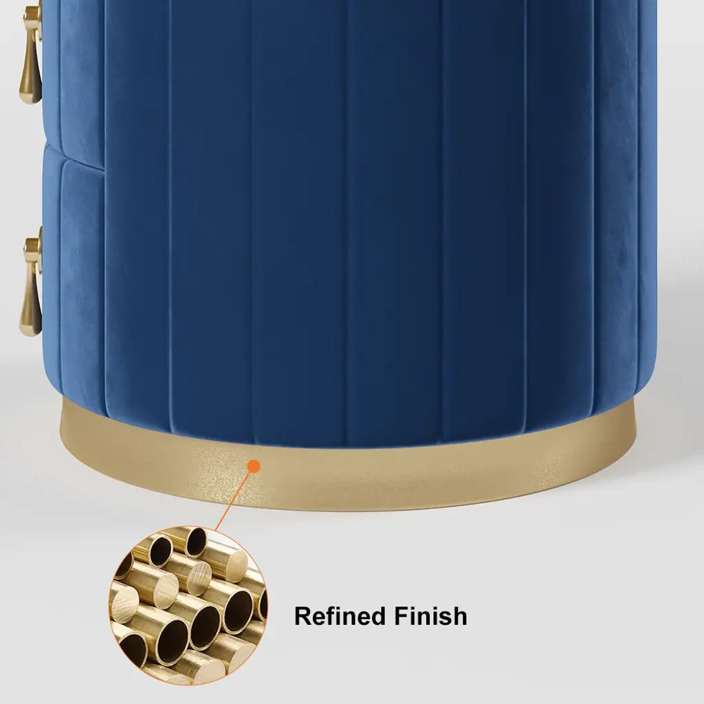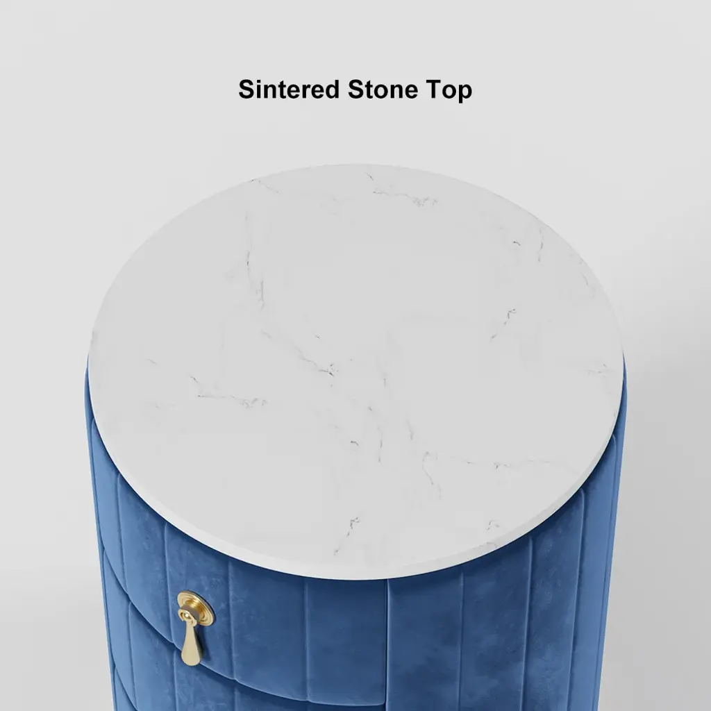 Enhance your bedroom with this elegant blue velvet nightstand featuring a round sintered stone top and three spacious drawers. The soft velvet upholstery adds a touch of luxury, while the sturdy metal base ensures durability. Perfect for storing bedside essentials and adding a chic accent to your space.