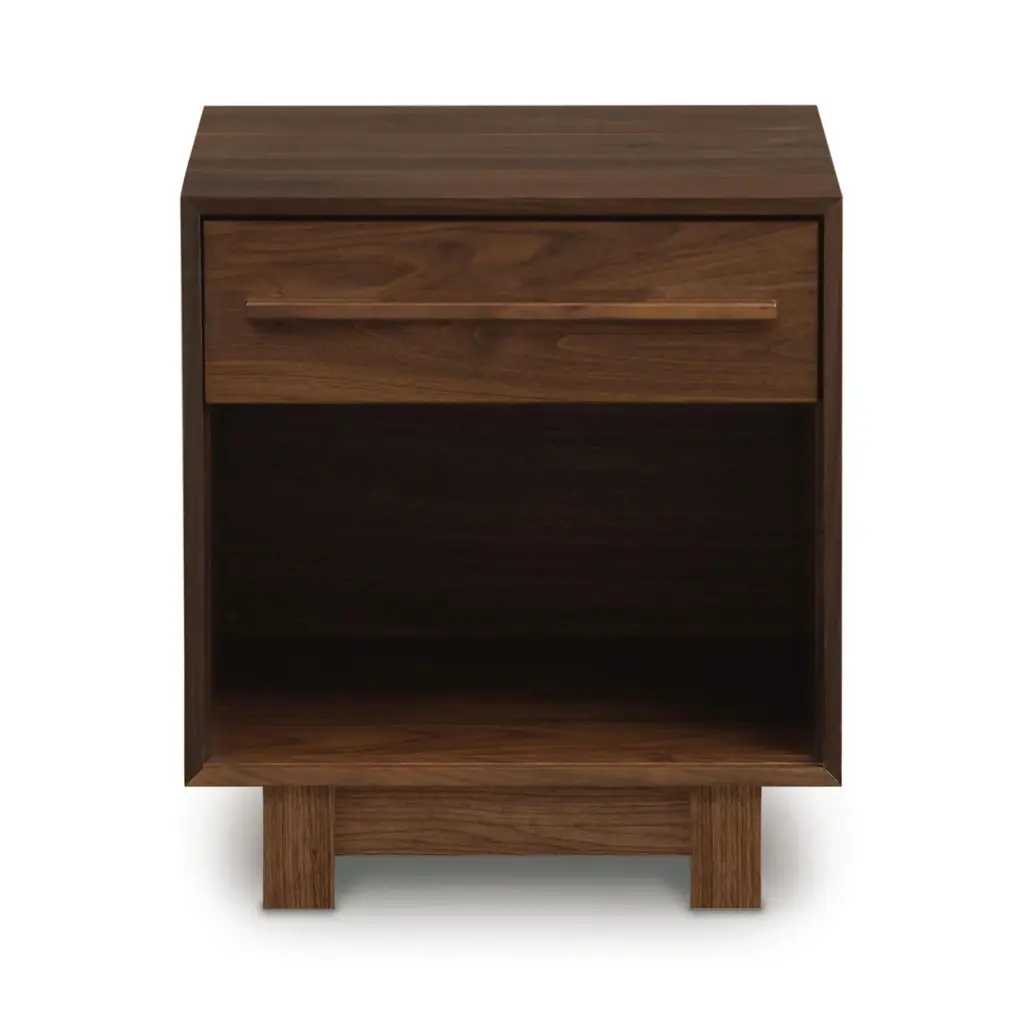Complete your master bedroom or guest bedroom set with the Sloane 1 Drawer Nightstand by Copeland Furniture. This modern nightstand is made from handcrafted solid oak wood and features one drawer and one open shelf area to hold all of your nighttime essentials. The natural grain and variations in the wood make this night table one-of-a-kind and the hand-applied finish protects the piece from heat and moisture damage. Features