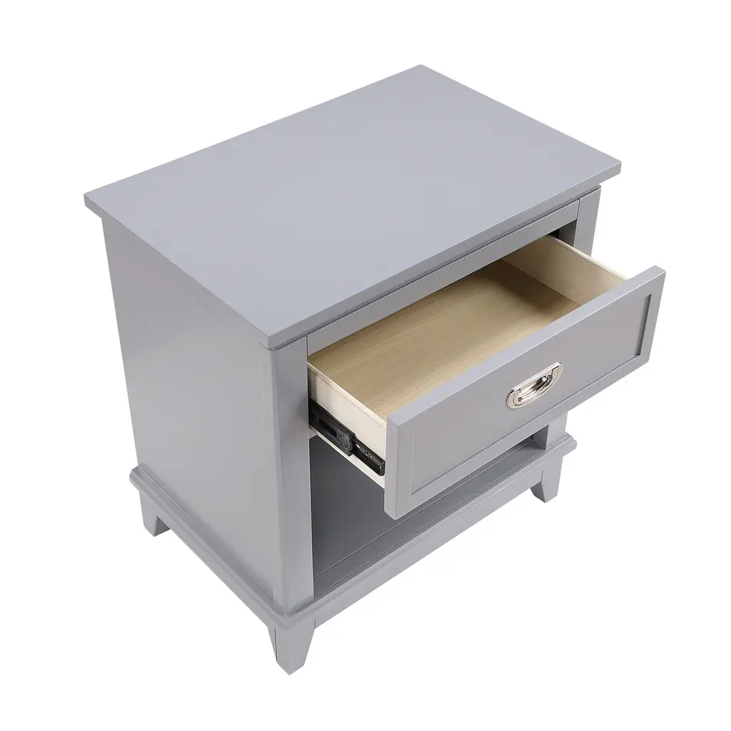 Add style and storage to your bedroom with this nightstand from the Sloane collection. The drawer on the nightstand is constructed with dovetail joints, features smooth ball bearing glides for easy access, and polished nickel hardware to match the other pieces in the collection. The storage cubby under the drawer is the ideal place for items you want in reach.