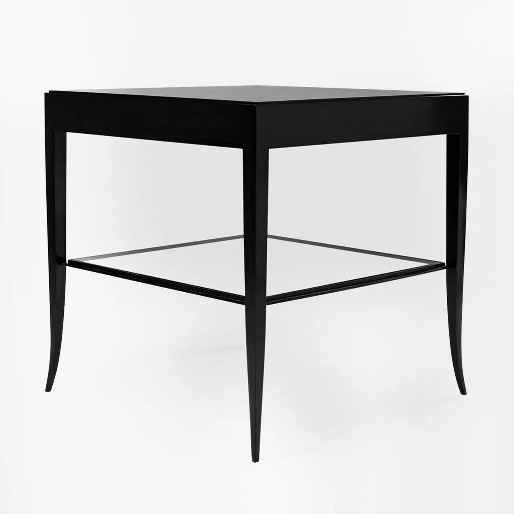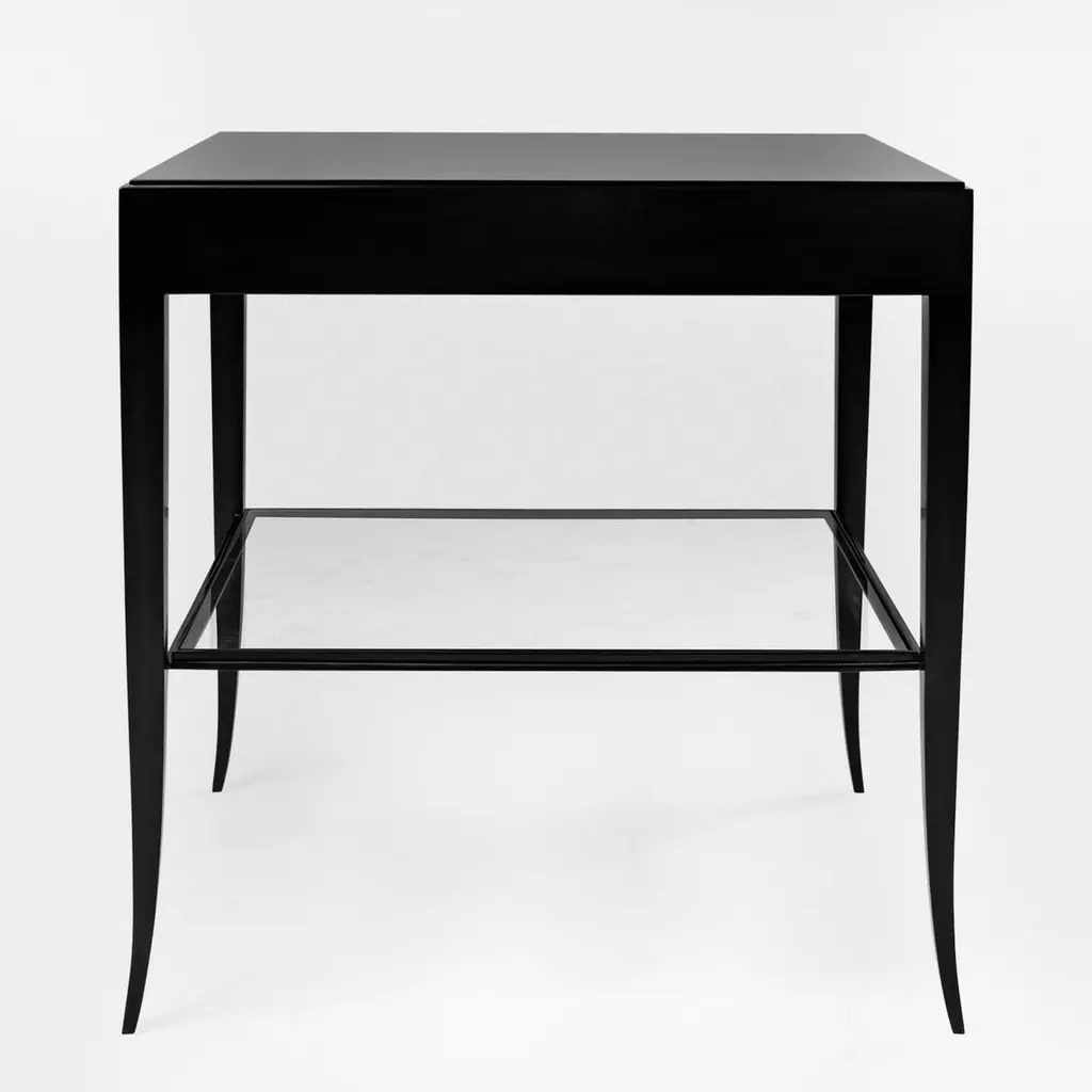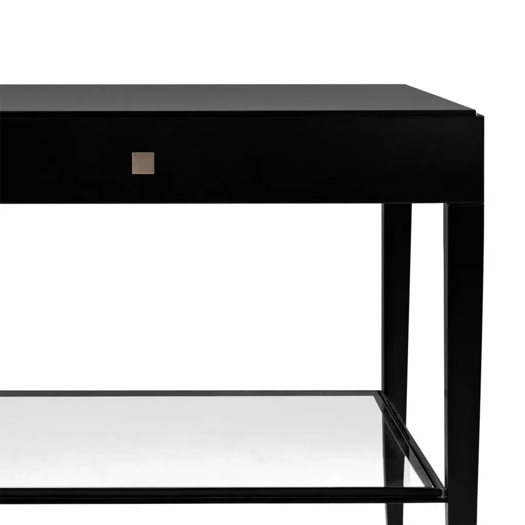 Nightstand or side table sober with handcraftedsolid mahogany wood structure in black satinatedfinish. With 1 drawer and with 1 tempered clear glasstop at the bottom with forged iron frame.Also available in ivory lacquered, white lacquered,or natural tobacco finish.