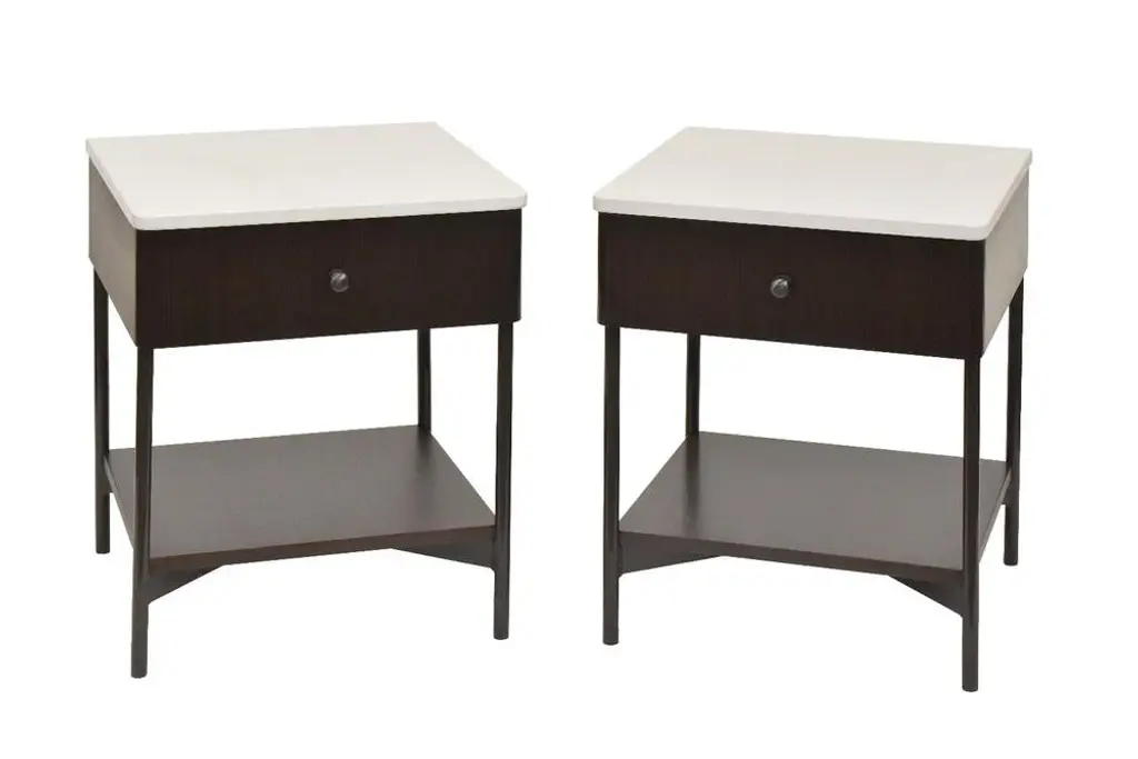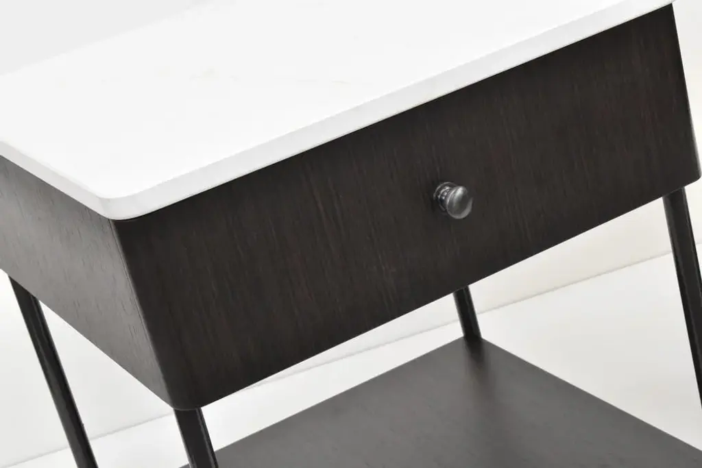 Beautiful material combination & perfectly made - powder coated metal frame with engineered walnut box top housing a dovetailed birch ply drawer box with a white quartz top Labeled by Maker