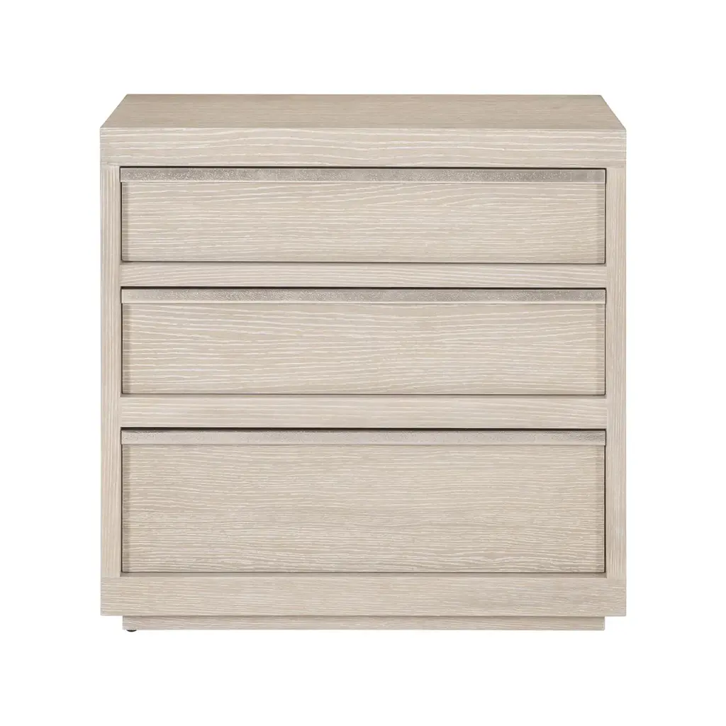 Subtlety defines the Solaria nightstand, crafted from ash solids and quartered white oak veneers in a Dune finish. At first glance, it appears to be an all-wood design, but the quiet sheen of the metal finger pulls draws the eye and defines the form. Three drawers create essential storage, and a two-port USB charger is found on the back panel of the case. Features