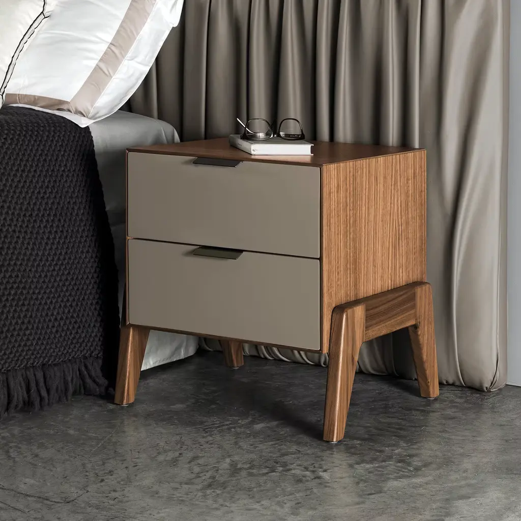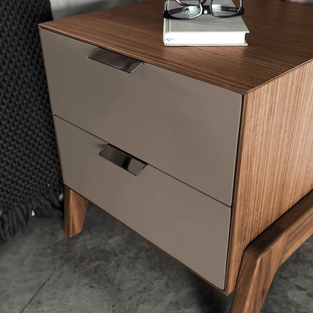 Offered in a variety of customizable finishes, this modern and elegant nightstand is part of the Solferino Collection characterized by angled legs unconventionally mounted outside the structure that infuse a distinctive character. Enclosed in a Canaletto walnut wood frame, the two drawers have matt greige-lacquered front panels and chromed metal handles and feature a white open-pore ash veneered interior.