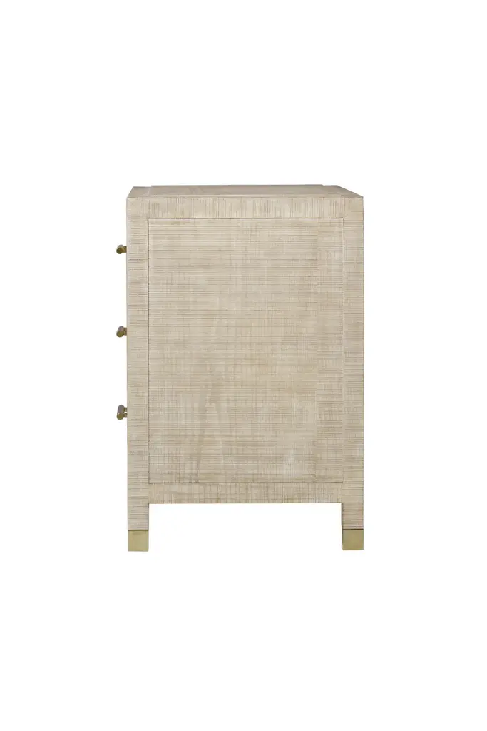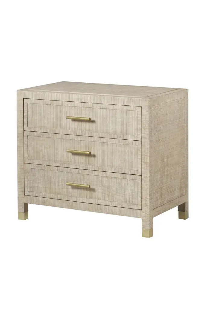 Create an air of sophistication in your bedroom with the Raffles nightstand by Andrew Martin, crafted from a textured multi-directional mix of ash solids and veneers that evoke the impression of rough woven linen. Complete with 3 drawers finished with elegant brass finish handles.