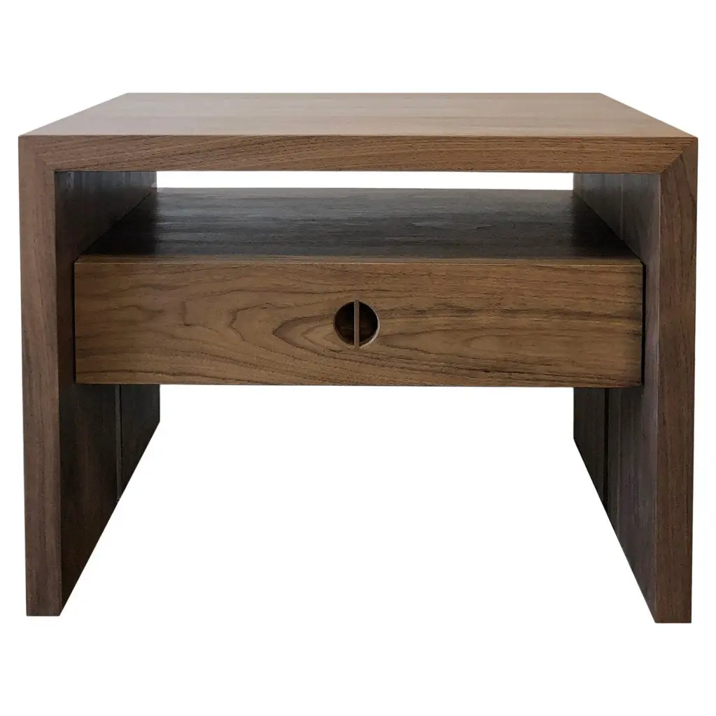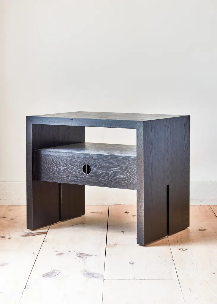 This custom wood nightstand is hand-made in the United States with all hardwood construction. Characterized by its striking waterfall design, unique split leg detail, and convenient and accessible storage drawer, the minimalist Jameson bedside table is distinguished with integrated hardware and a soft-closing drawer mechanism. This contemporary design looks beautiful in a modern rustic space or contemporary design with clean lines. This peice can be ordered in 4 finishes: Oak, Walnut, Ash and Ebonized.Jameson Collection by Lynnea Jean.Inspired by a 20th century primitive stool, the Jameson collection is the first furniture line from Lynnea Jean Interiors.Known for her laidback California aesthetic merged with classic silhouettes, Lynnea Jean is inspired by pieces lovingly passed down through generations. The custom furniture collection features luxurious clean lines and fine details, resulting a timeless aesthetic. Additionally, we only work with the finest, sustainably sourced materials. Dedicated craftspeople build each piece by hand with meticulous detailing in their downtown Los Angeles workshop.Lynnea Jean offers complete custom capabilities to the trade. To inquire, specify the dimensions, select the finish and consider adapting the design details. From where you create to where you dine to where you sleep, the Jameson collection is here to become a part of your everyday moments and your most cherished memories.