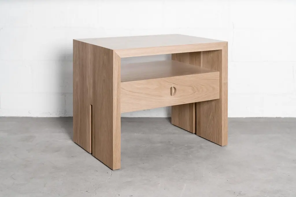 This custom wood nightstand is hand-made in the United States with all hardwood construction. Characterized by its striking waterfall design, unique split leg detail, and convenient and accessible storage drawer, the minimalist Jameson bedside table is distinguished with integrated hardware and a soft-closing drawer mechanism. This contemporary design looks beautiful in a modern rustic space or contemporary design with clean lines. This peice can be ordered in 4 finishes: Oak, Walnut, Ash and Ebonized.Jameson Collection by Lynnea Jean.Inspired by a 20th century primitive stool, the Jameson collection is the first furniture line from Lynnea Jean Interiors.Known for her laidback California aesthetic merged with classic silhouettes, Lynnea Jean is inspired by pieces lovingly passed down through generations. The custom furniture collection features luxurious clean lines and fine details, resulting a timeless aesthetic. Additionally, we only work with the finest, sustainably sourced materials. Dedicated craftspeople build each piece by hand with meticulous detailing in their downtown Los Angeles workshop.Lynnea Jean offers complete custom capabilities to the trade. To inquire, specify the dimensions, select the finish and consider adapting the design details. From where you create to where you dine to where you sleep, the Jameson collection is here to become a part of your everyday moments and your most cherished memories.