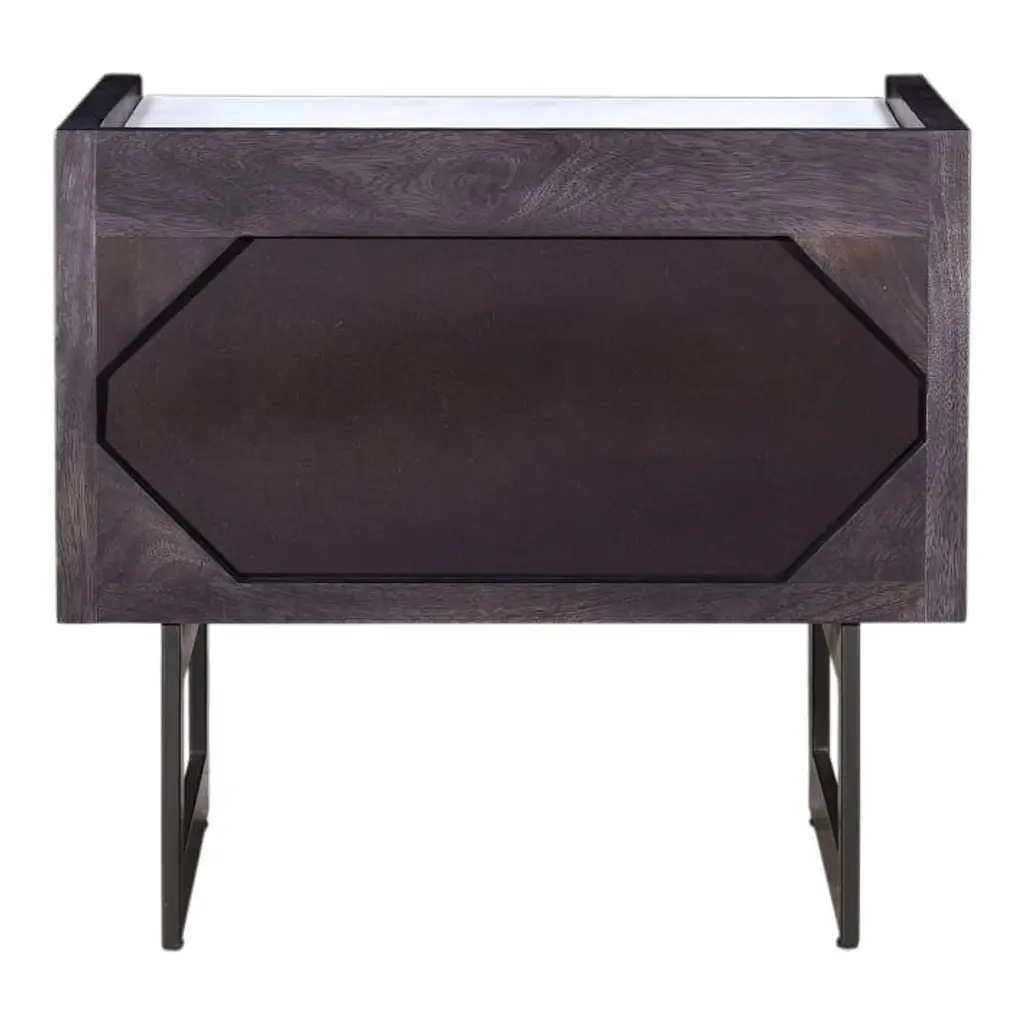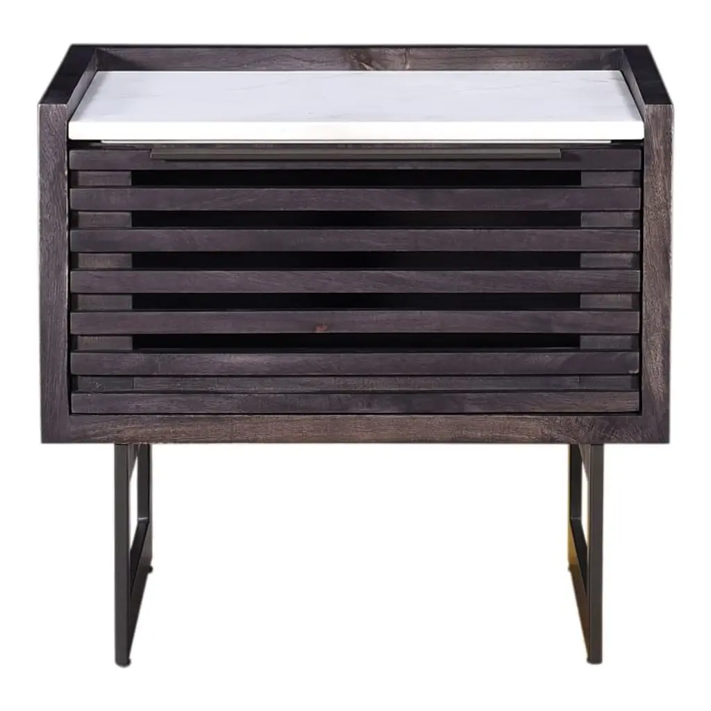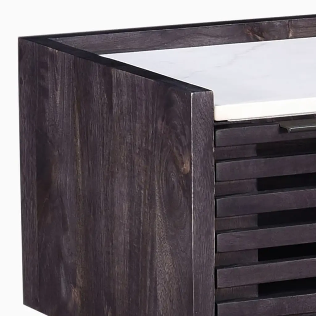Solid mango wood frame and drawer in a Charcoal finish. The mango wood used on this product is sustainably sourced from trees that no longer produce fruit. Iron legs in a Gray finish. Solid white marble top. 1 drawer opens on metal glides. Made in India.