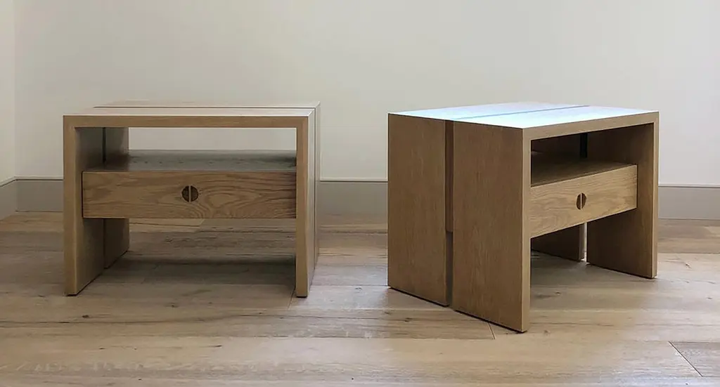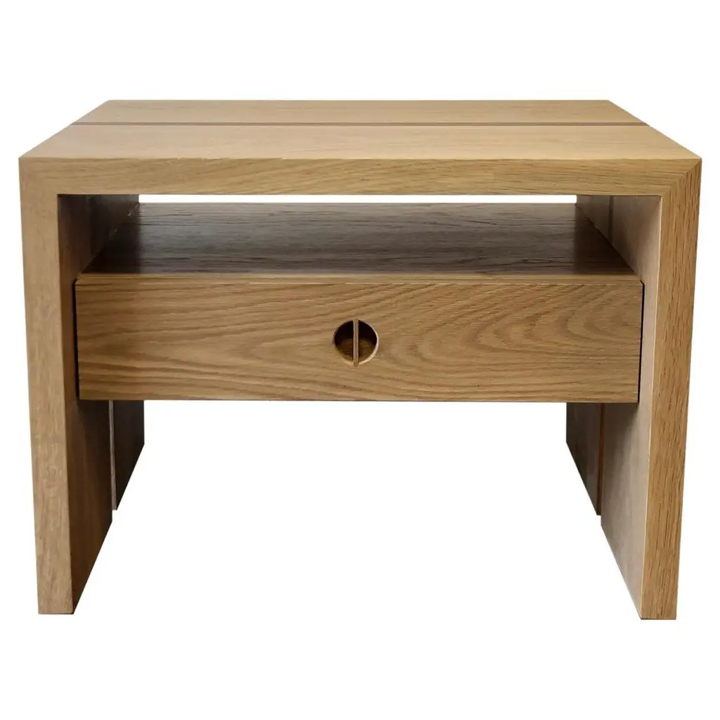 This custom nightstand with drawer is hand-made in the United States with all hardwood construction. Characterized by its striking waterfall design, unique split leg detail, and convenient and accessible storage drawer, the minimalist Jameson bedside table is distinguished with integrated hardware and a soft-closing drawer mechanism. This contemporary design looks beautiful in a modern rustic space or contemporary design with clean lines. This piece can be ordered in 4 finishes: Oak, Walnut, Ash and Matte Black. Jameson Collection by Lynnea Jean.Inspired by a 20th century primitive stool, the Jameson collection is the first furniture line from Lynnea Jean Interiors.Known for her laidback California aesthetic merged with classic silhouettes, Lynnea Jean is inspired by pieces lovingly passed down through generations. The custom furniture collection features luxurious clean lines and fine details, resulting a timeless aesthetic. Additionally, we only work with the finest, sustainably sourced materials. Dedicated craftspeople build each piece by hand with meticulous detailing in their downtown Los Angeles workshop.Lynnea Jean offers complete custom capabilities to the trade. To inquire, specify the dimensions, select the finish and consider adapting the design details. From where you create to where you dine to where you sleep, the Jameson collection is here to become a part of your everyday moments and your most cherished memories.