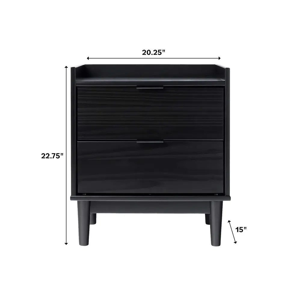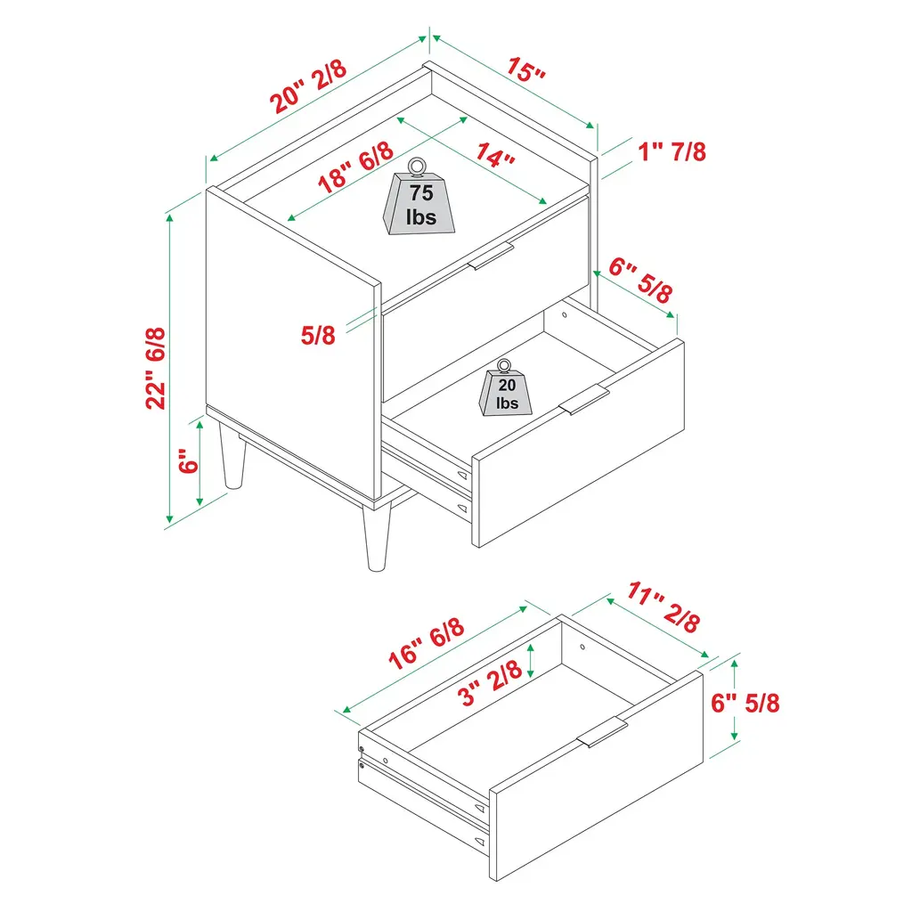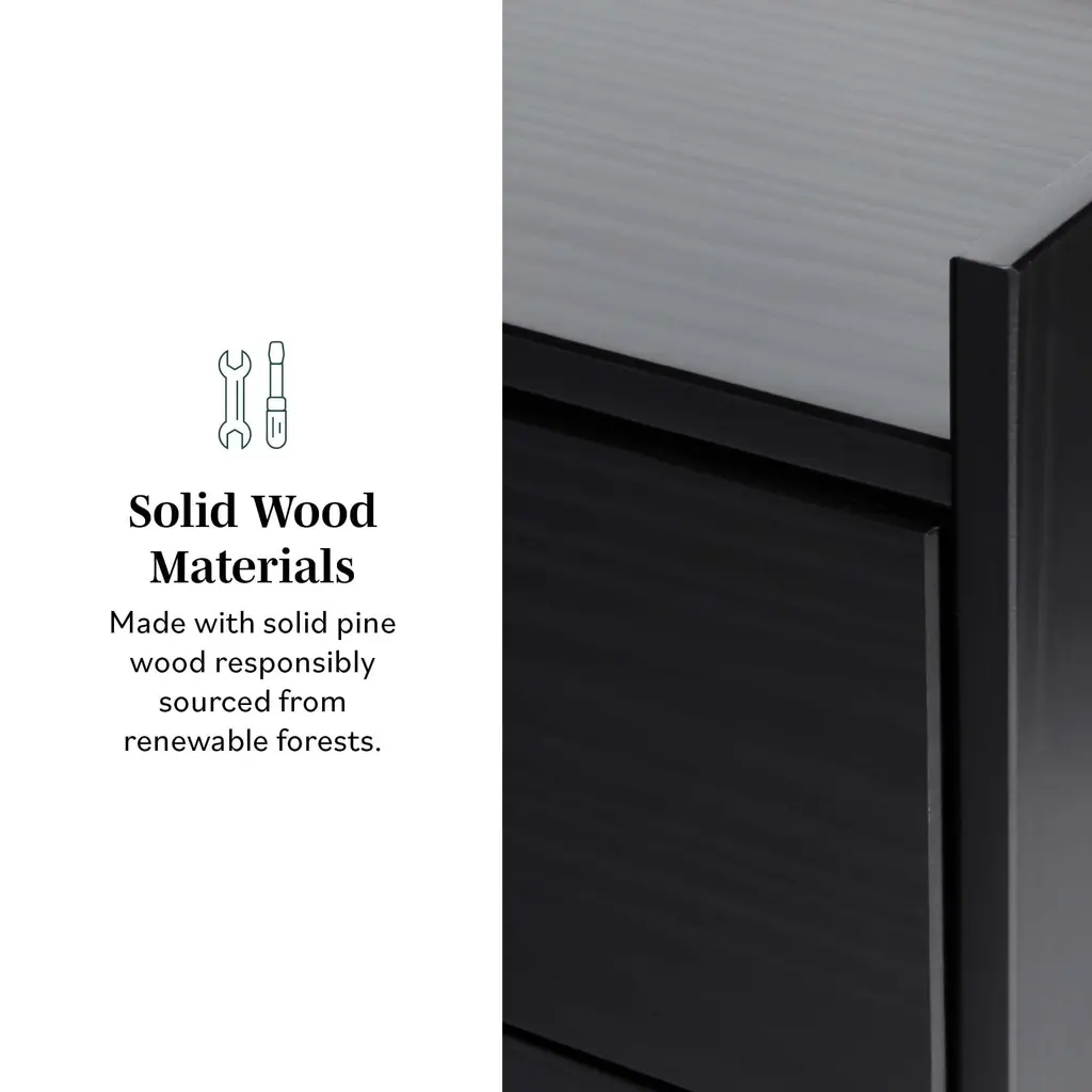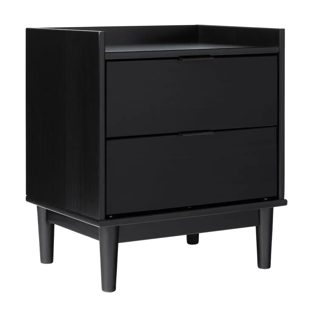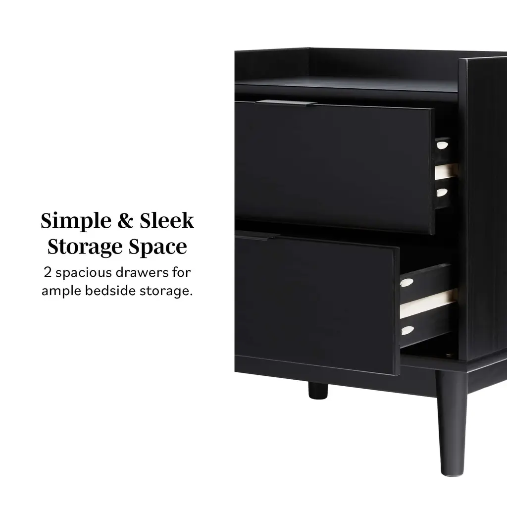 Upgrade your bedroom with this nightstand that includes two drawers on smooth glides for easy access. Constructed from solid pine wood and powder-coated steel, it offers durability and sustainable materials. Appreciate the sleek, streamlined hardware and the ultra-modern gallery top for added style. Blend this minimal design effortlessly with any interior style.